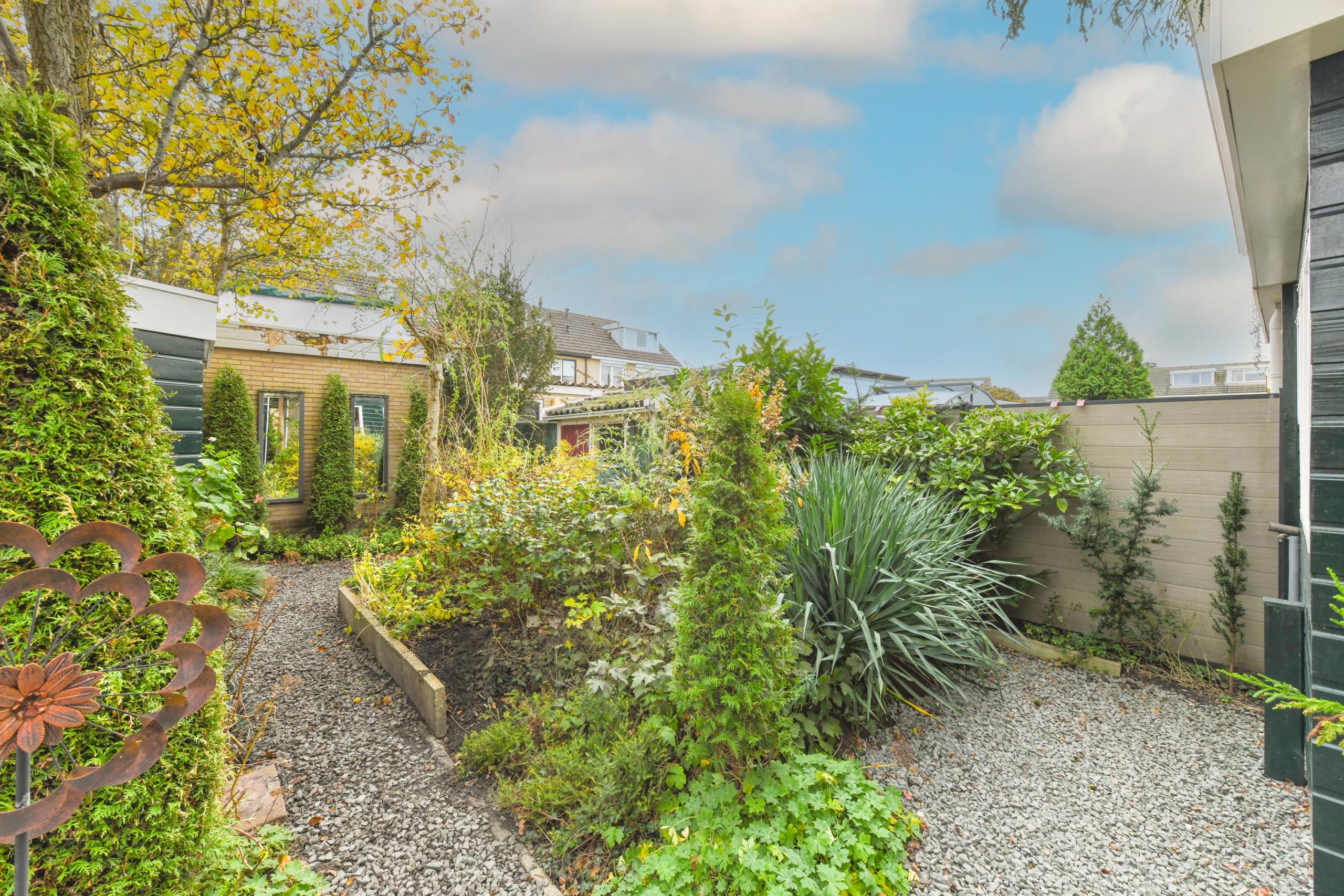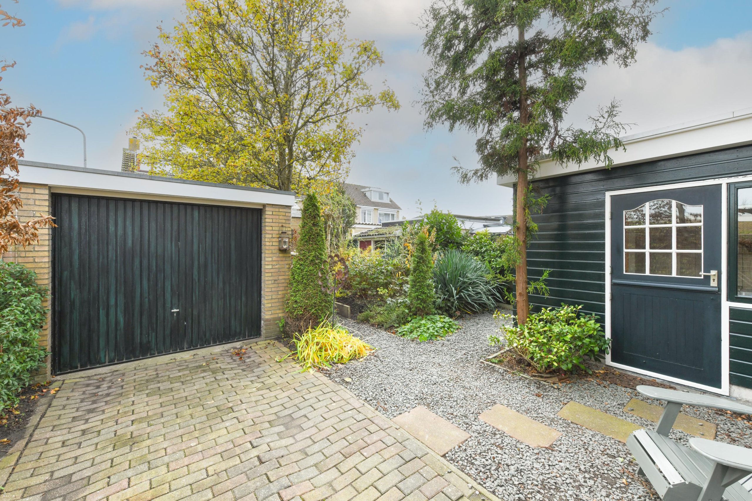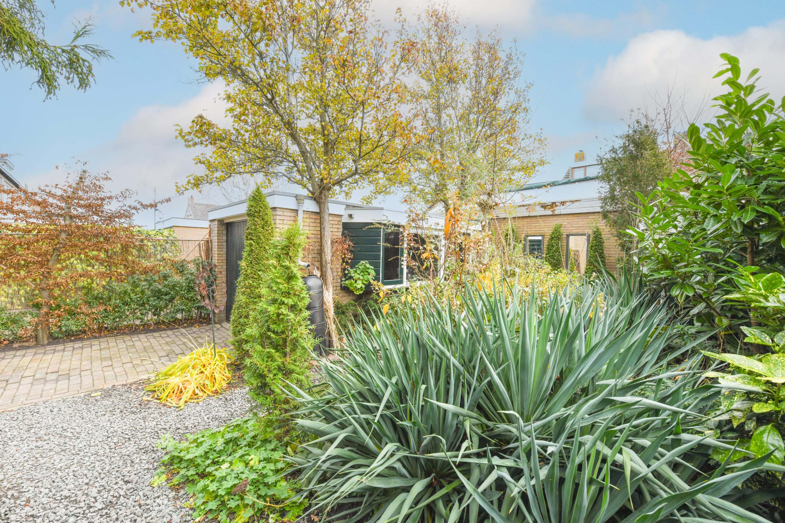De zonnige achtertuin op het zuidoosten is groen en speels aangelegd. Achterin staat de garage met elektra, voorzien van een praktische erker met werkbank — ideaal voor hobby’s of klussen. Daarnaast is er nog een vrijstaande berging, perfect voor tuingereedschap en opslag.