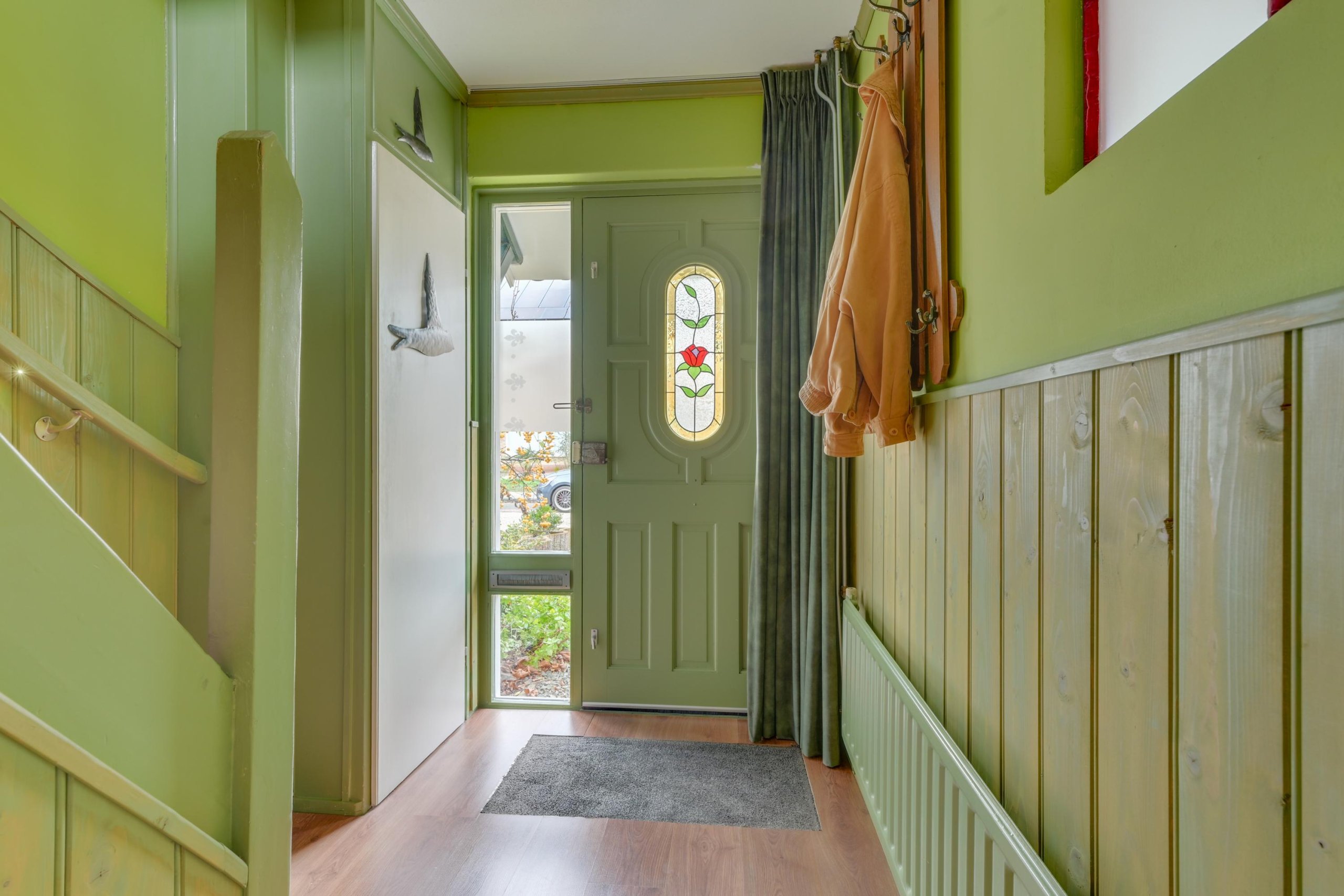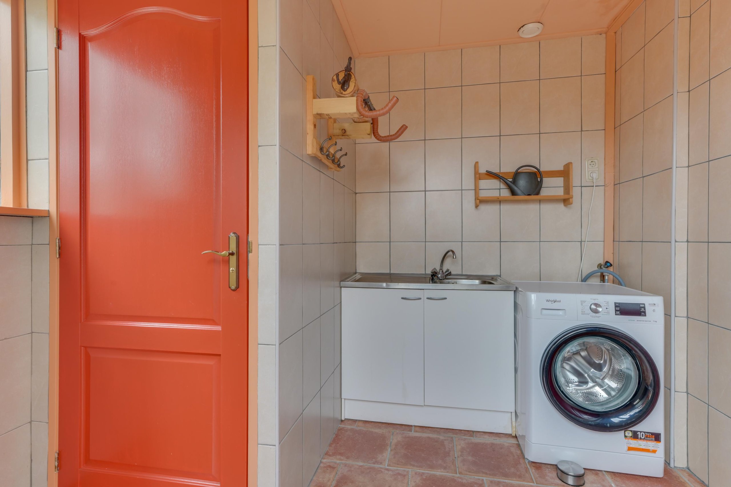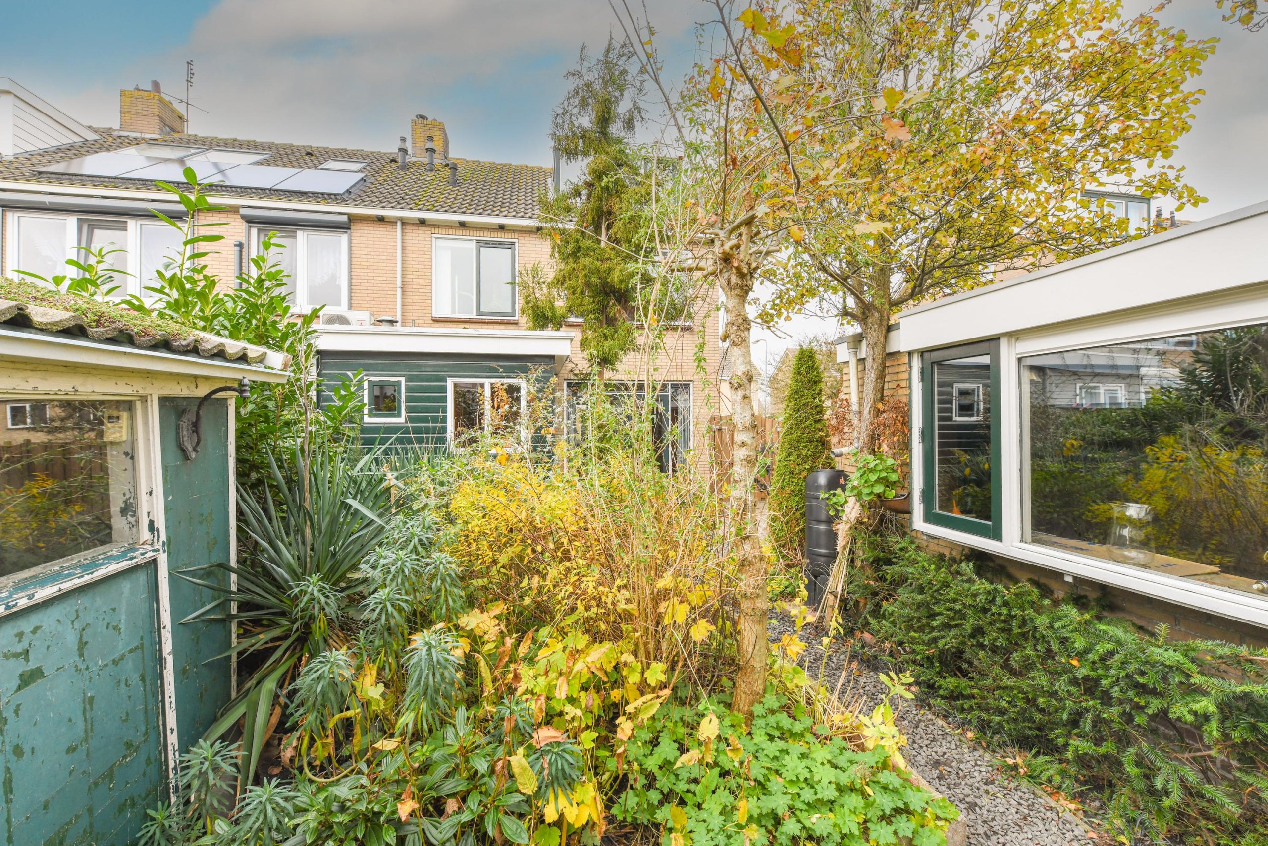 De zonnige achtertuin op het zuidoosten is groen en speels aangelegd. Achterin staat de garage met elektra, voorzien van een praktische erker met werkbank — ideaal voor hobby’s of klussen. Daarnaast is er nog een vrijstaande berging, perfect voor tuingereedschap en opslag.
