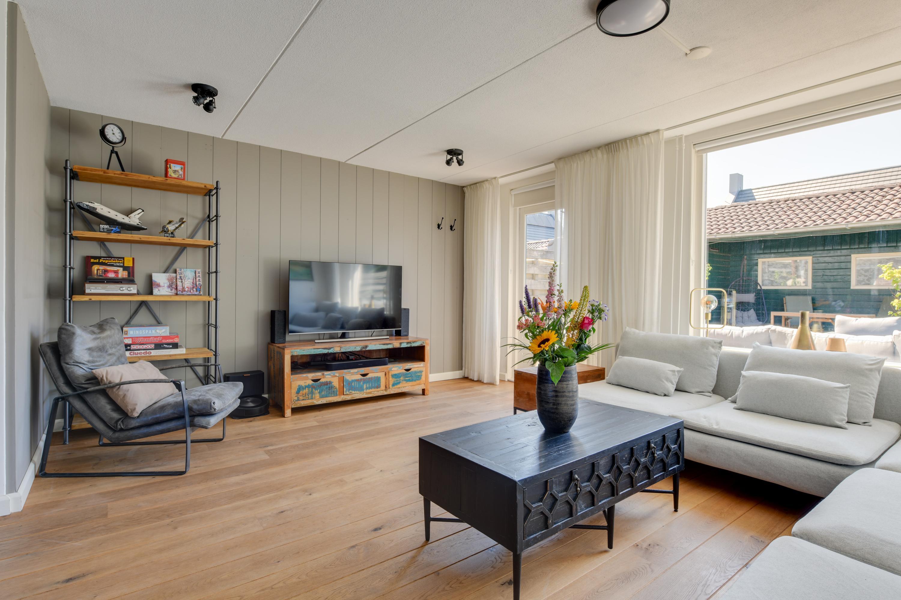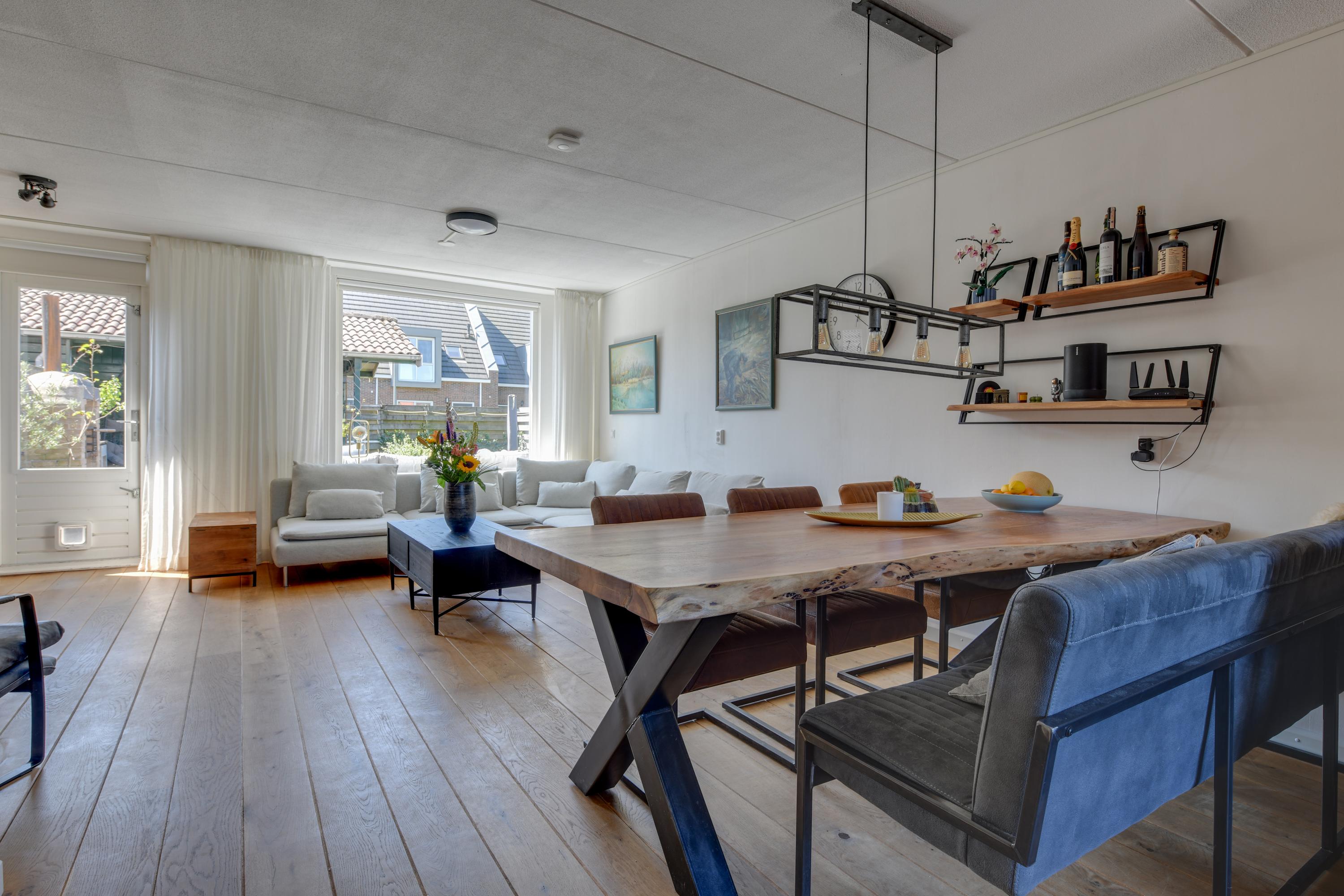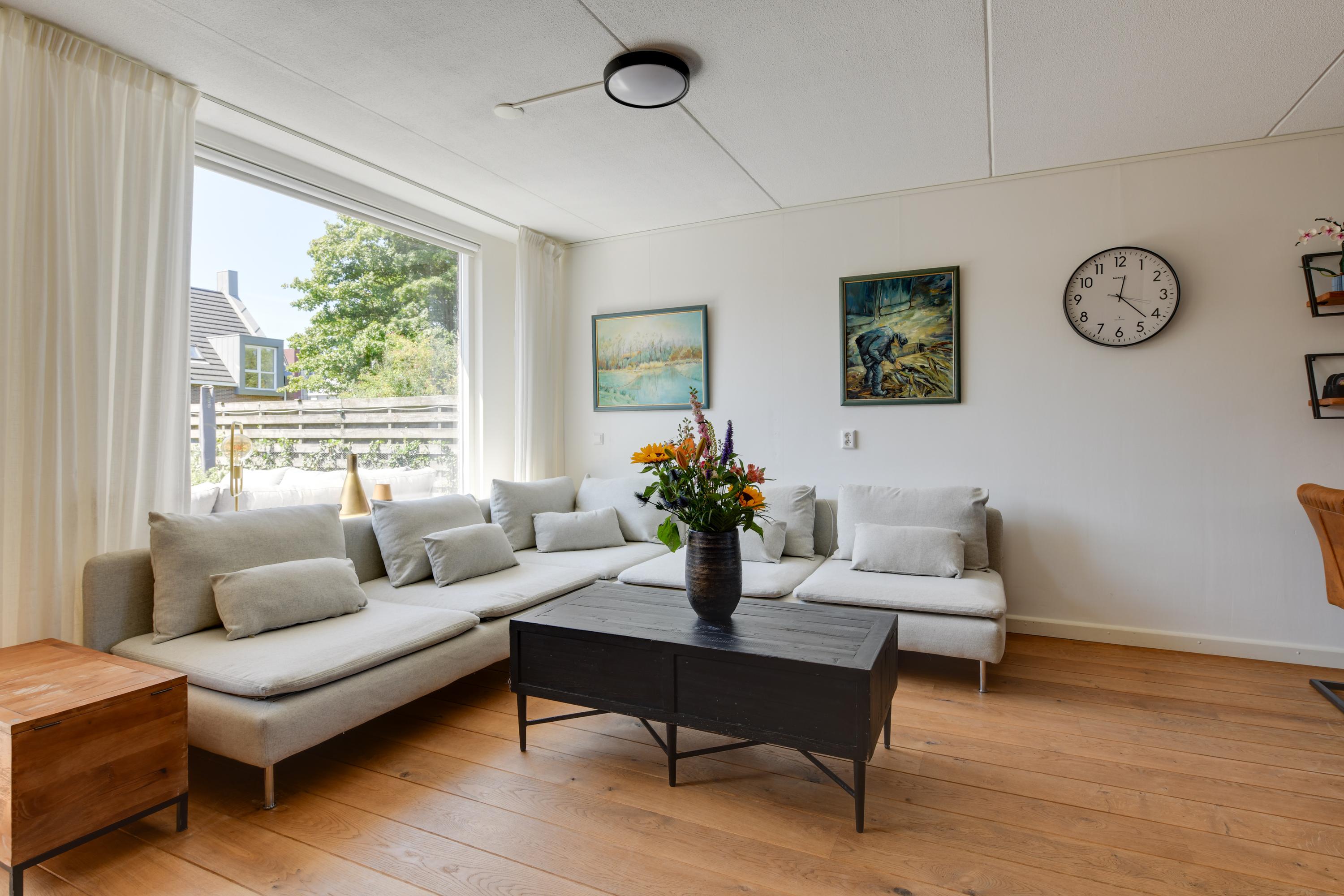 Via de nette voortuin kom je binnen in de hal met meterkast, toilet en trapopgang. Vanuit de hal betreed je de lichte, tuingerichte woonkamer met massief eiken vloer: een fijne plek om te ontspannen, met direct zicht op de zonnige tuin. Onder de trap bevindt zich een handige trapkast voor extra opbergruimte.