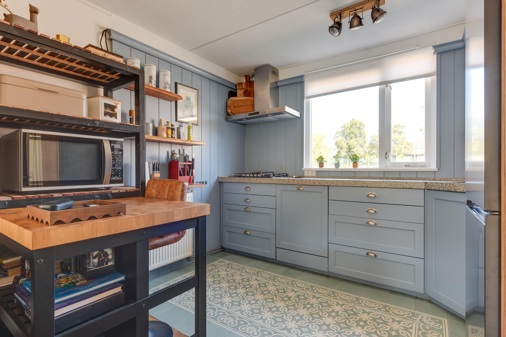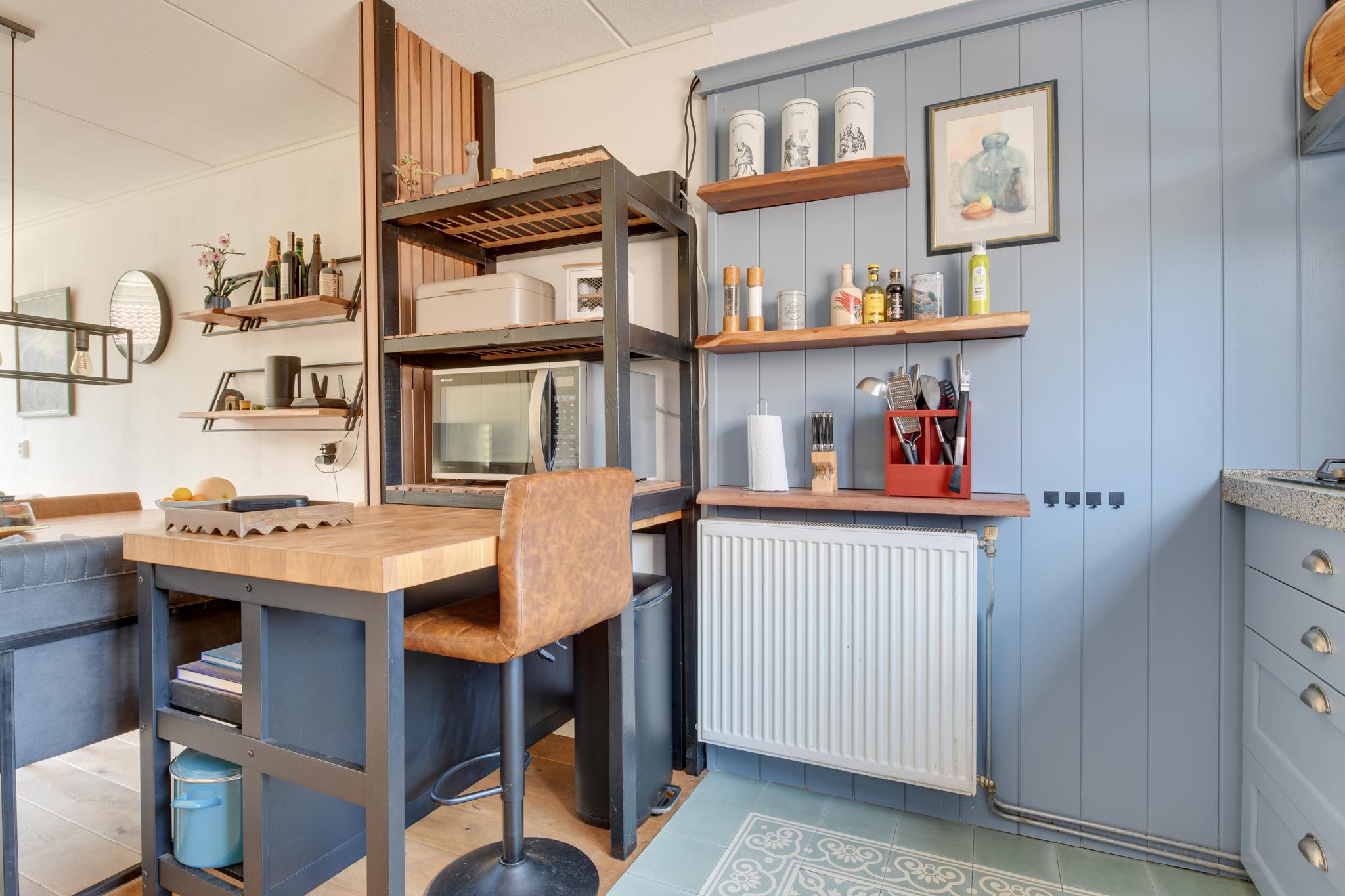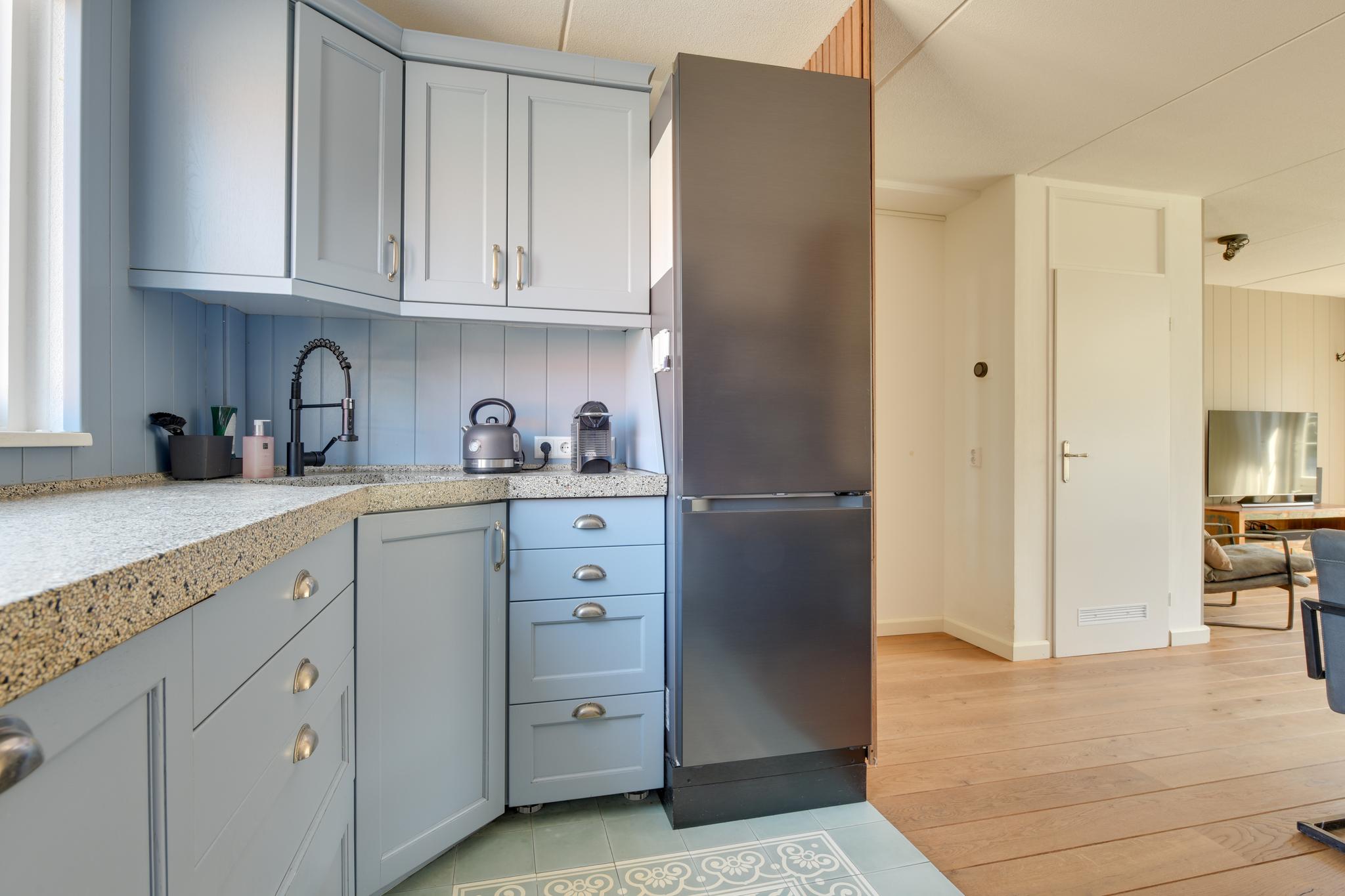 De open keuken ligt aan de straatzijde en is opgesteld in een hoek. Hier kook je op een 5-pits kookplaat, met verder een afzuigkap, vaatwasser en combimagnetron. De koelkast met vriesvak is losstaand. Het handgestorte granito aanrechtblad is een charmant detail dat de keuken extra karakter geeft. De vloer is afgewerkt met sfeervolle tegels die goed passen bij de stijl van de woning.