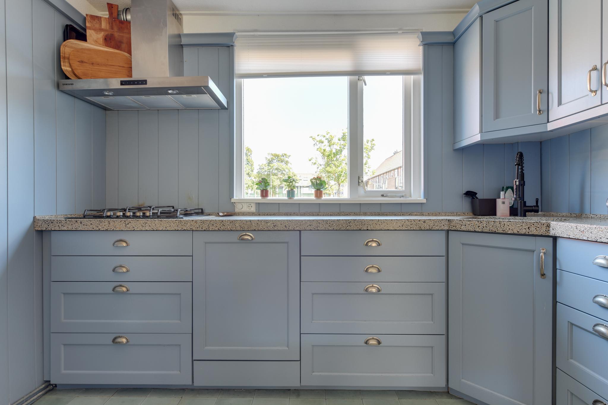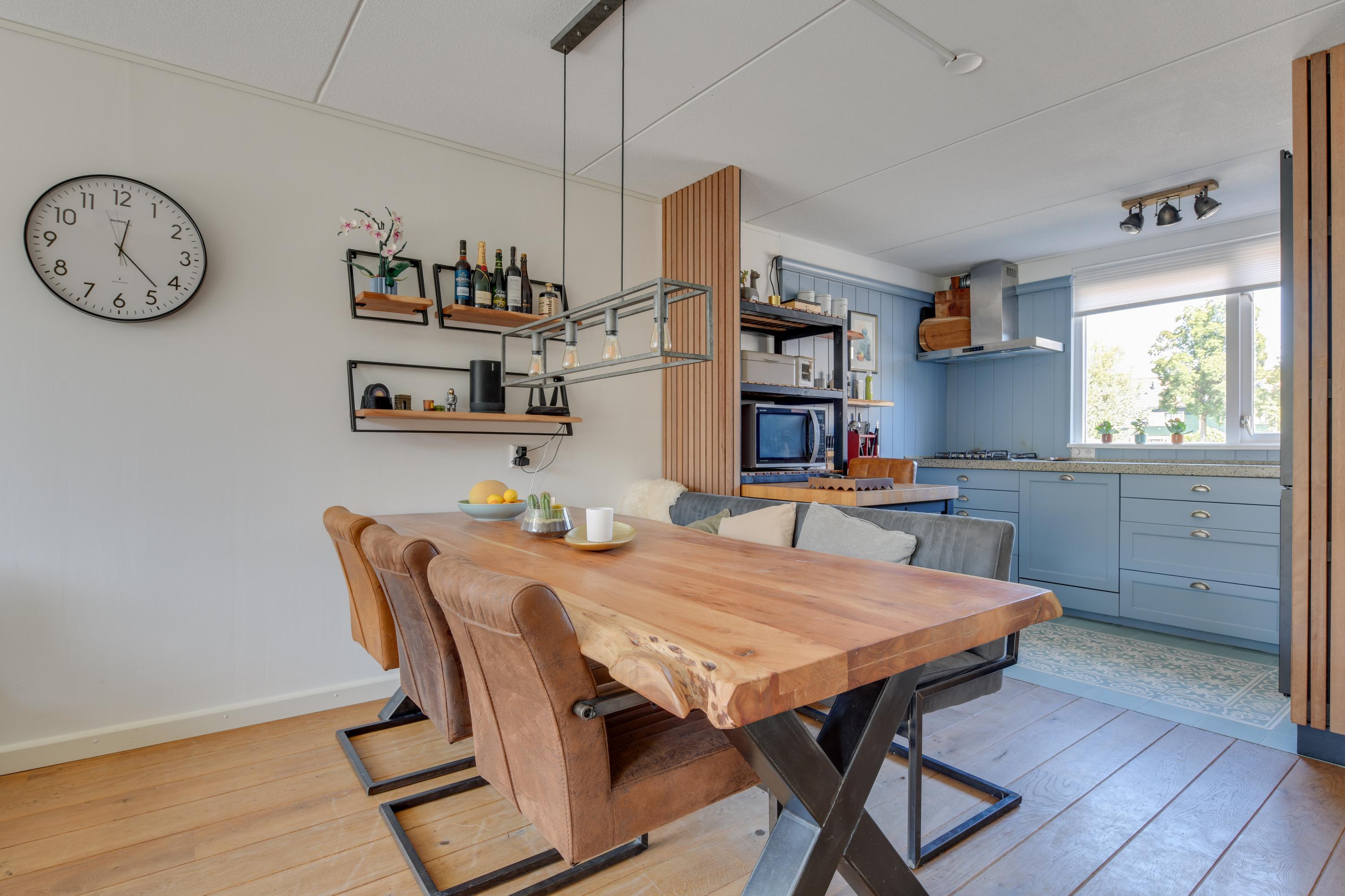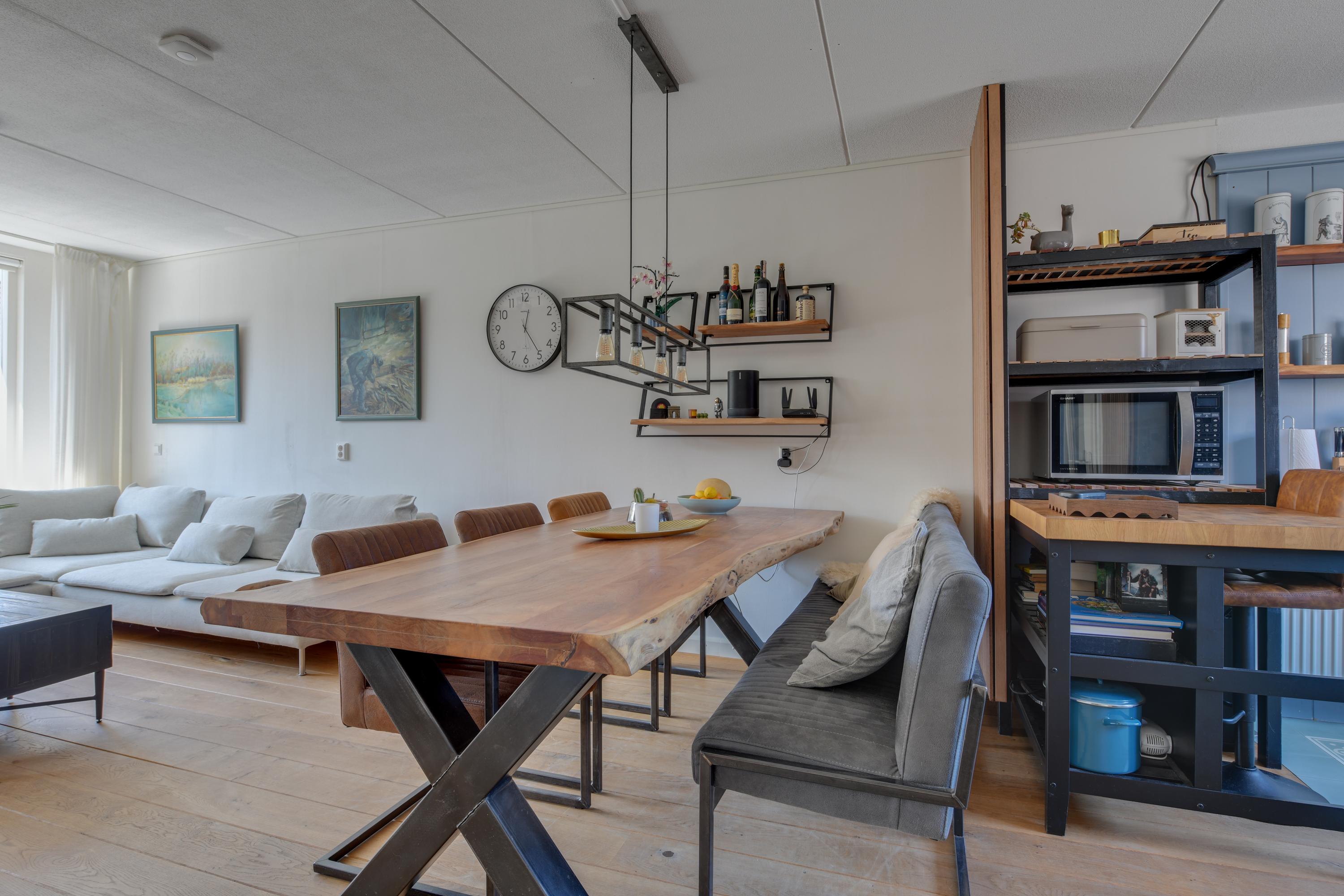 De open keuken ligt aan de straatzijde en is opgesteld in een hoek. Hier kook je op een 5-pits kookplaat, met verder een afzuigkap, vaatwasser en combimagnetron. De koelkast met vriesvak is losstaand. Het handgestorte granito aanrechtblad is een charmant detail dat de keuken extra karakter geeft. De vloer is afgewerkt met sfeervolle tegels die goed passen bij de stijl van de woning.