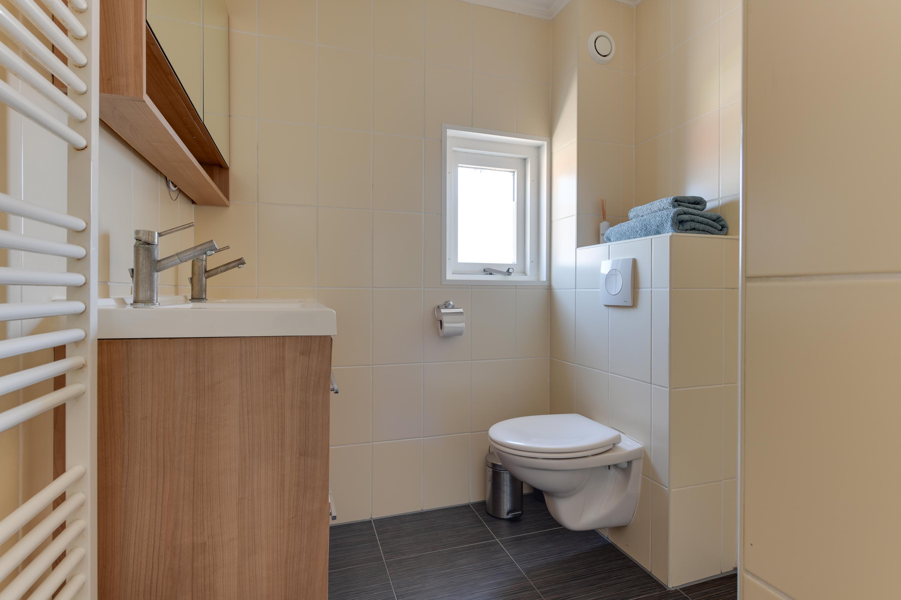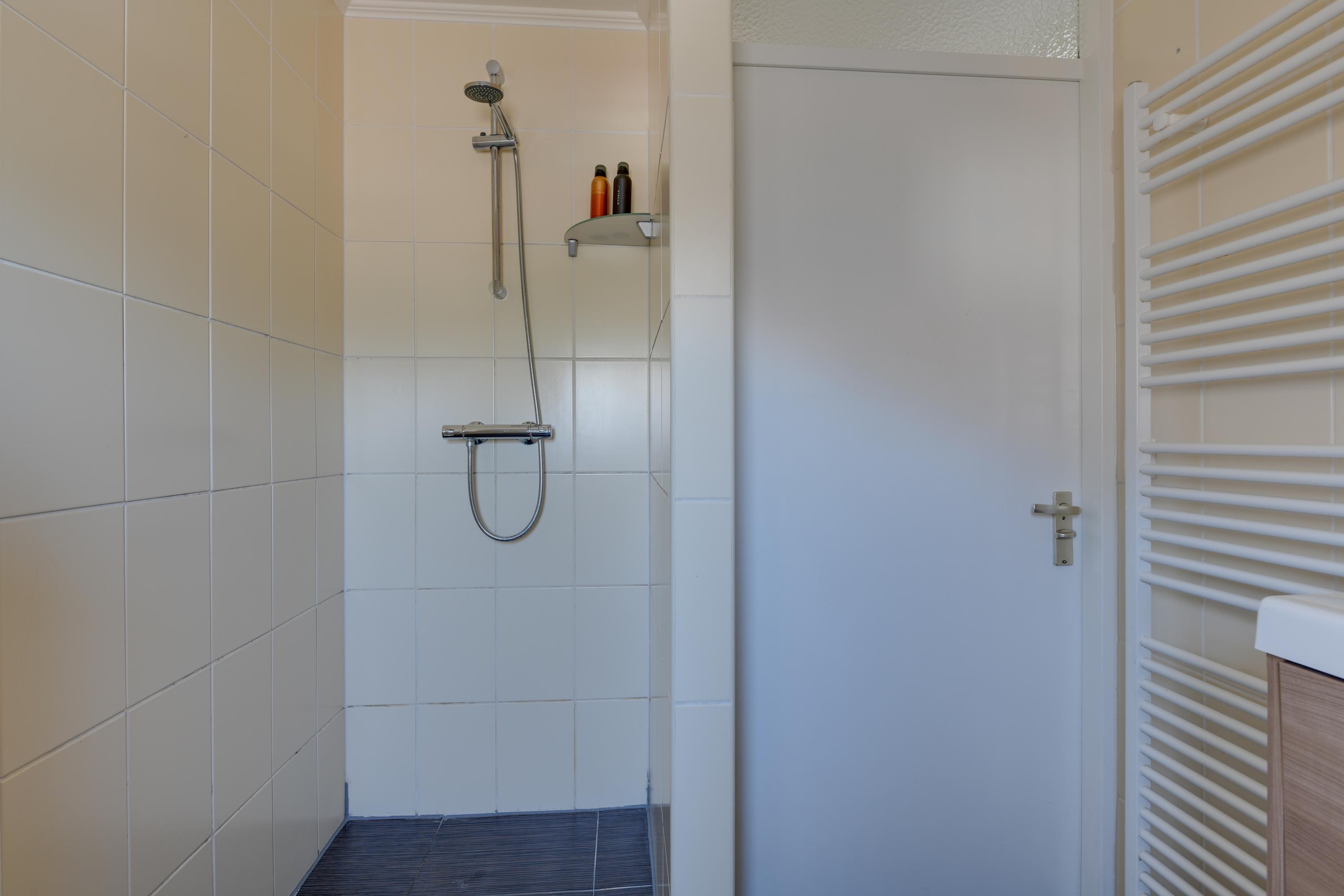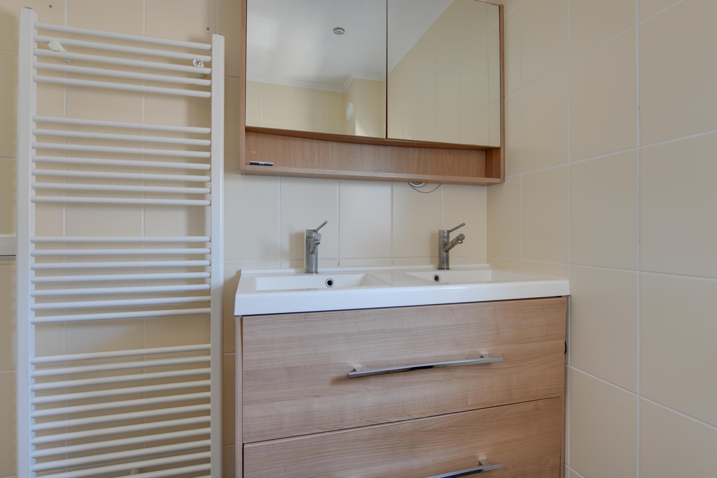 De badkamer is netjes en compleet ingericht met een royaal wastafelmeubel met dubbele wasbak, een inloopdouche en een tweede toilet.