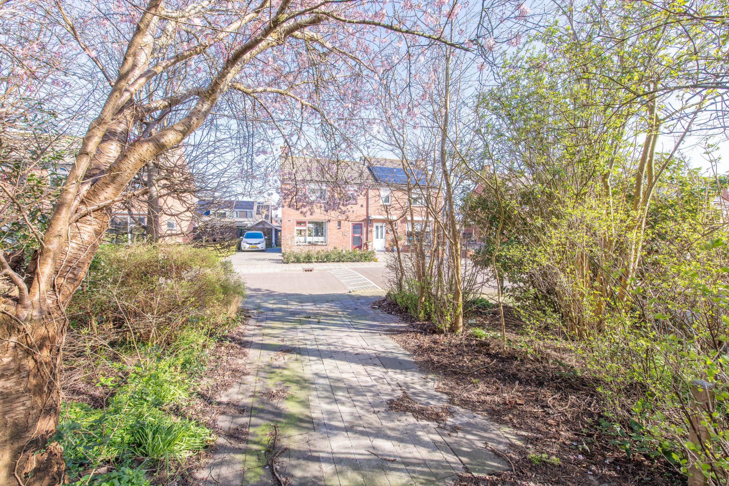 De grote tuin ligt pal op het zuiden waardoor het hier al vroeg in het jaar goed toeven is. De woning grenst aan een groenstrook van de gemeente en naast het huis ligt een brede strook grond waar thans een parkeerplaats op eigen terrein is aangelegd. Meerdere auto's zouden hier op eigen terrein geparkeerd kunnen worden.
