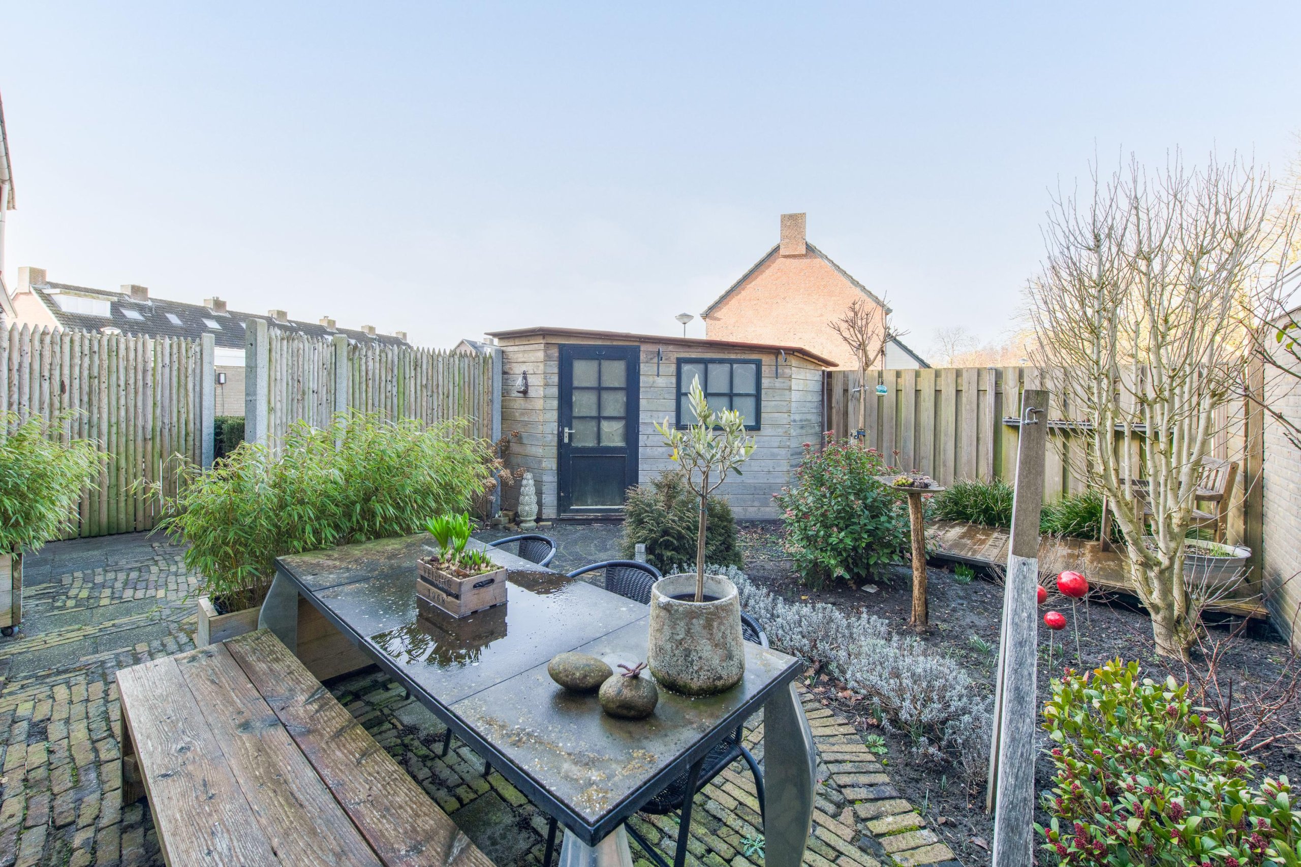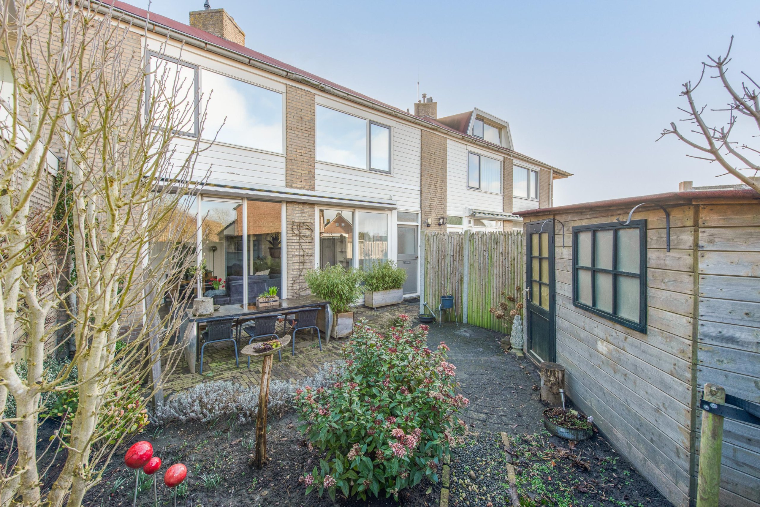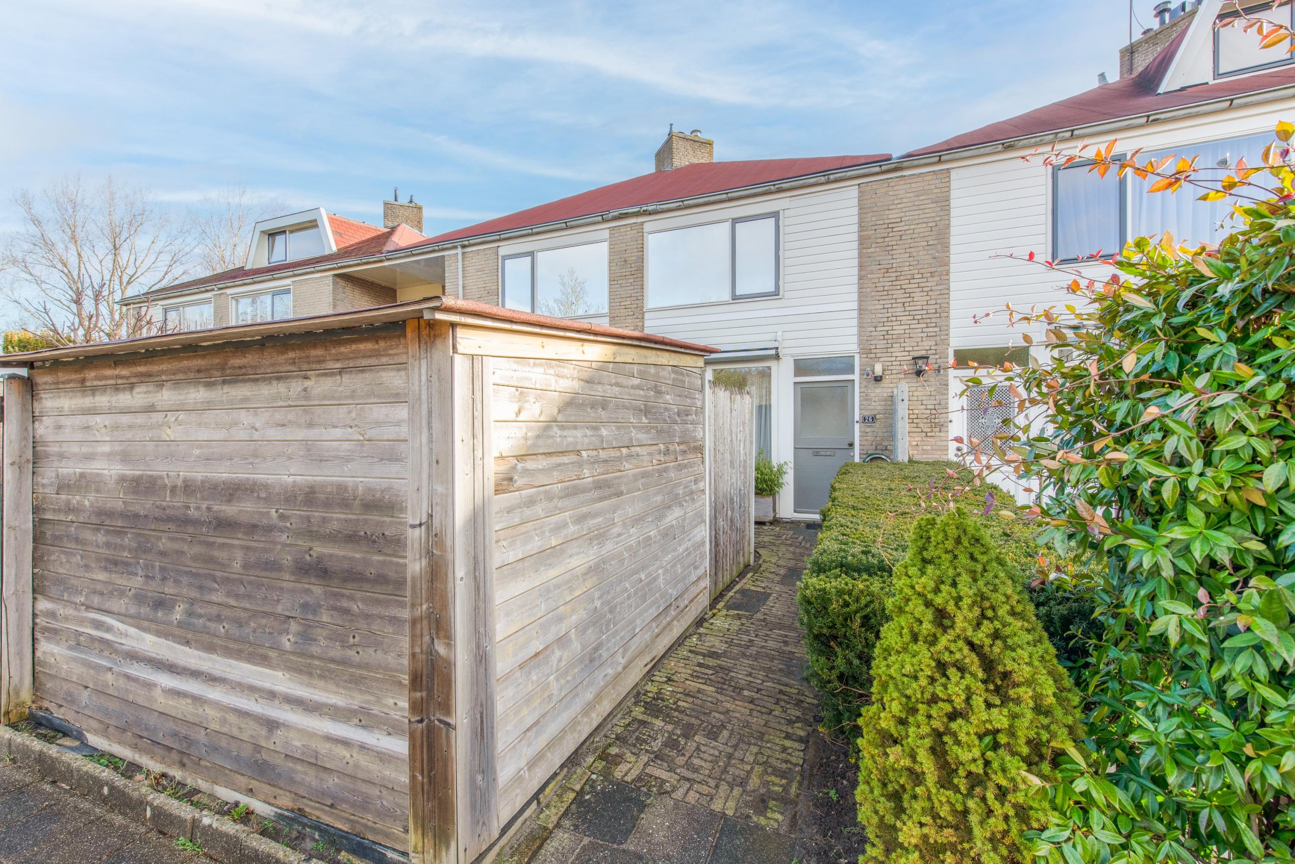 De ruime voortuin ligt op het zonnige Westen en biedt volop mogelijkheden om een fijne zitplek te creëren. Aan de voorzijde bevindt zich een extra royale houten berging en er is een buitenkraan aanwezig.
