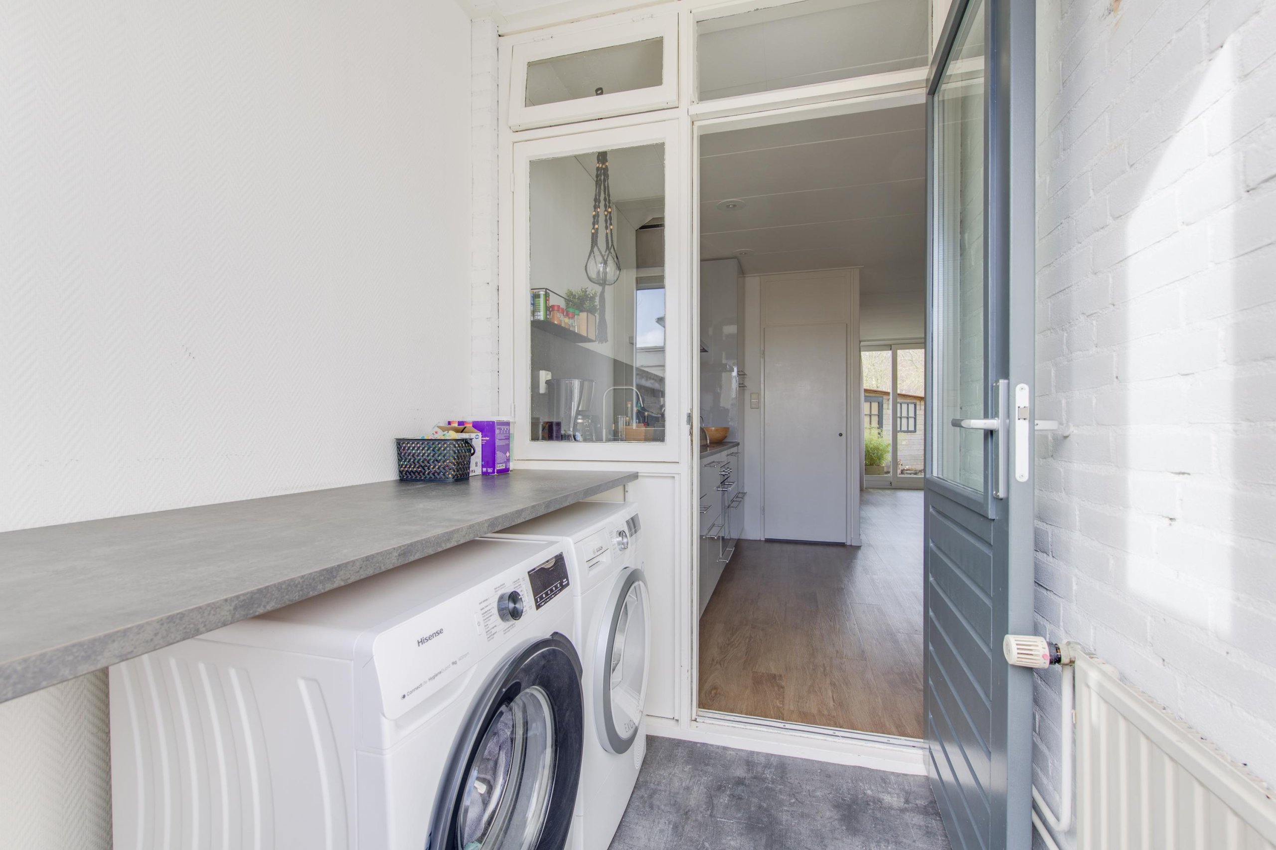 Via de keuken bereik je de praktische hal annex bijkeuken, waar de wasmachine en droger netjes zijn opgesteld. Vanuit hier heb je toegang tot het achterpad en de berging.