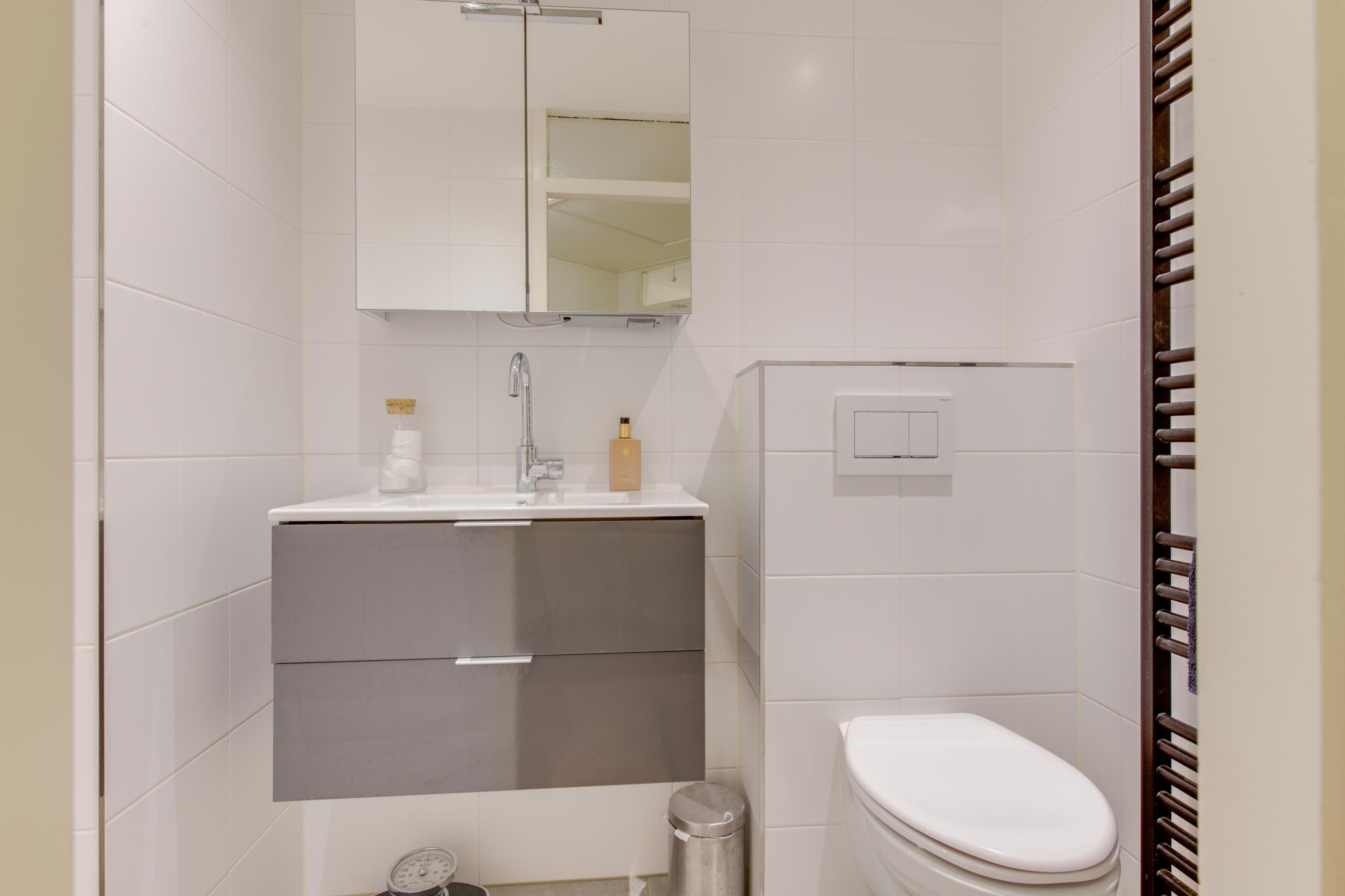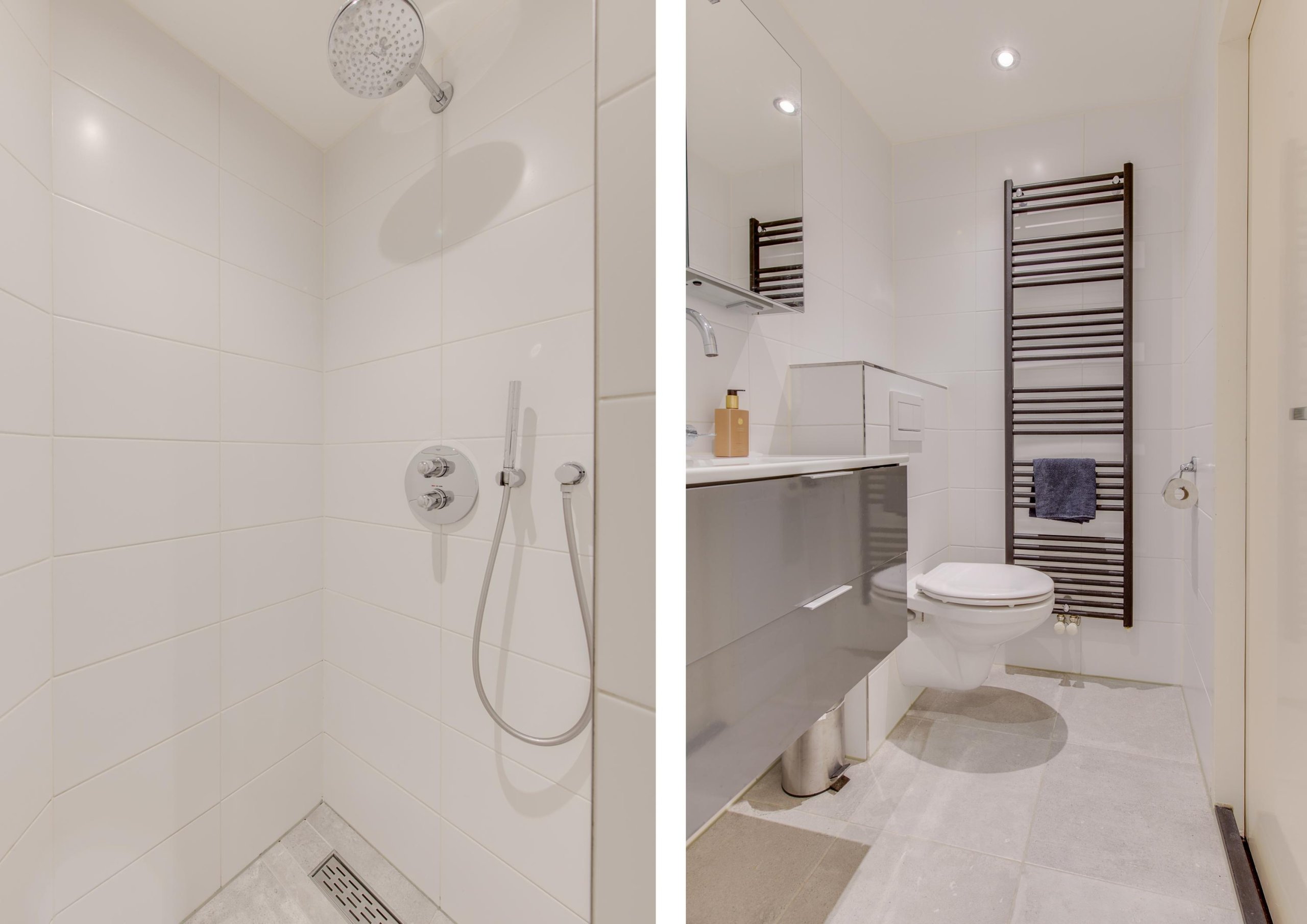 De badkamer is compact, maar verzorgd en modern uitgevoerd met een inloopdouche, wastafel en toilet.