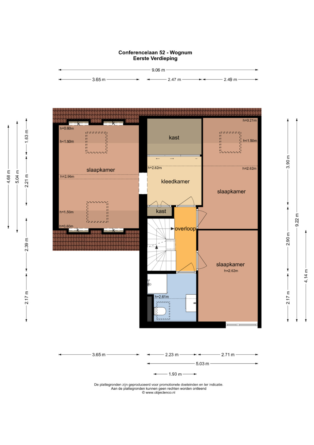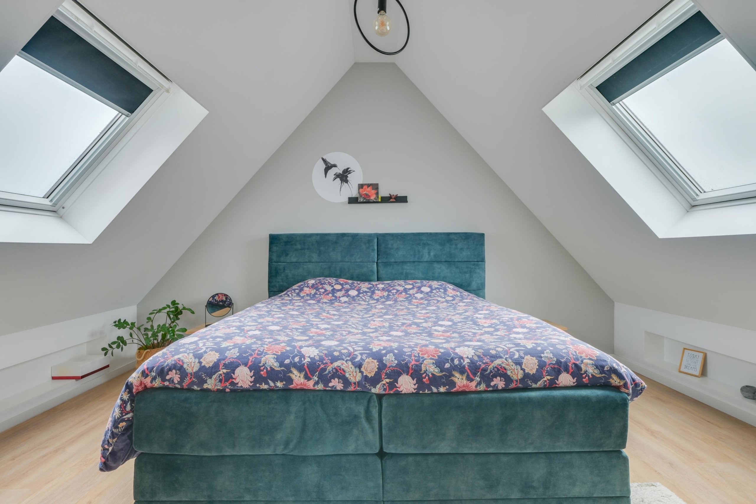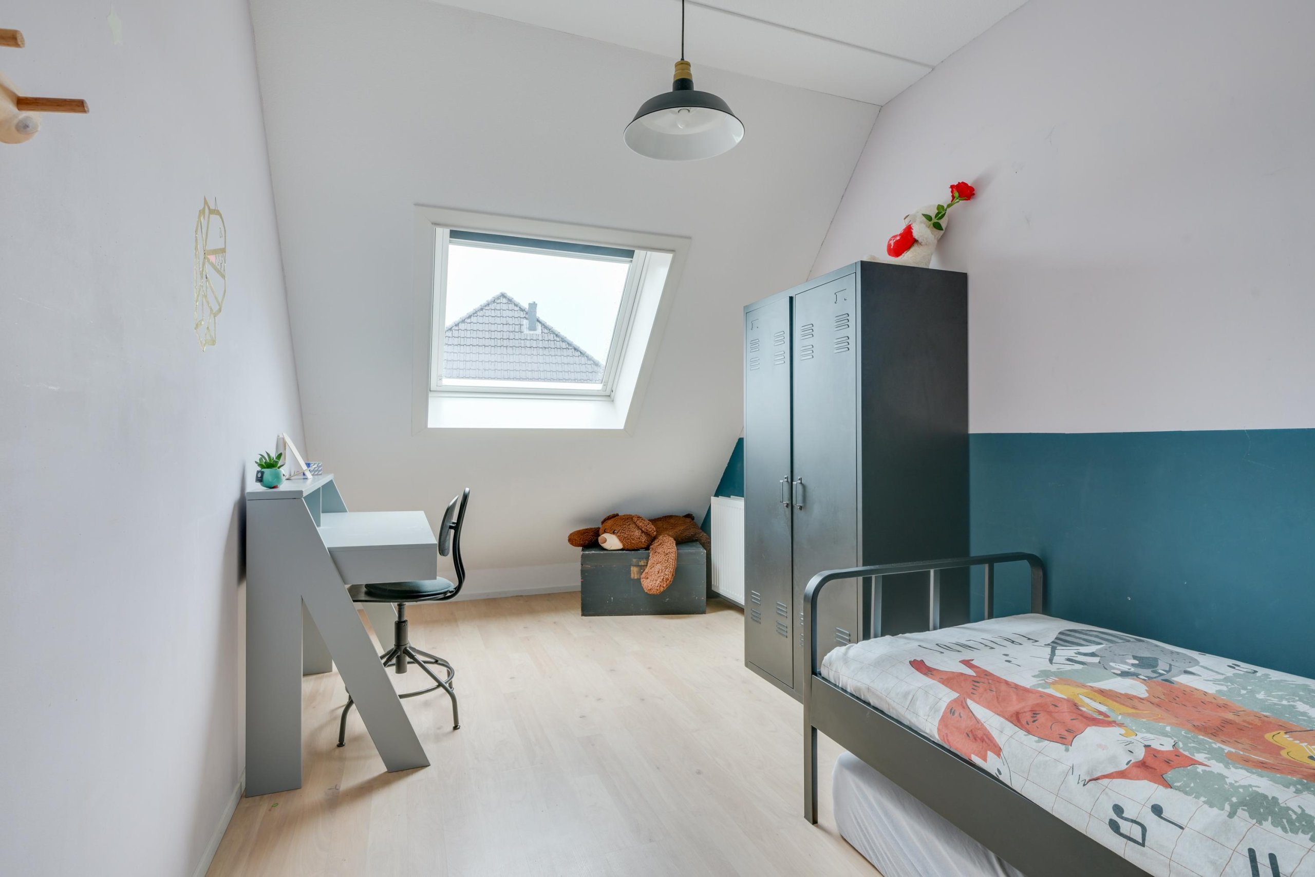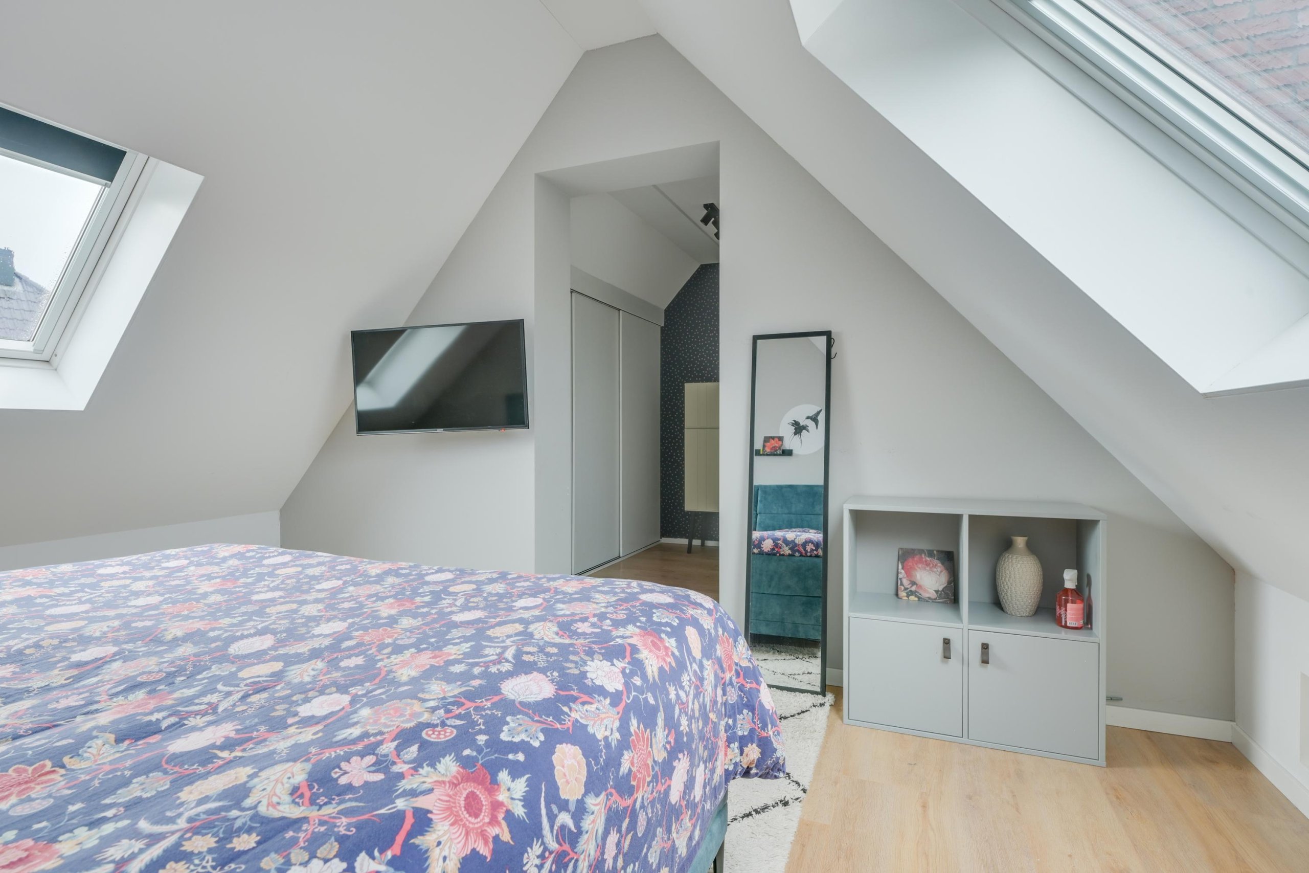 Op de eerste etage bevinden zich 3 ruime slaapkamers en de badkamer. De slaapkamers zijn allen sfeervol afgewerkt. De slaapkamer boven de zitkamer is gerealiseerd tijdens de verbouwing van de garage tot woonkamer en sfeervol afgewerkt met o.a. 2 grote Velux dakramen. In deze slaapkamer is een ruime ‘walk through’ kast gemaakt voor alle kleding. De badkamer maakt de etage compleet. In de badkamer tref je een ruime douchehoek aan, het toilet en een wastafelmeubel.