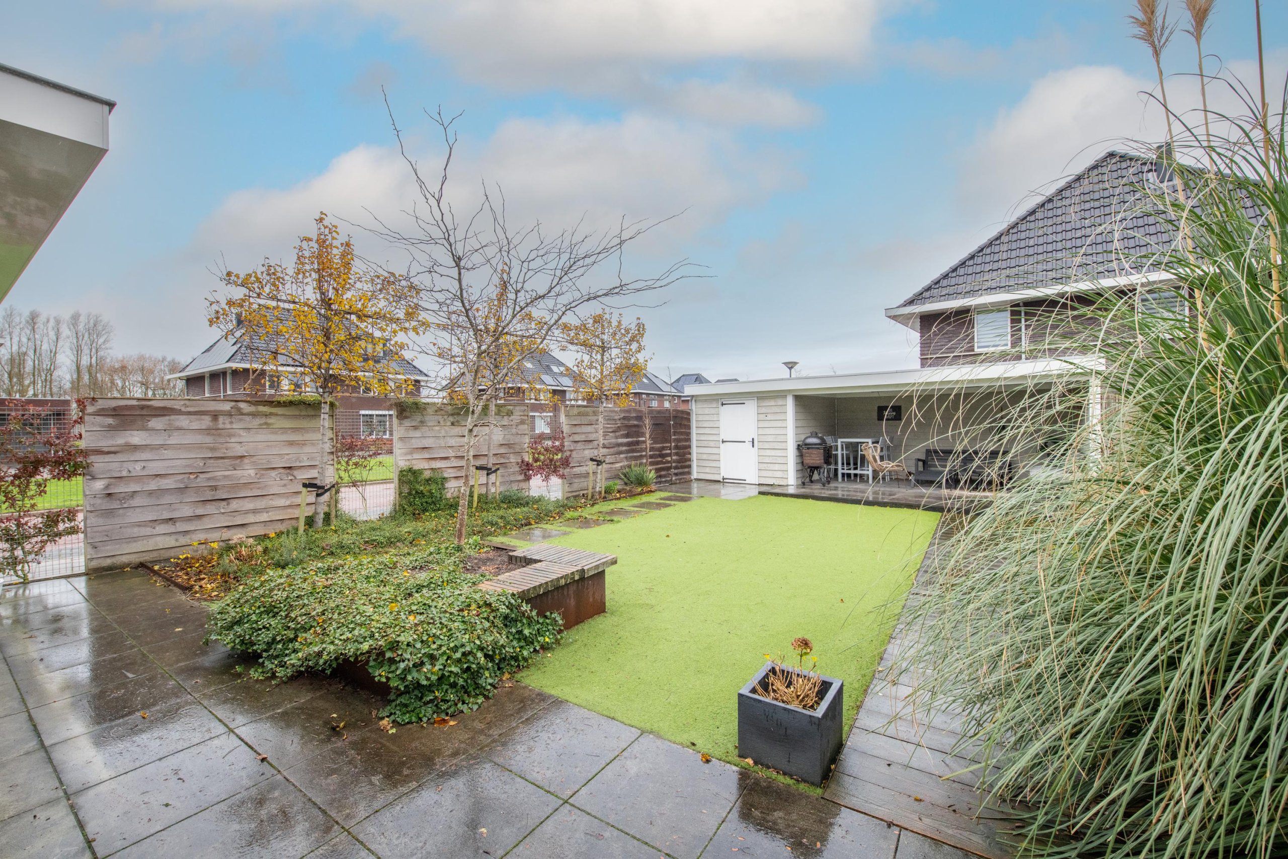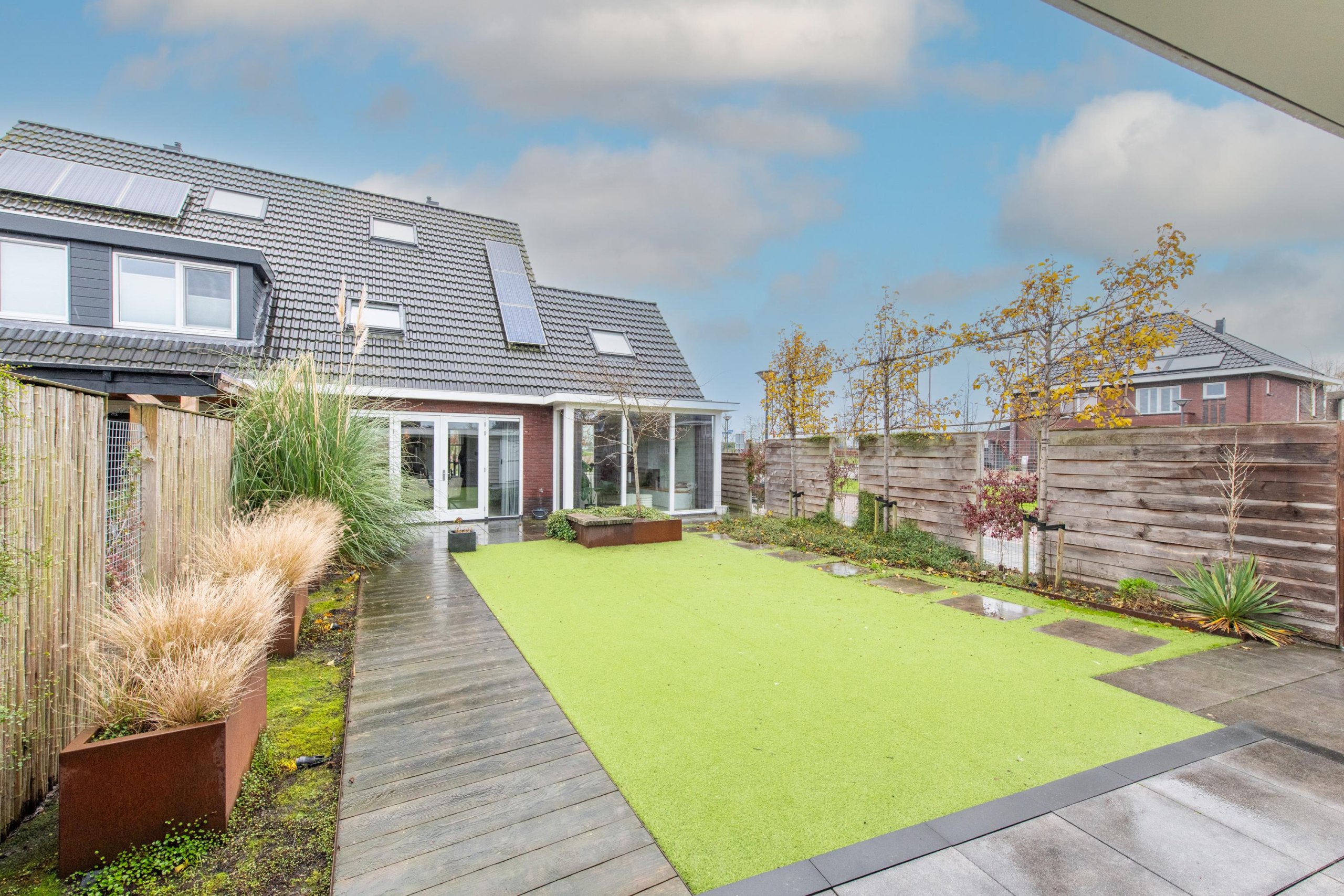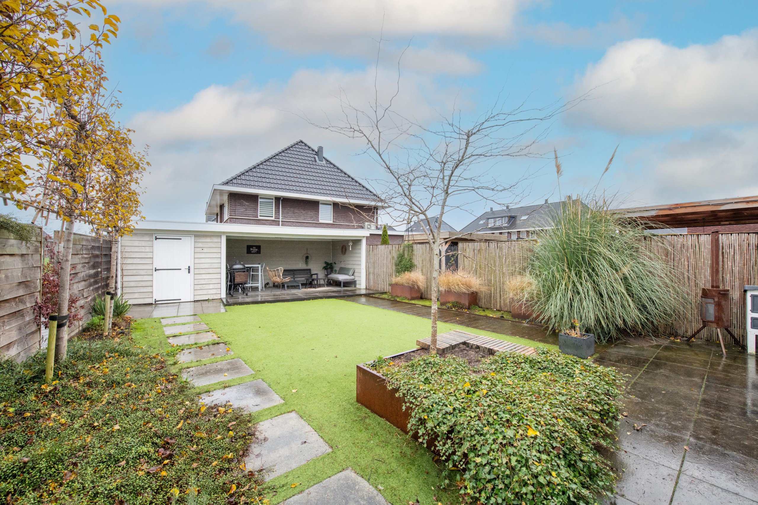 De grote achtertuin is onderhoudsarm aangelegd en door de diverse terrassen is het altijd mogelijk om van zon of schaduw te genieten. De grote veranda en berging maken de tuin helemaal af. Door de ligging op de hoek van de straat zijn privacy en zonlicht gewaarborgd.