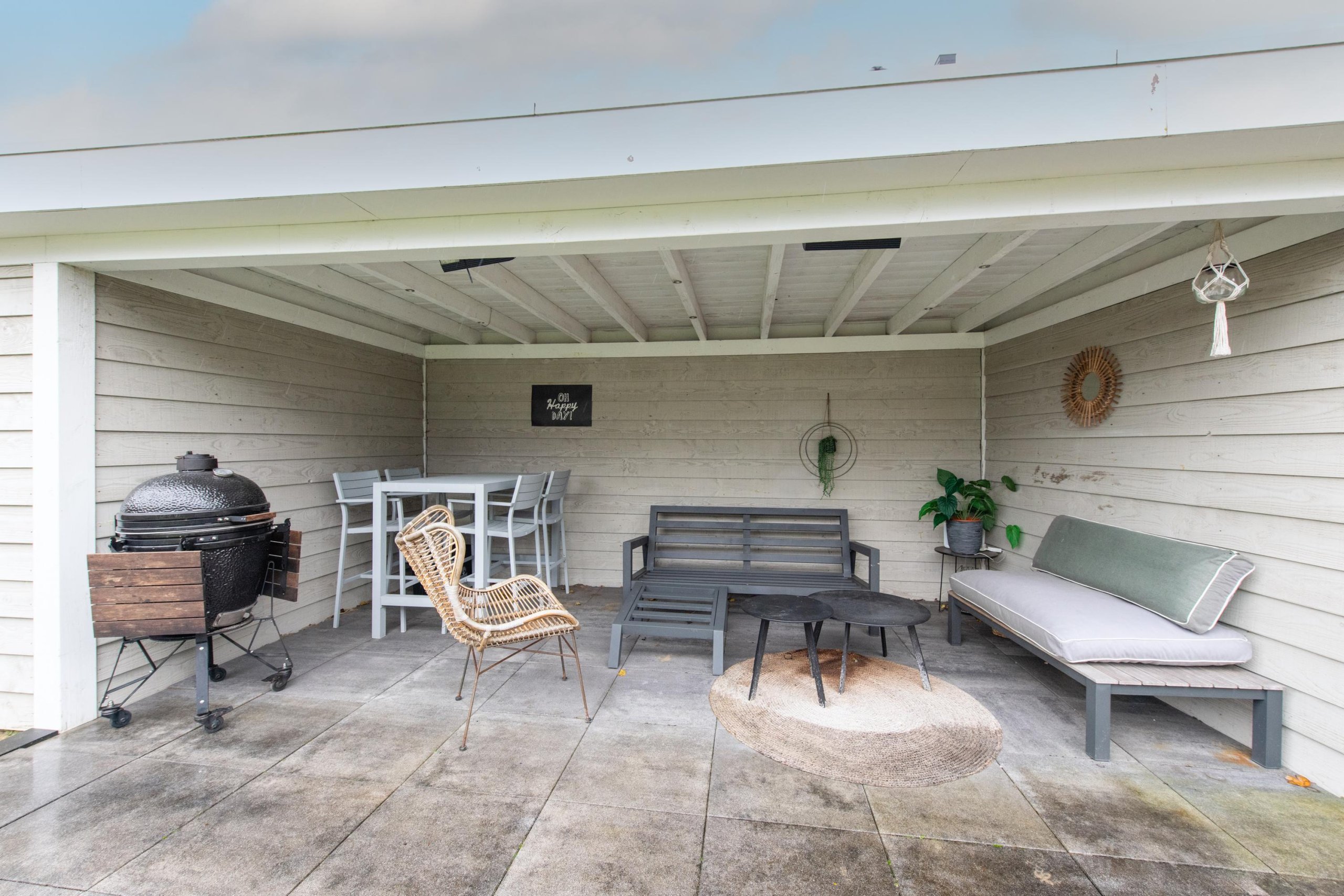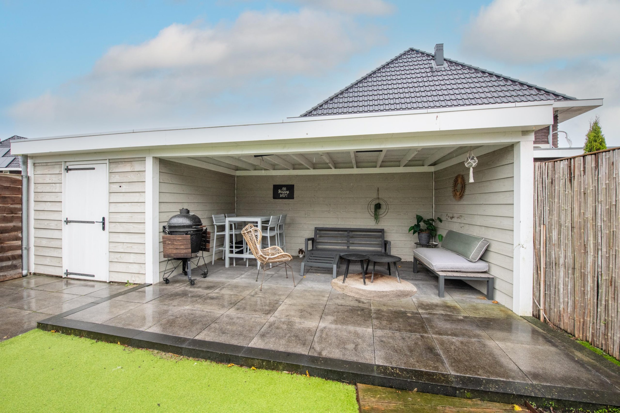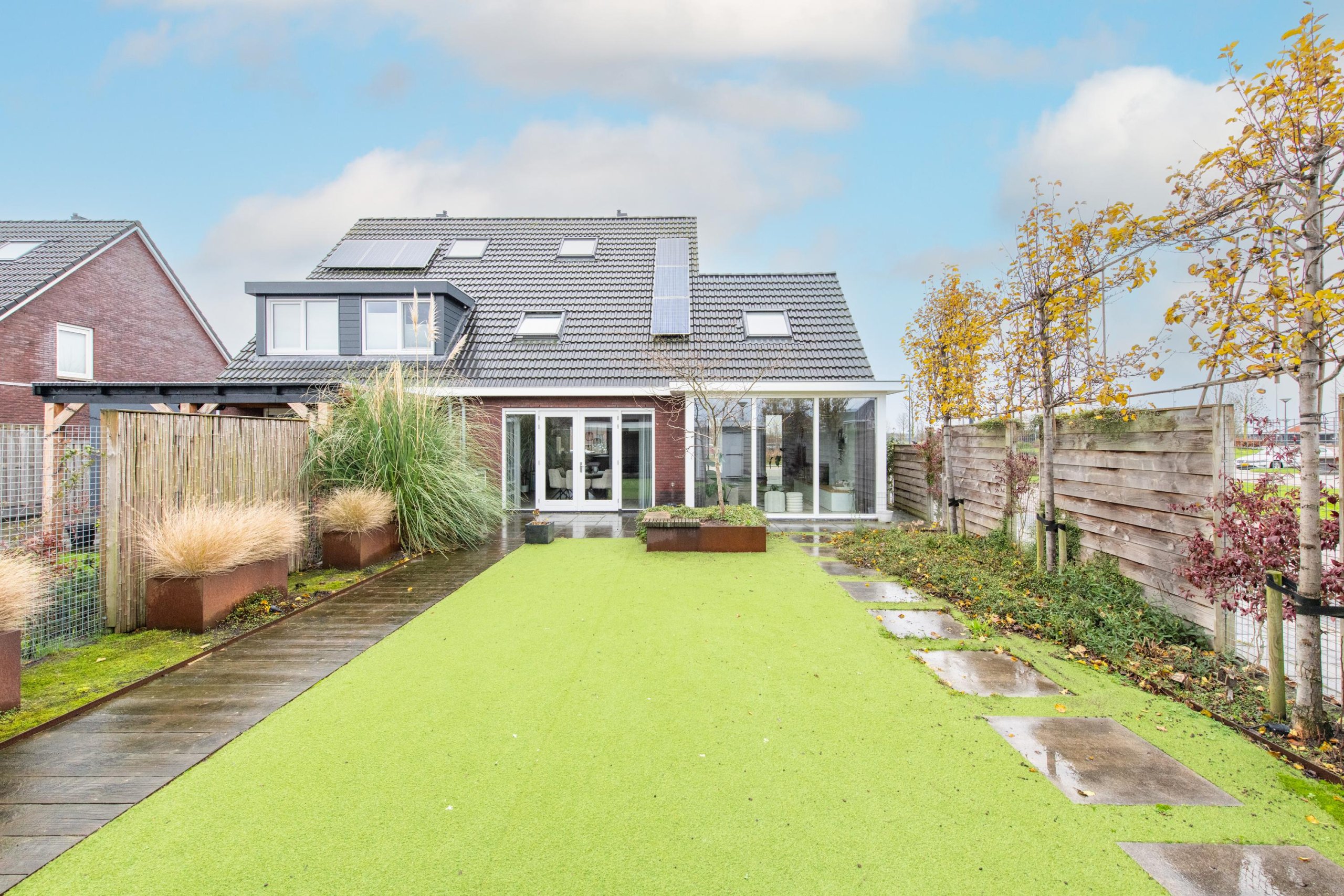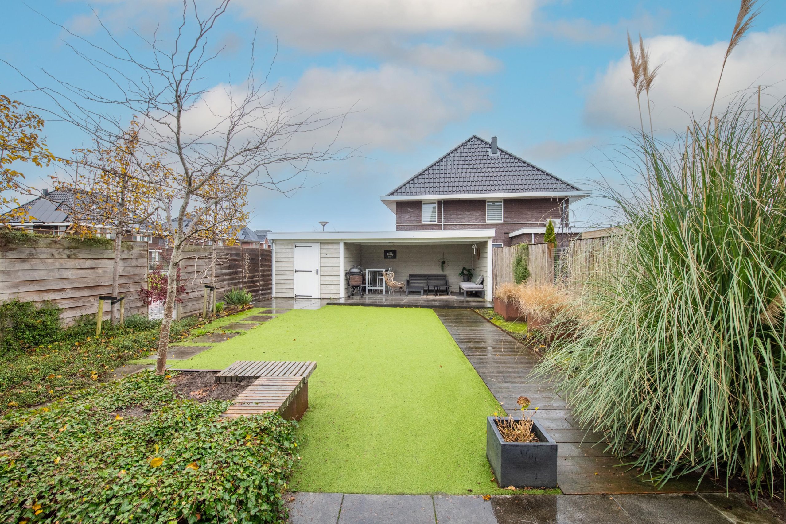 De grote achtertuin is onderhoudsarm aangelegd en door de diverse terrassen is het altijd mogelijk om van zon of schaduw te genieten. De grote veranda en berging maken de tuin helemaal af. Door de ligging op de hoek van de straat zijn privacy en zonlicht gewaarborgd.