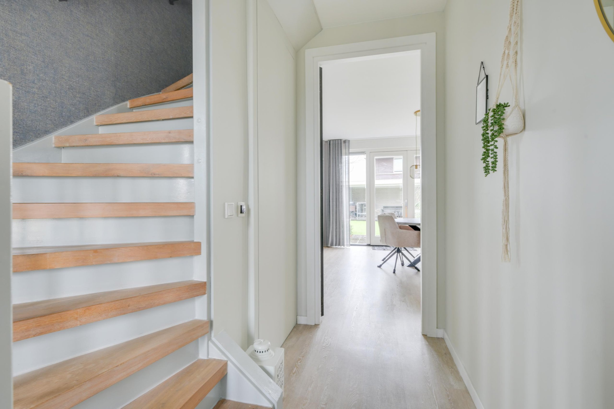 Indeling: Via het pad met ruimte voor 2 auto’s bereik je de voordeur met daarachter de entree, hal, de meterkast, de trap naar de eerste etage en het vrij hangende toilet. Vervolgens kom je in de tuingerichte woonkamer die thans als eetkamer is ingericht. Deze ruimte is afgewerkt met stucwerk wanden en een moderne vloer. Via dubbele tuindeuren is de tuin het verlengstuk van de woonkamer. De open keuken is voorzien van allerlei inbouwapparatuur zoals een inductie kookplaat, afzuigkap, vaatwasser en combimagnetron. Tevens is er een gezellige bar geplaatst. De zitkamer is gerealiseerd in de voormalige garage. Deze ruimte is af te sluiten van de eetkamer en uitstekend geschikt om met het hele gezin op de bank te kruipen en een film te kijken. De gezellige gashaard maakt deze ruimte helemaal af. De gehele begane grond wordt verwarmd middels vloerverwarming.