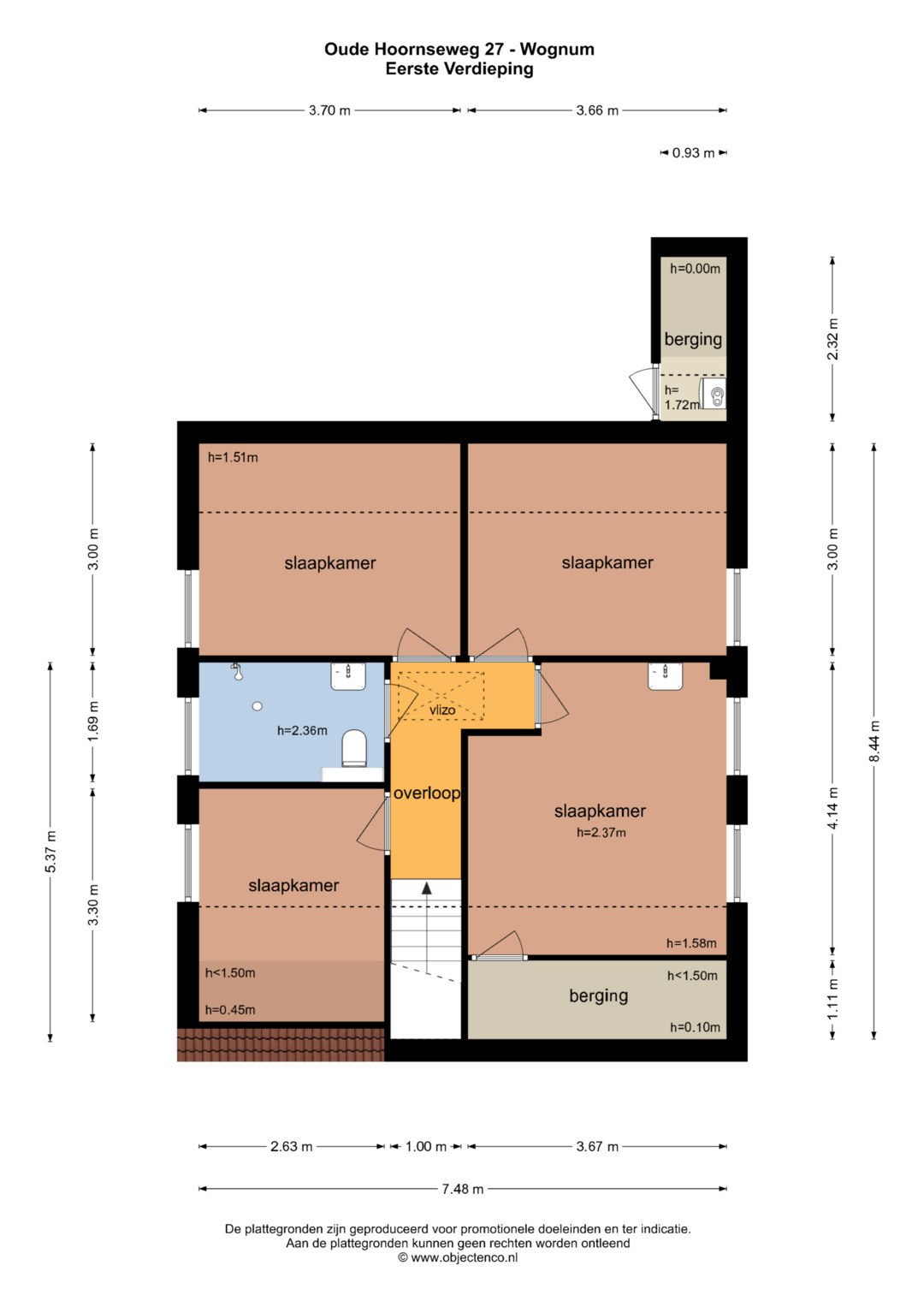 Op de eerste etage bevinden zich 4 slaapkamers. Daarnaast is hier de badkamer gerealiseerd met daarin een wastafel, toilet en douche. Eén van de slaapkamers beschikt over een eigen wastafel en opbergruimte in de knieschotten.