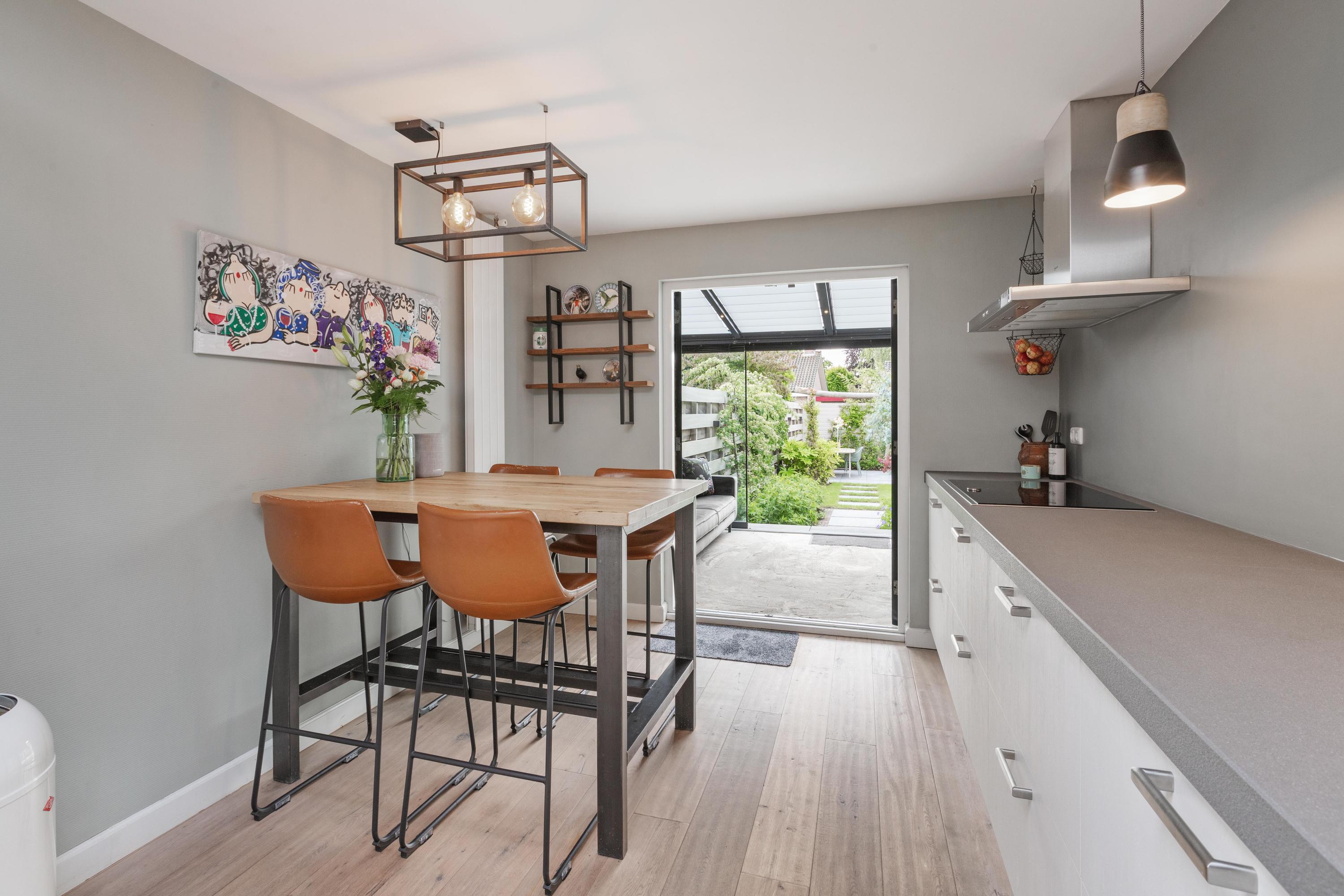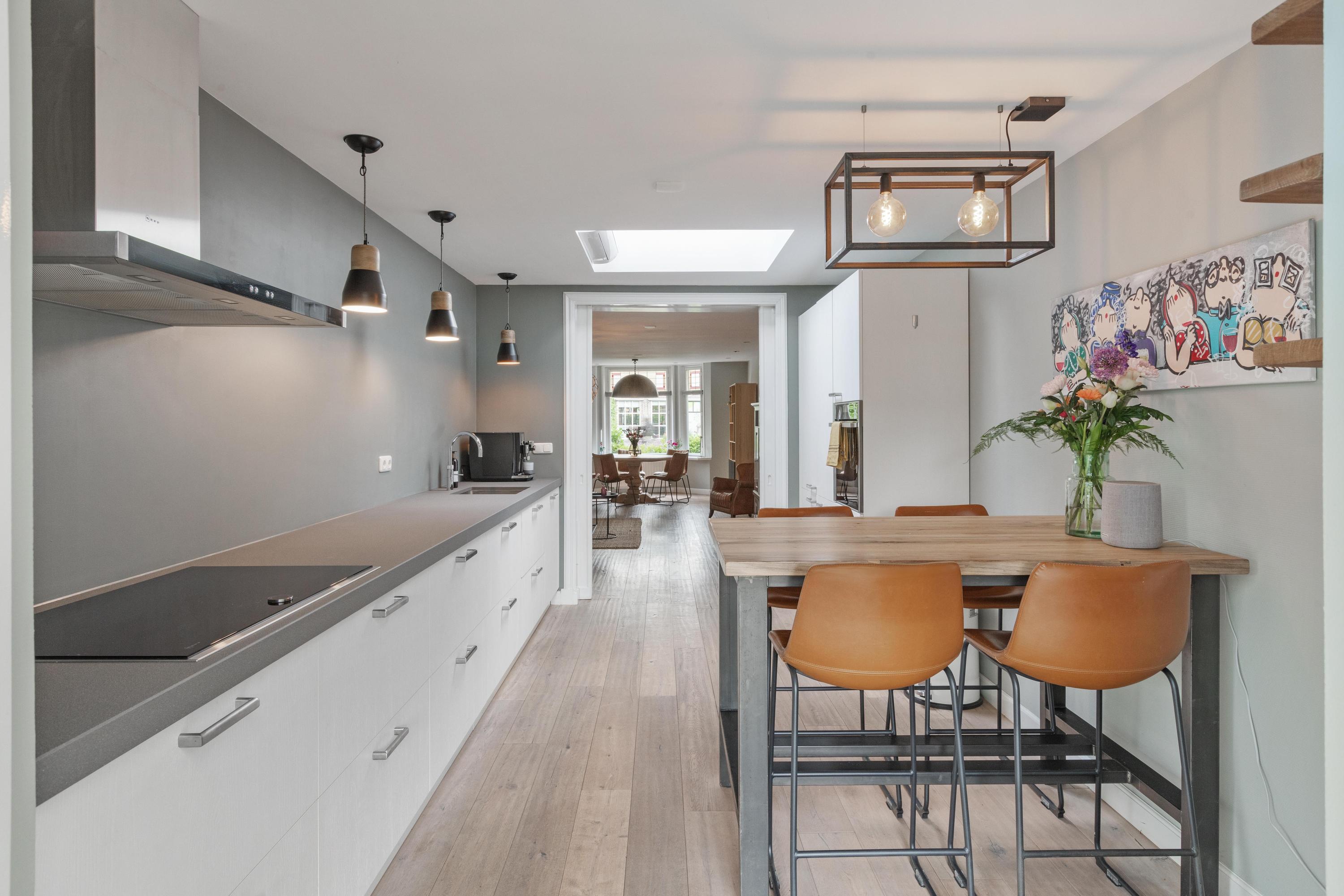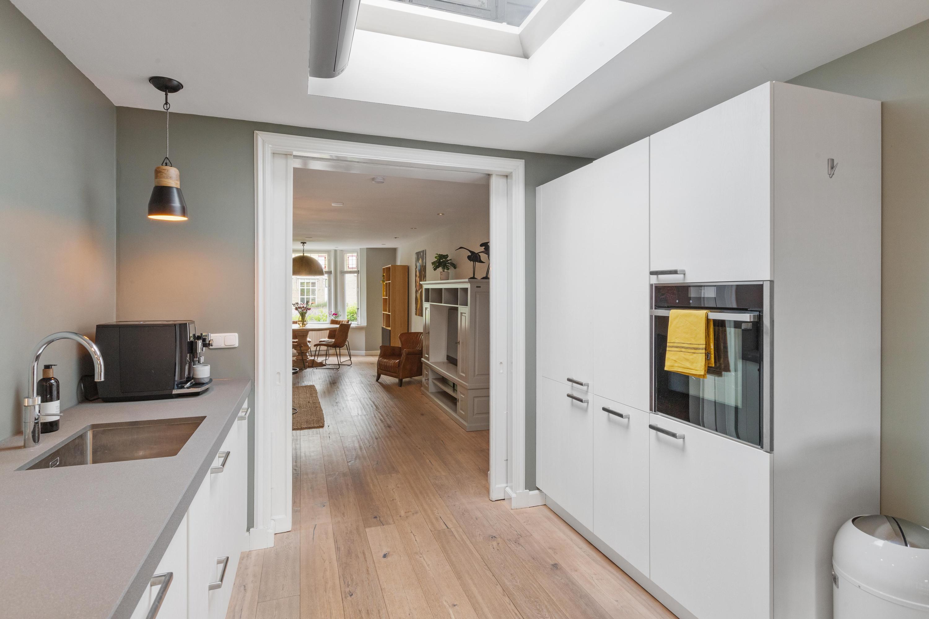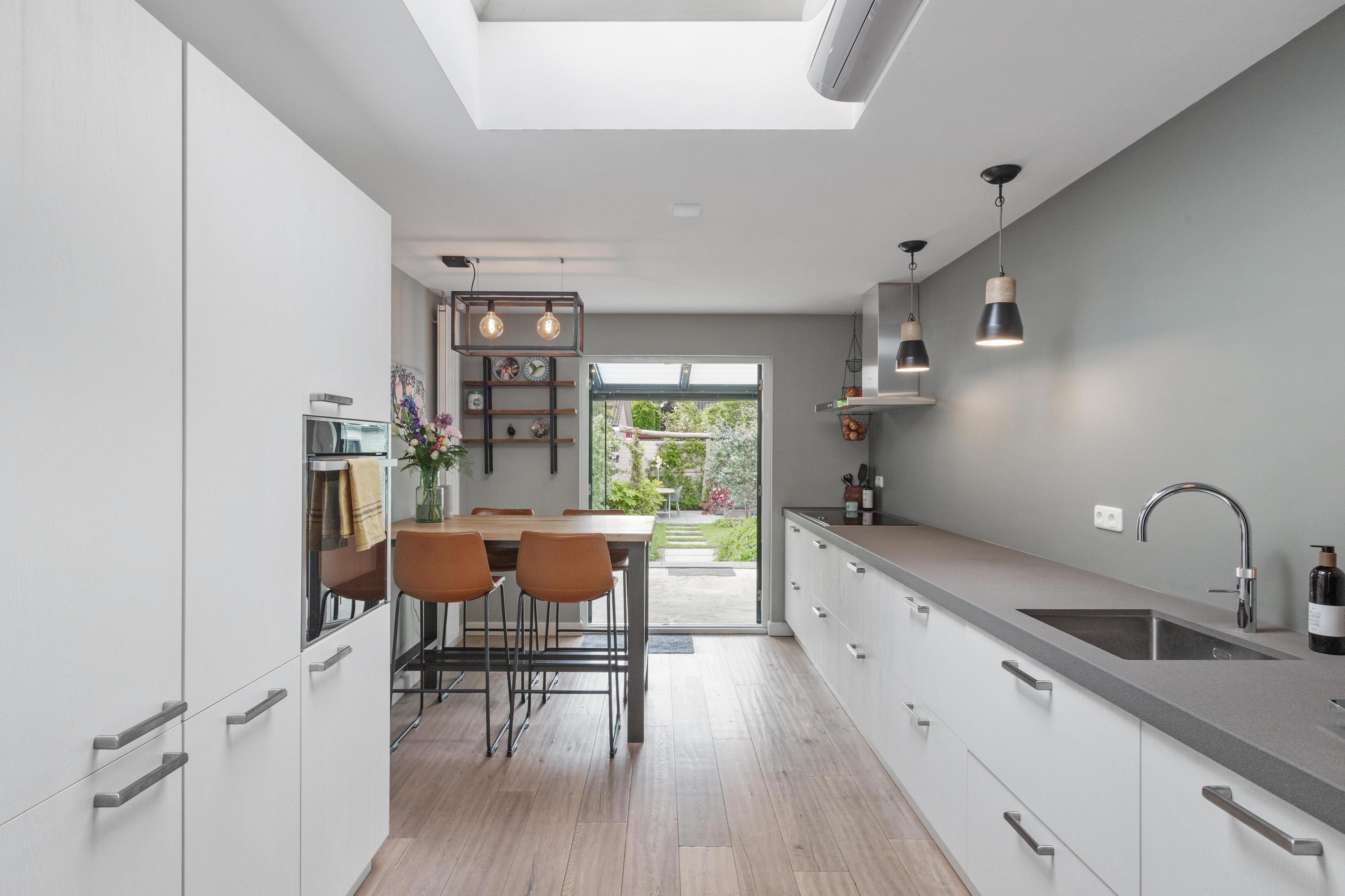 Begane grond: Via de entree kom je in de hal met de meterkast en de trapopgang. De royale woonkamer met erker is voorzien van een prachtige houten vloer en biedt een warme en comfortabele sfeer. De leefkeuken is gesitueerd in de uitbouw en is voorzien van een daklicht en een airco. De moderne keuken in dubbele opstelling is compleet uitgerust met een koel-vriescombinatie, oven met stoomfunctie, Quooker kokend waterkraan, vaatwasser, veel lades, 4-pits inductiekookplaat en een afzuigkap. Via de hal met de achterdeur bereik je zowel de slaapkamer op de begane grond als het toilet.