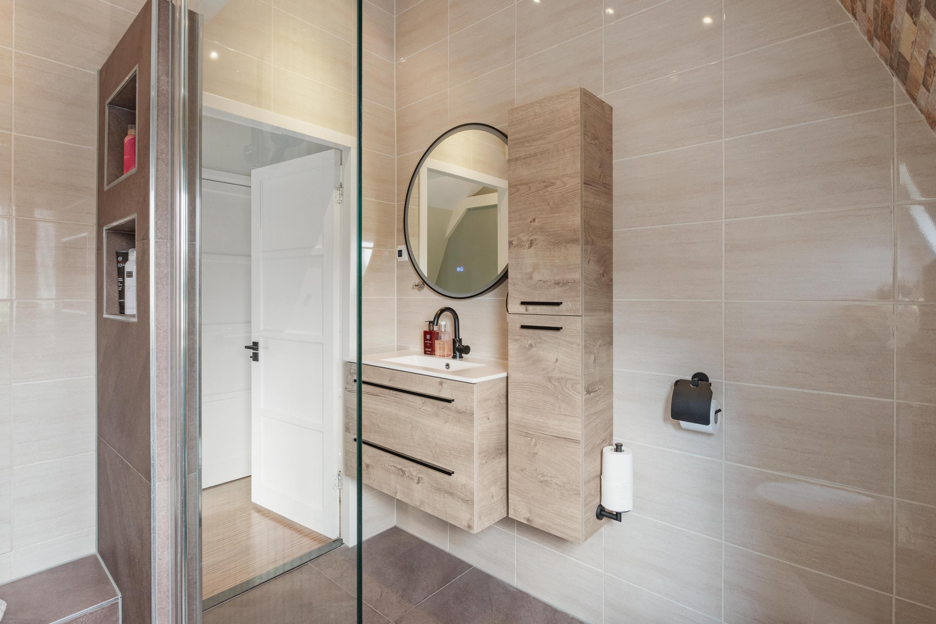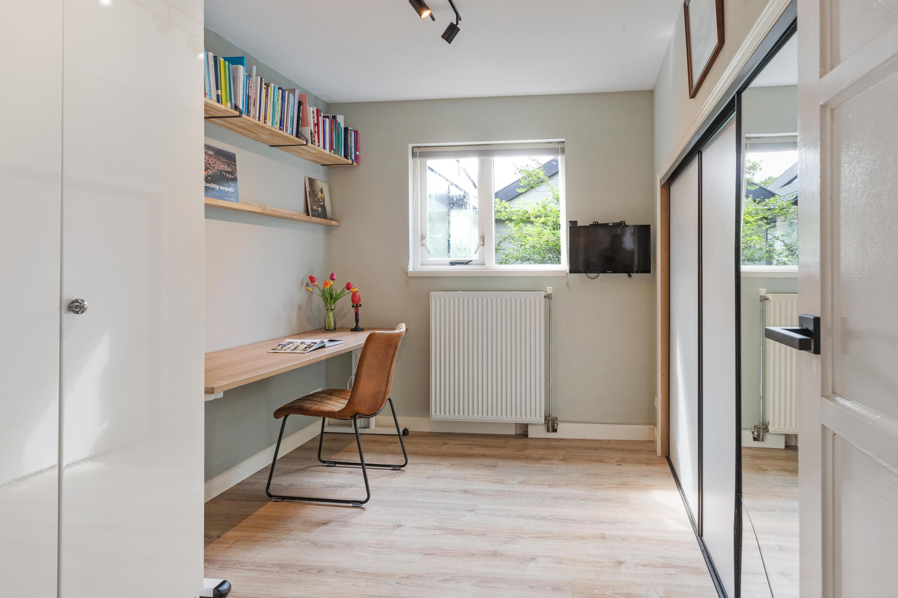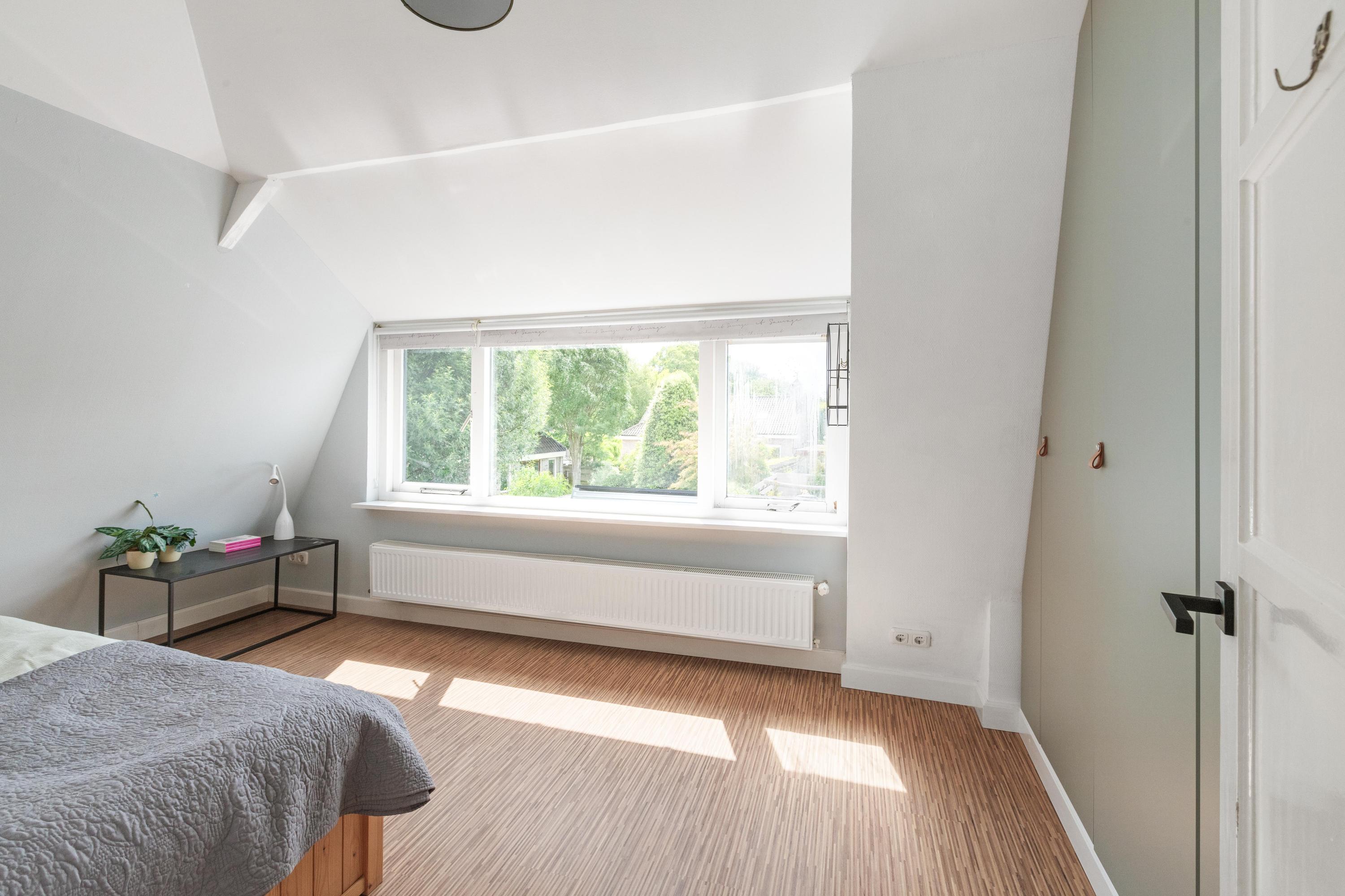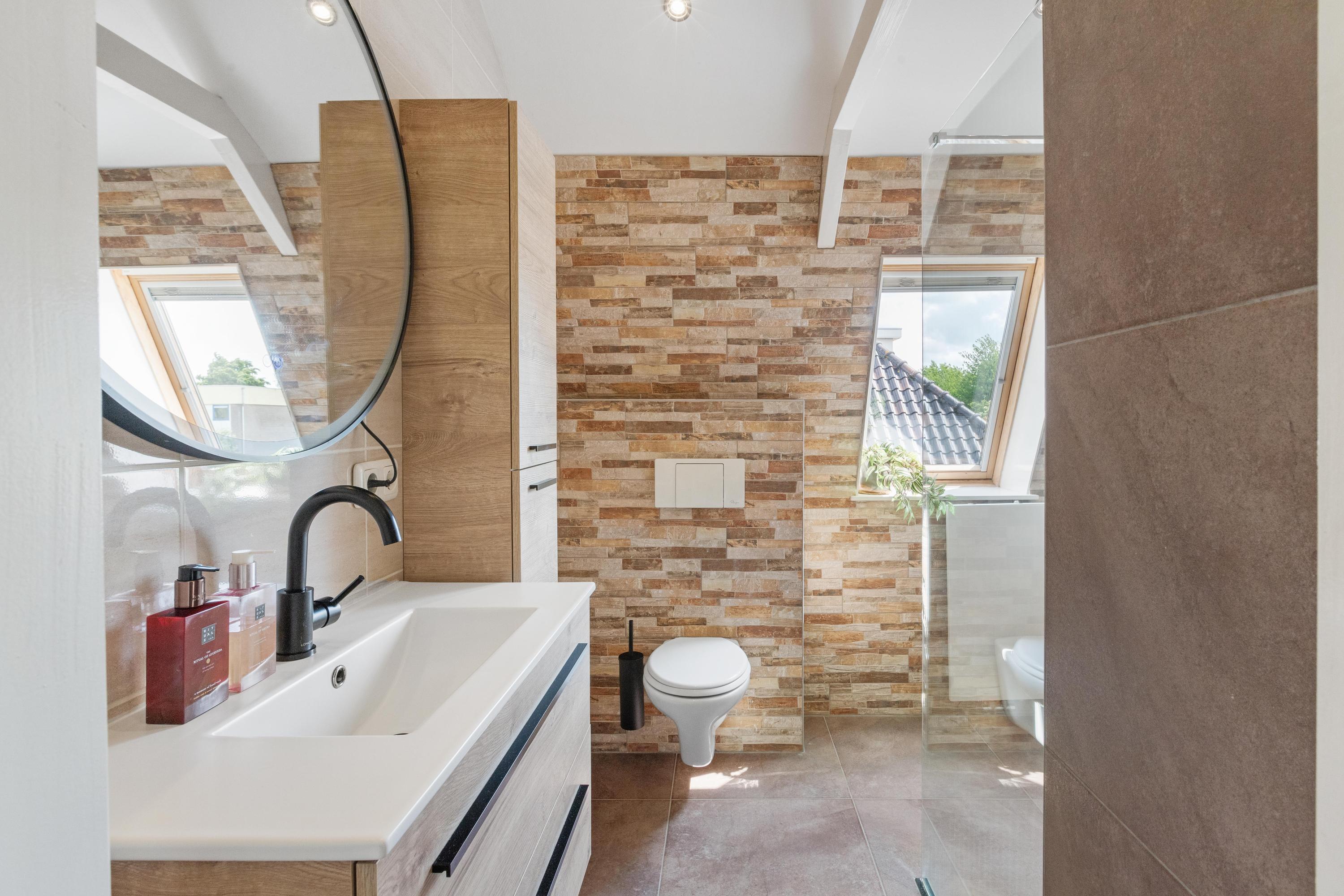 Eerste verdieping: Op de verdieping vind je twee slaapkamers, elk met een vaste kast. De slaapkamer aan de achterzijde is voorzien van een airco. De badkamer is luxe en modern uitgevoerd met vloerverwarming, een inloopdouche, toilet, wastafelmeubel, designradiator, spots en een dakraam voor extra daglicht en natuurlijke ventilatie. Verder tref je op de verdieping de cv-ruimte.