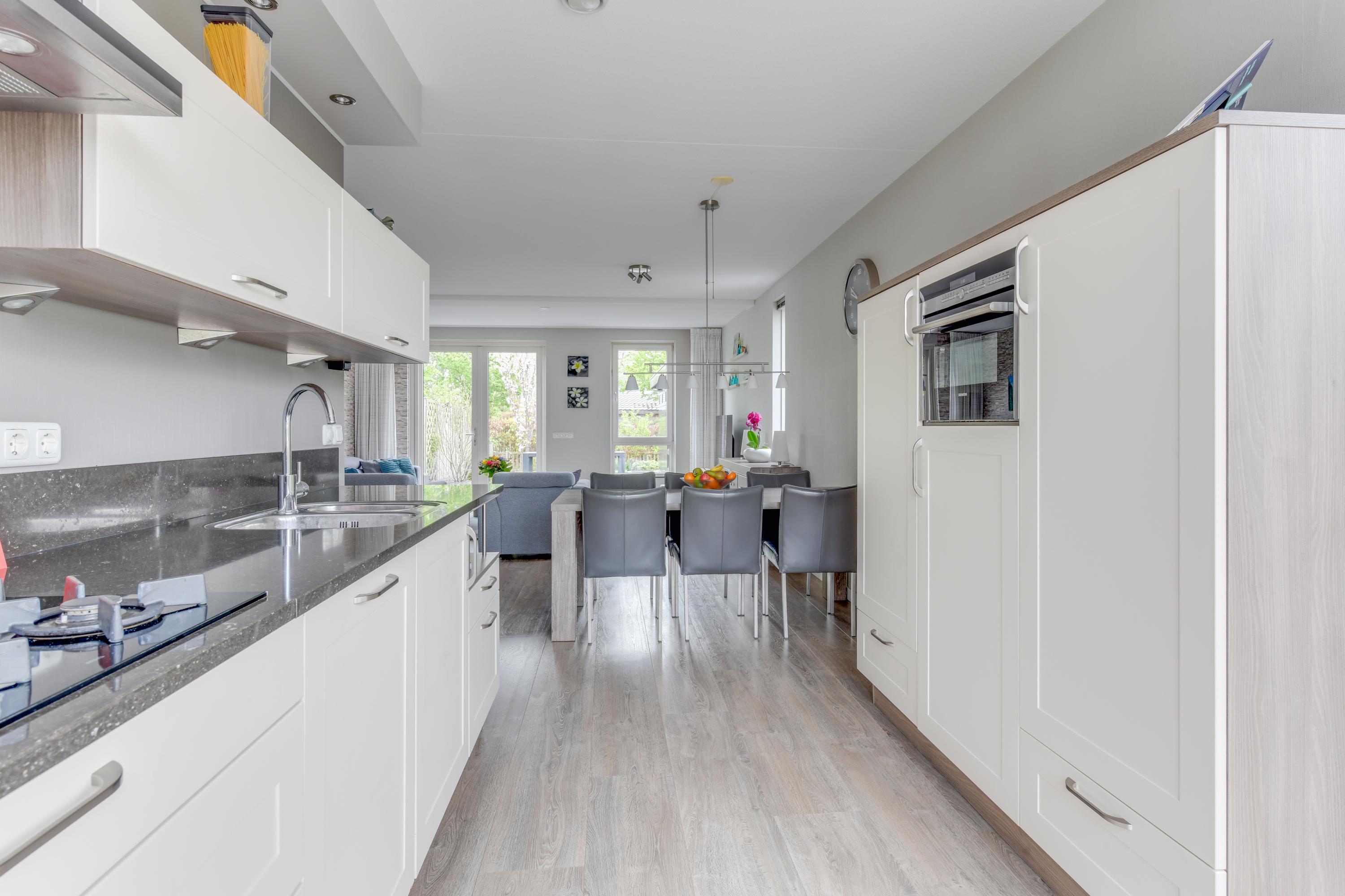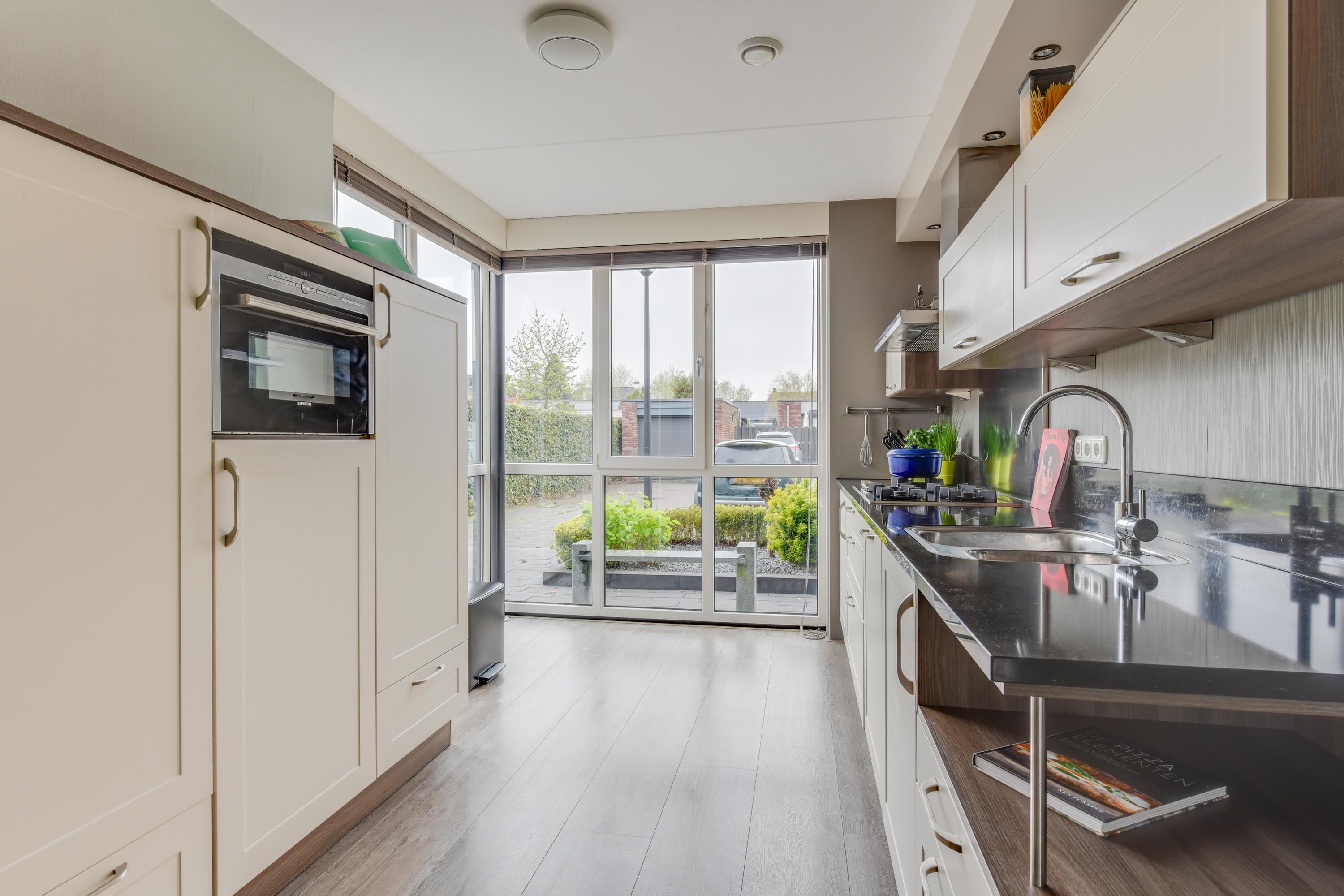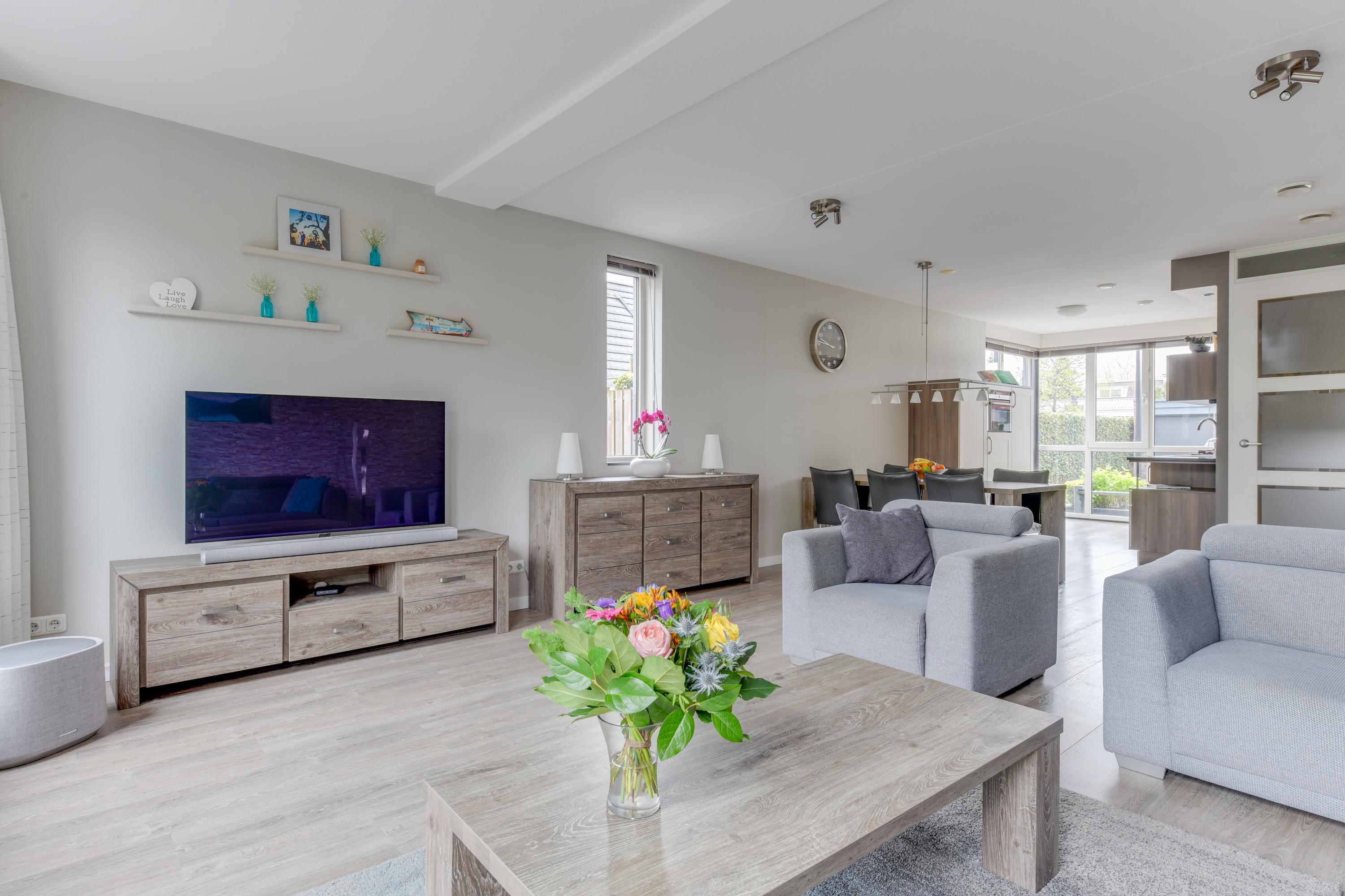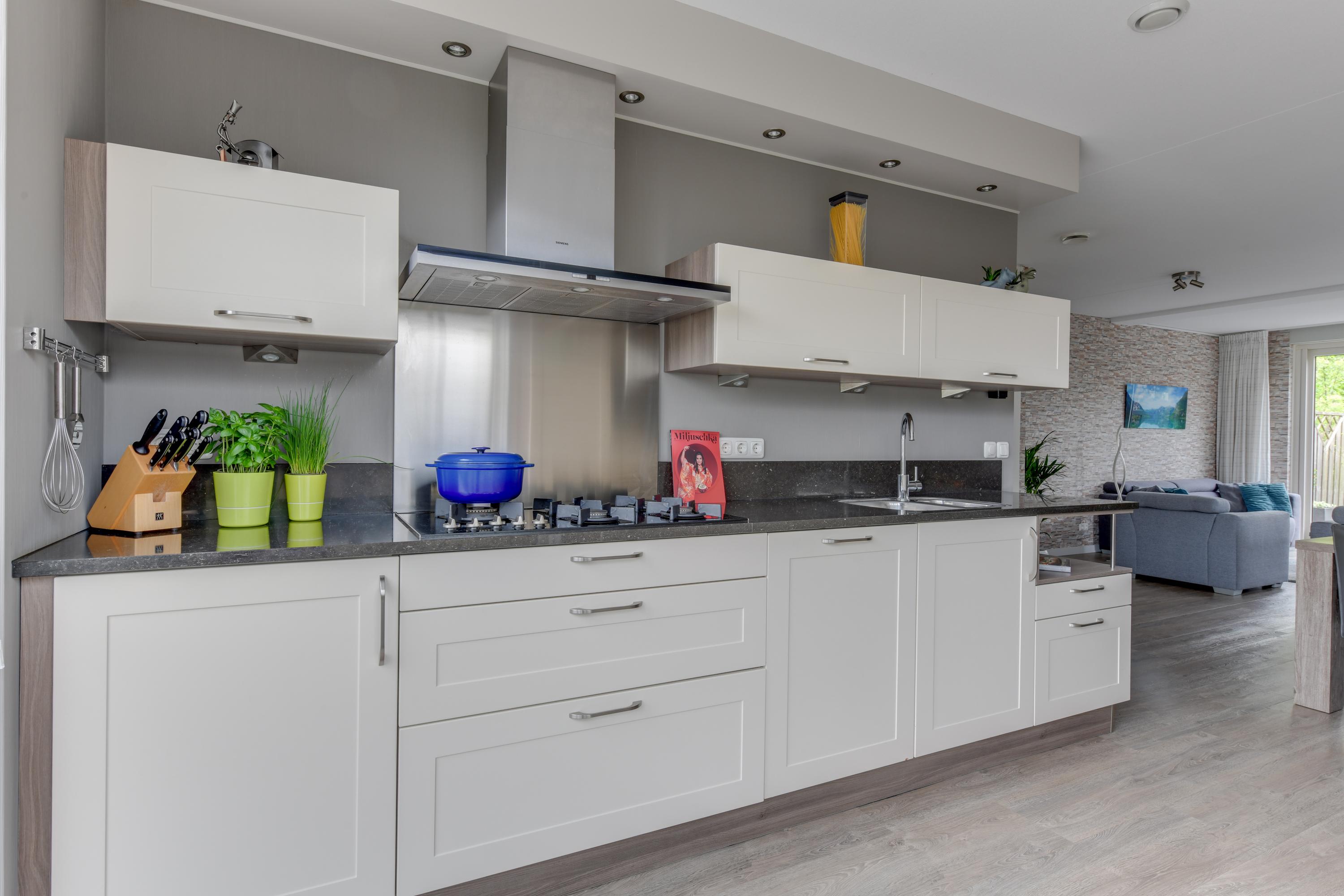 Entree met meterkast en toilet. Ruime, uitgebouwde woonkamer met trapkast, laminaatvloer met mooie brede planken en dubbele deuren naar tuin. Aan de voorzijde ligt de lichte keuken, voorzien van 5-pits gasfornuis, vaatwasser, combi-oven, koelkast, grote vriezer, afzuigkap, spoelbak en extra kastenwand.