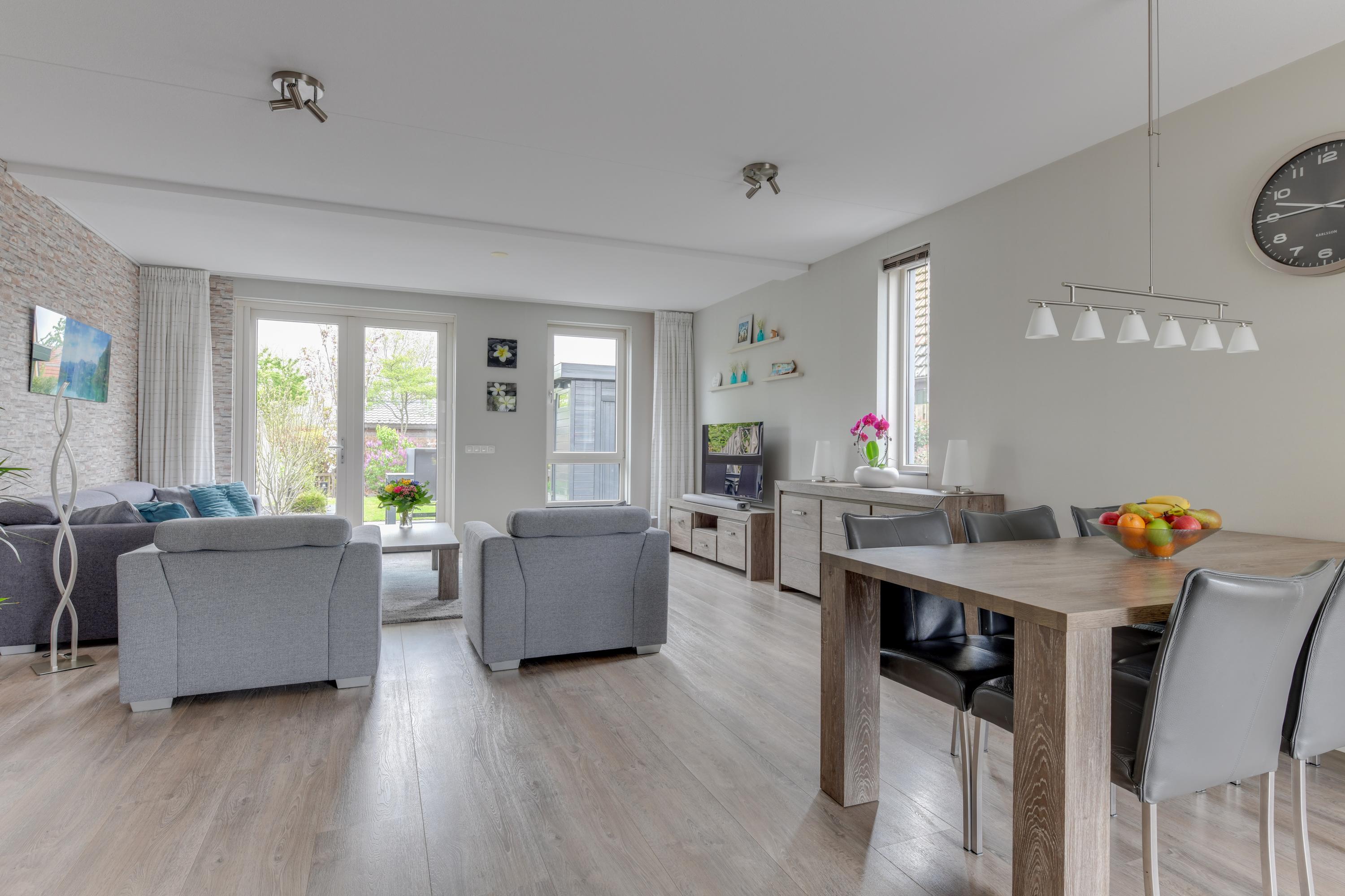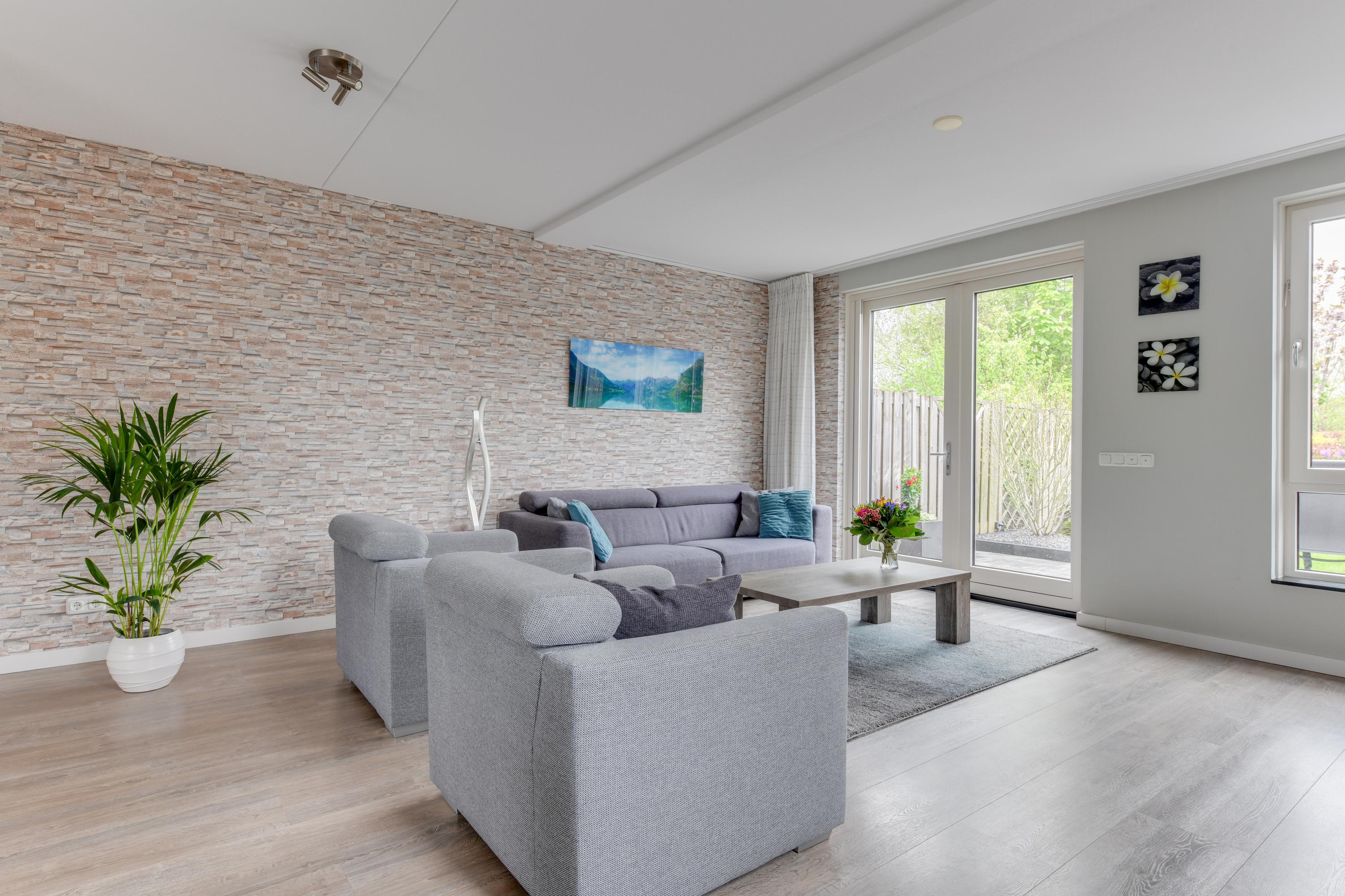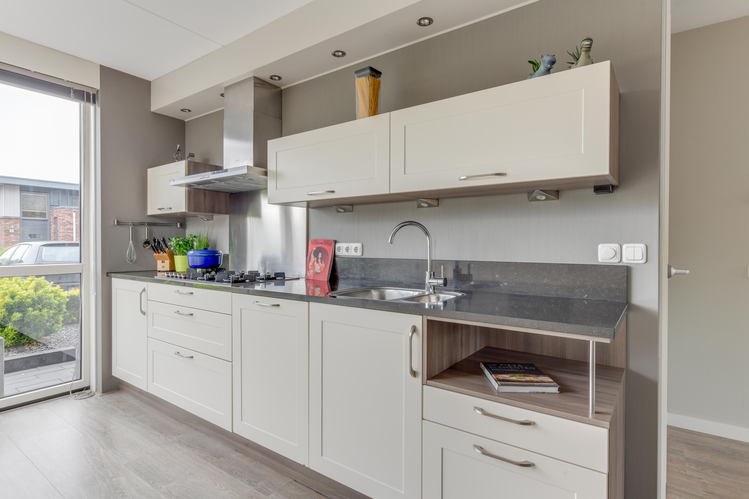 Entree met meterkast en toilet. Ruime, uitgebouwde woonkamer met trapkast, laminaatvloer met mooie brede planken en dubbele deuren naar tuin. Aan de voorzijde ligt de lichte keuken, voorzien van 5-pits gasfornuis, vaatwasser, combi-oven, koelkast, grote vriezer, afzuigkap, spoelbak en extra kastenwand.