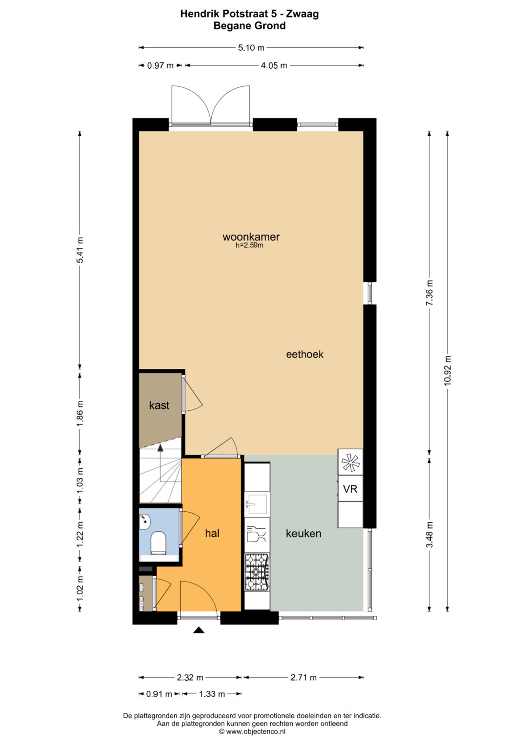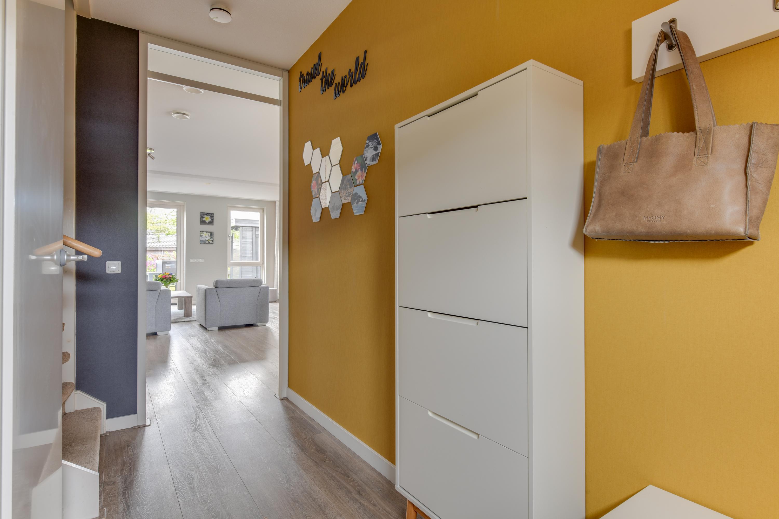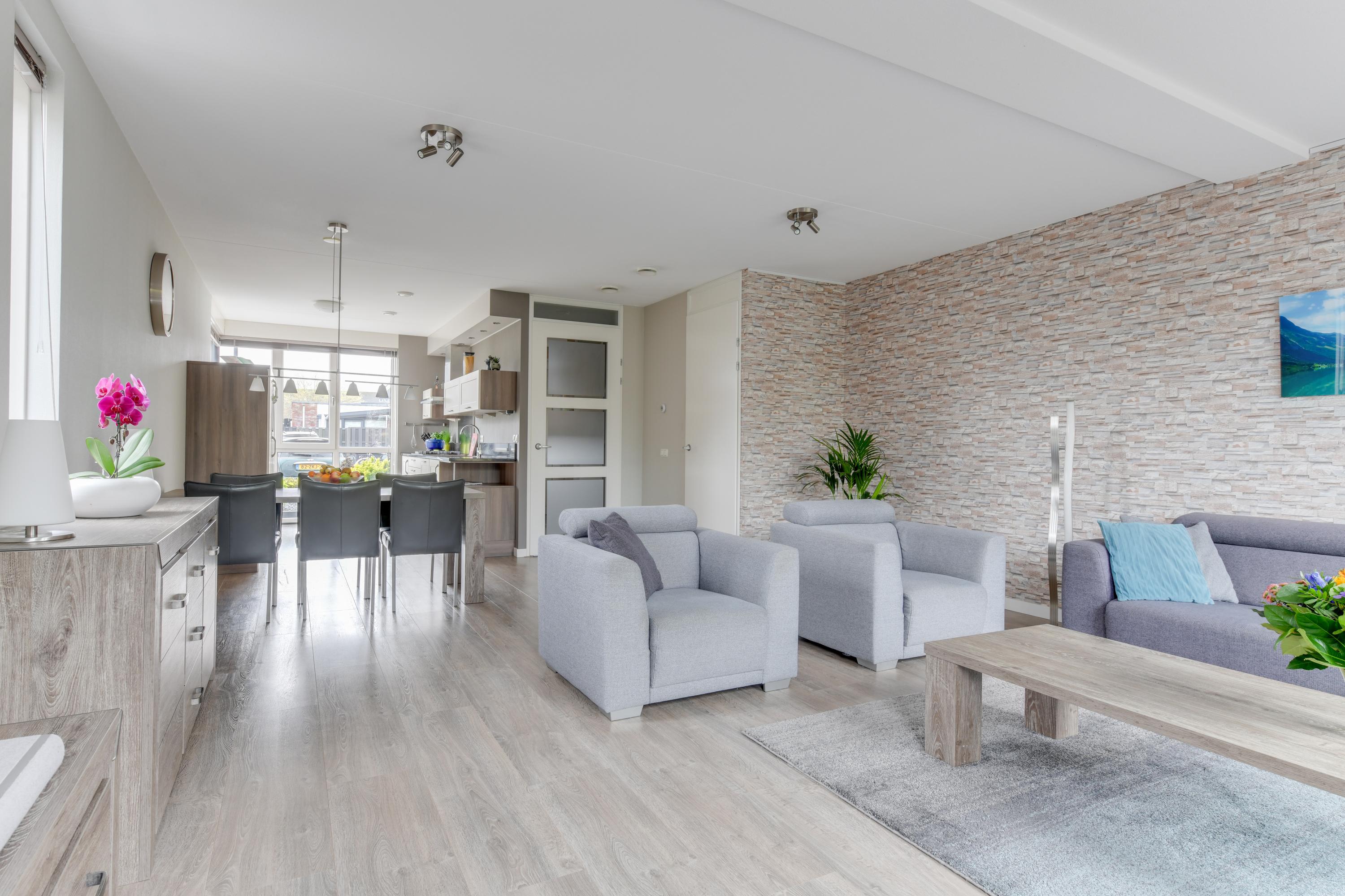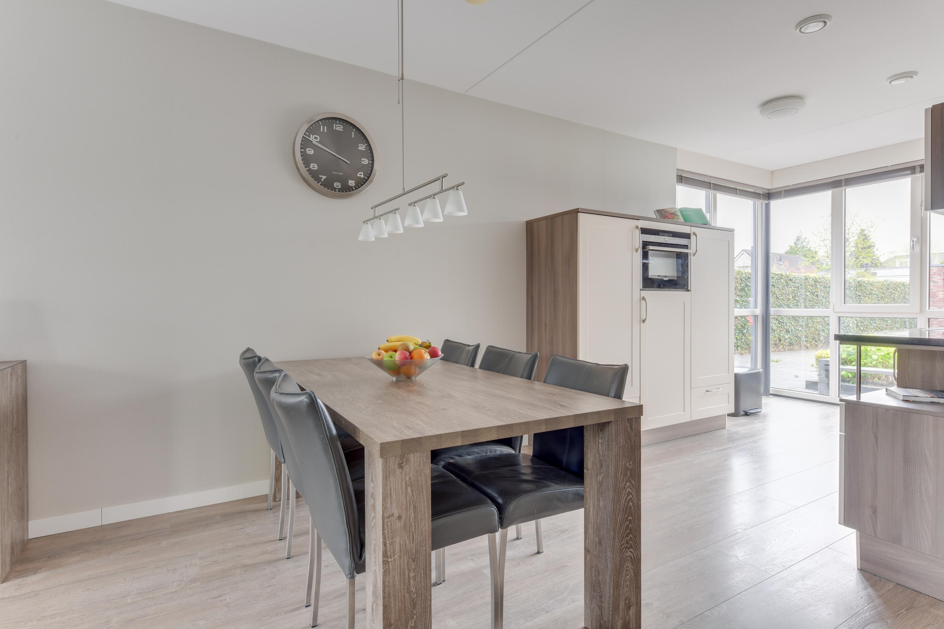 Entree met meterkast en toilet. Ruime, uitgebouwde woonkamer met trapkast, laminaatvloer met mooie brede planken en dubbele deuren naar tuin. Aan de voorzijde ligt de lichte keuken, voorzien van 5-pits gasfornuis, vaatwasser, combi-oven, koelkast, grote vriezer, afzuigkap, spoelbak en extra kastenwand.