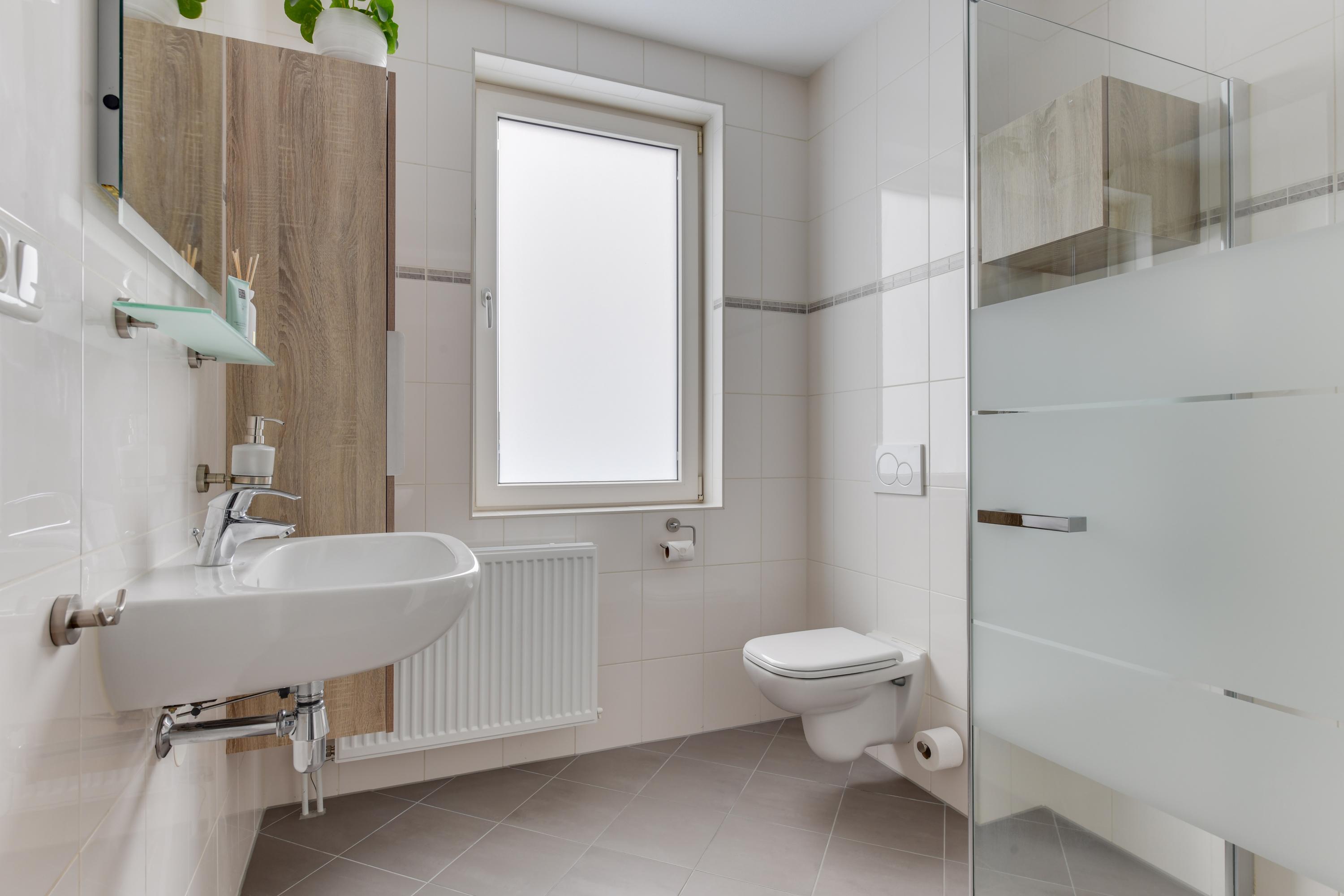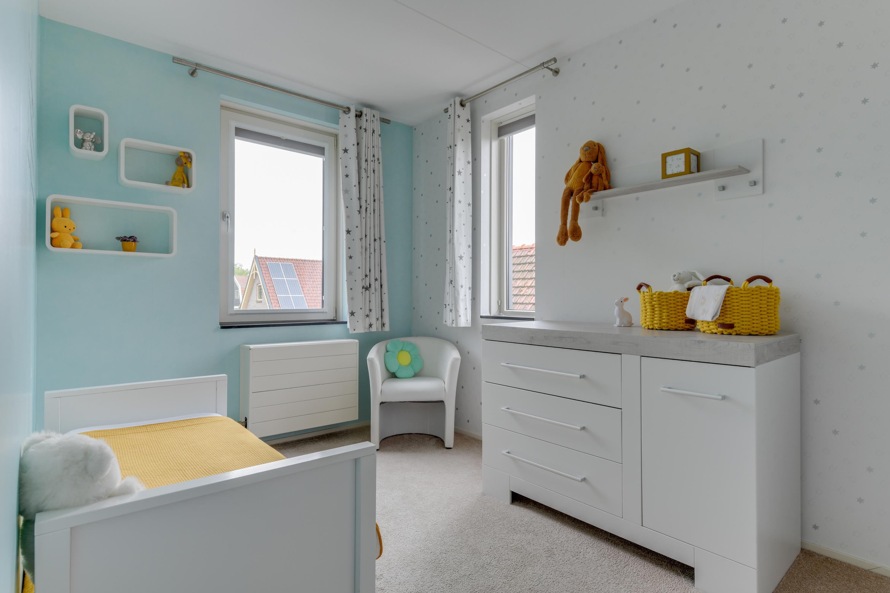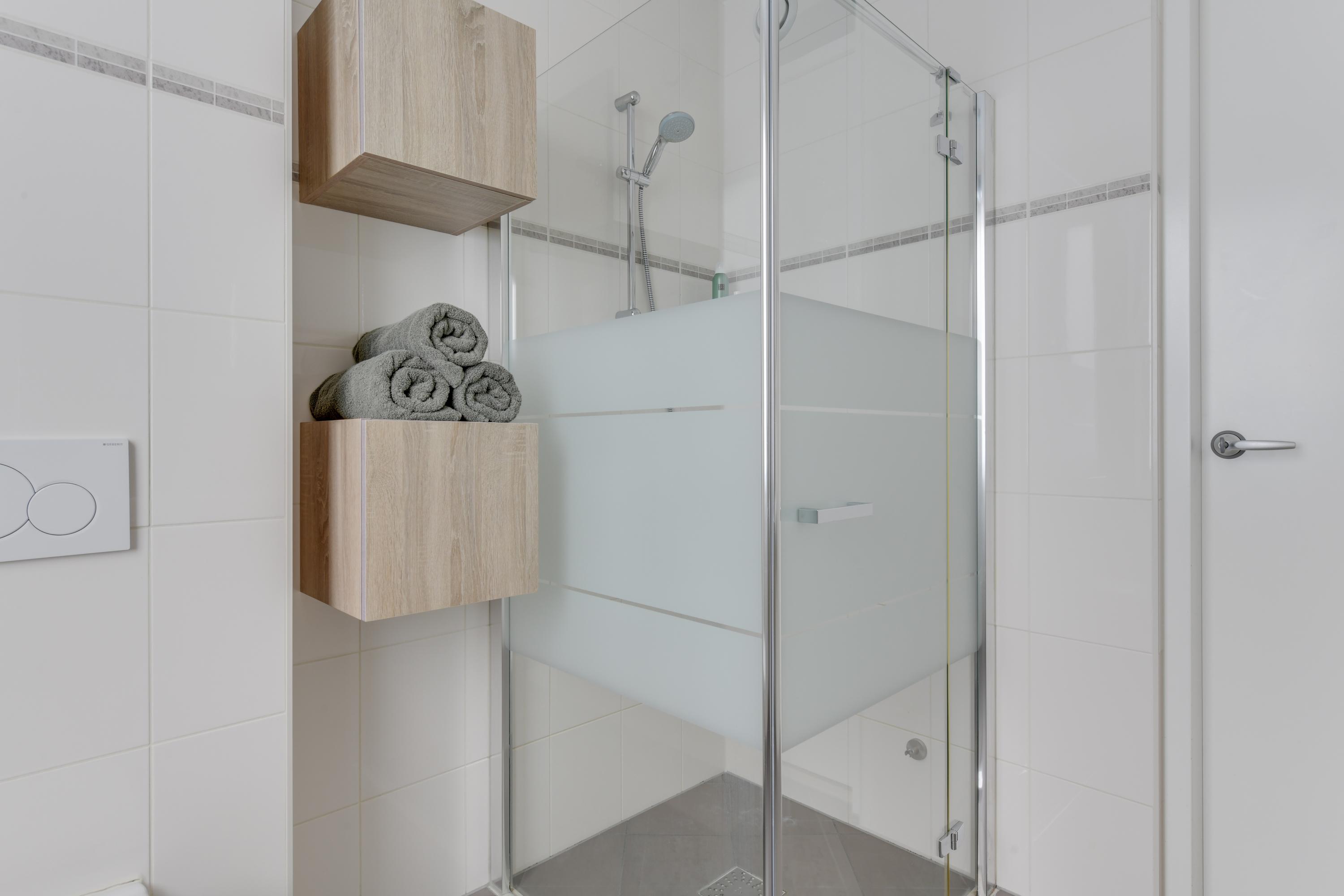 Overloop met toegang tot drie slaapkamers, twee voorzien van kunststof kozijnen en luxaflex en een slaapkamer met duette gordijnen. Badkamer met douchecabine, toilet, wastafelmeubel, groot raam voor natuurlijk licht en ventilatie en vloerverwarming.