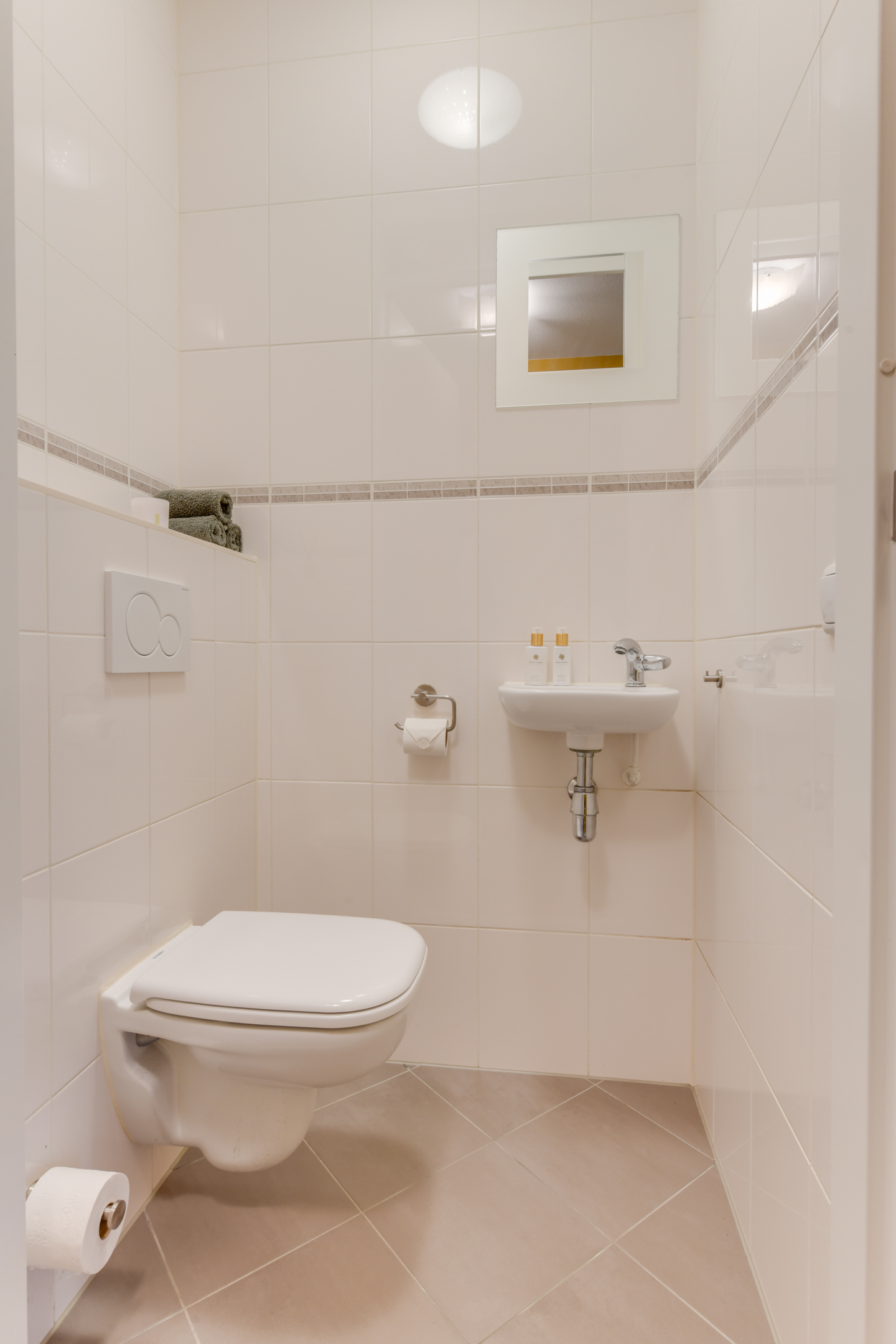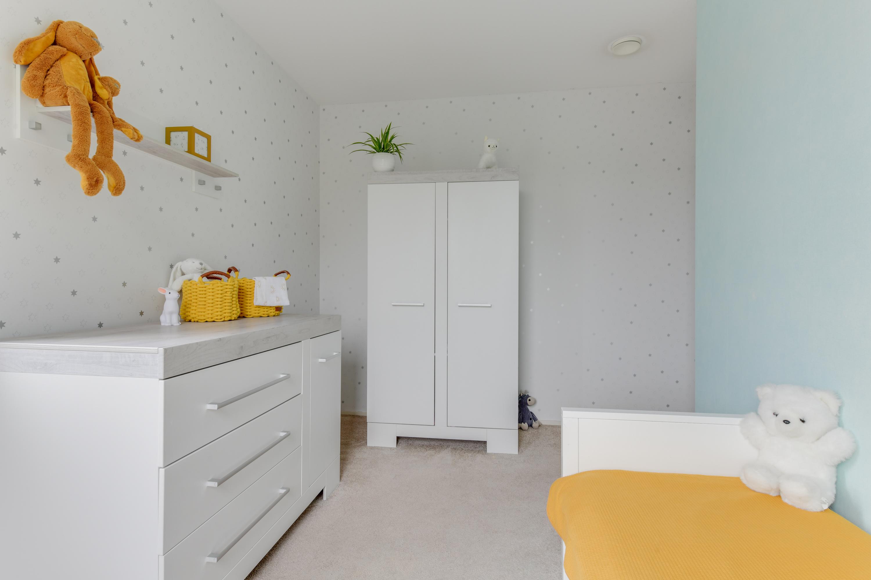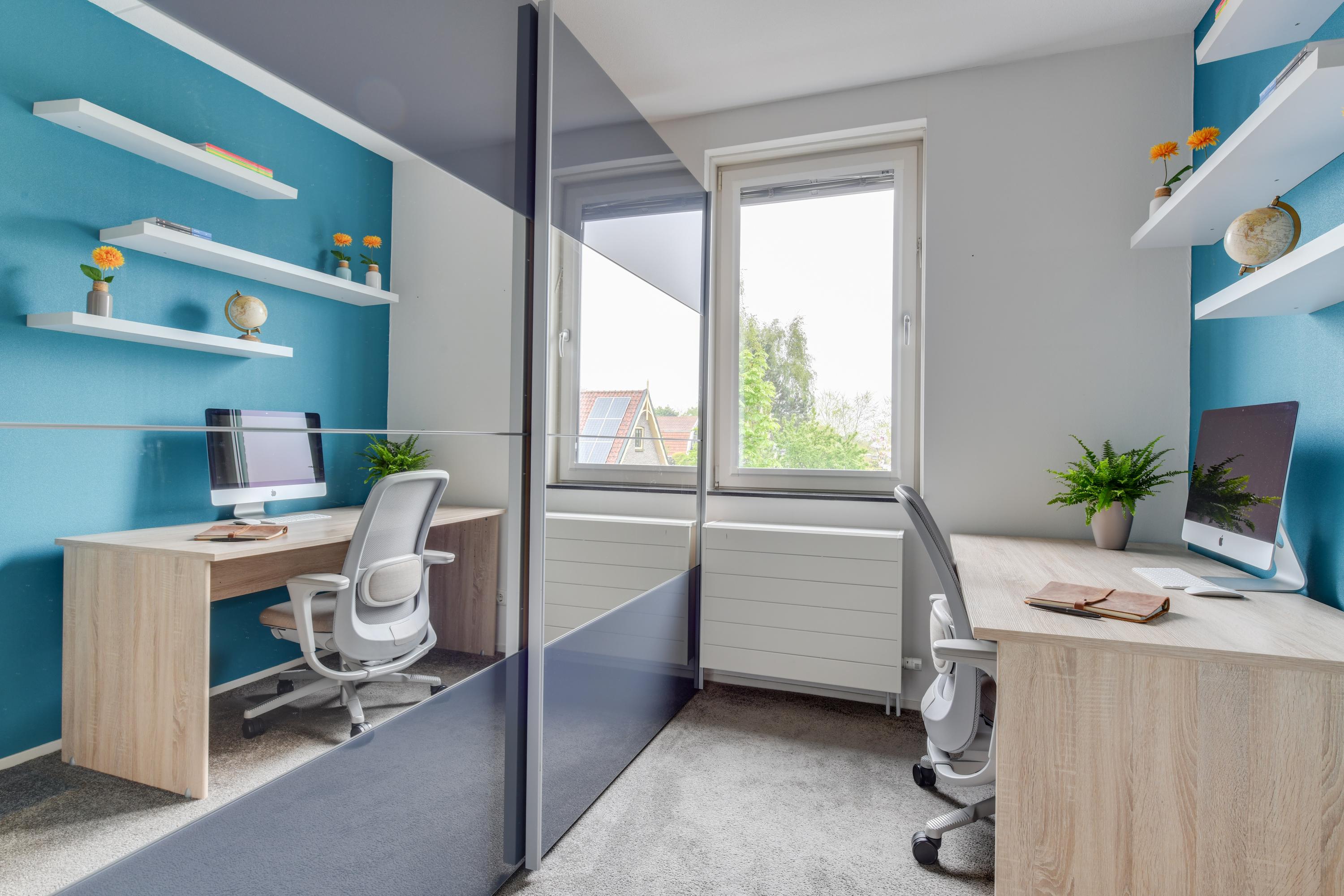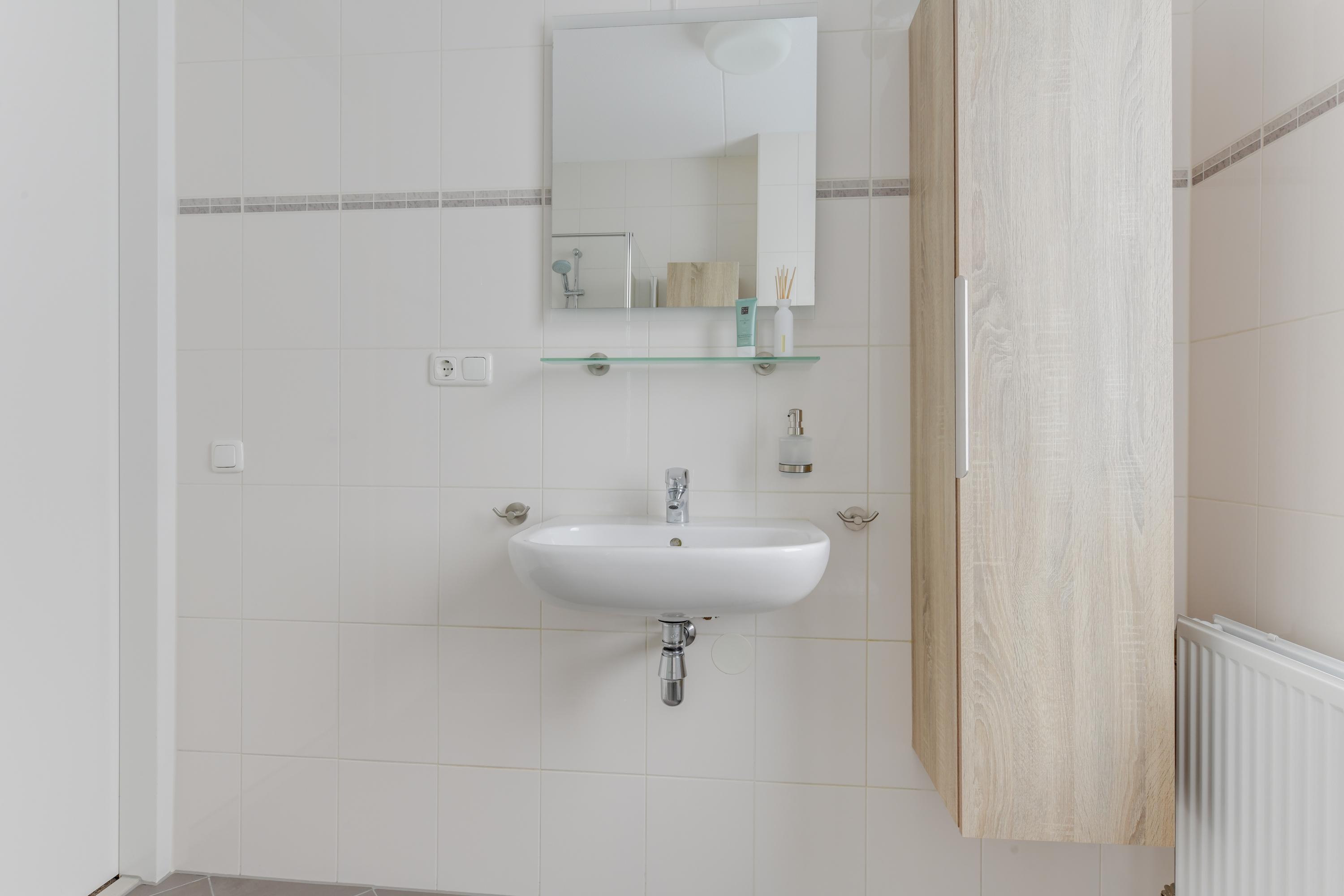 Overloop met toegang tot drie slaapkamers, twee voorzien van kunststof kozijnen en luxaflex en een slaapkamer met duette gordijnen. Badkamer met douchecabine, toilet, wastafelmeubel, groot raam voor natuurlijk licht en ventilatie en vloerverwarming.