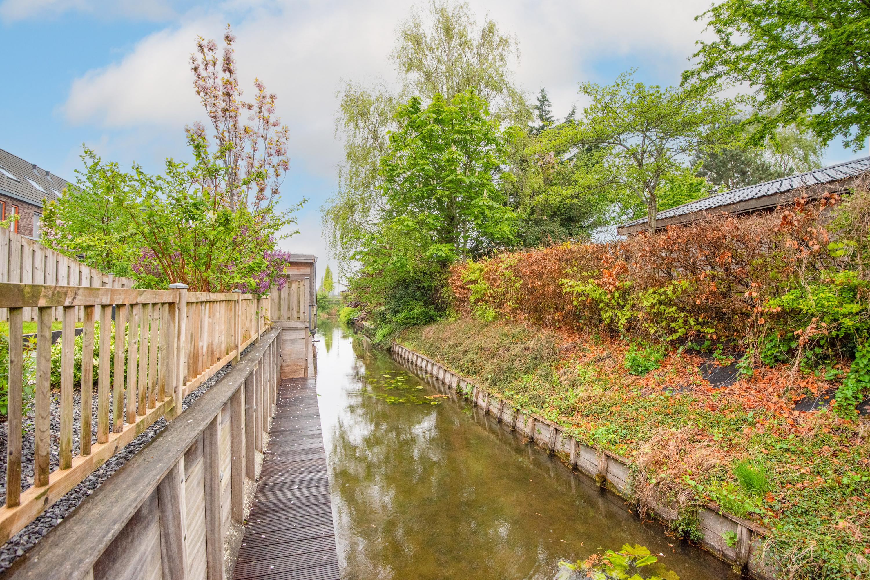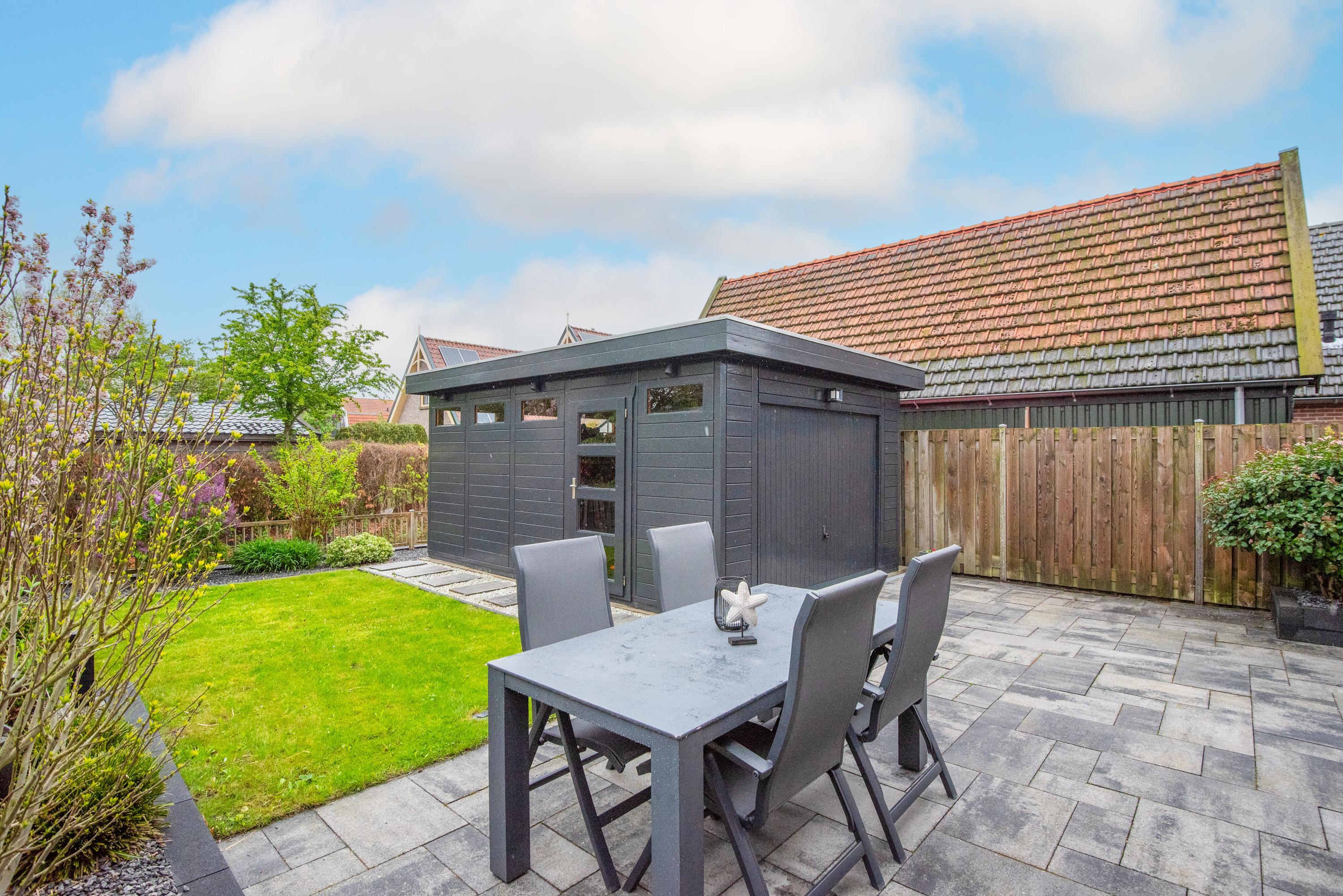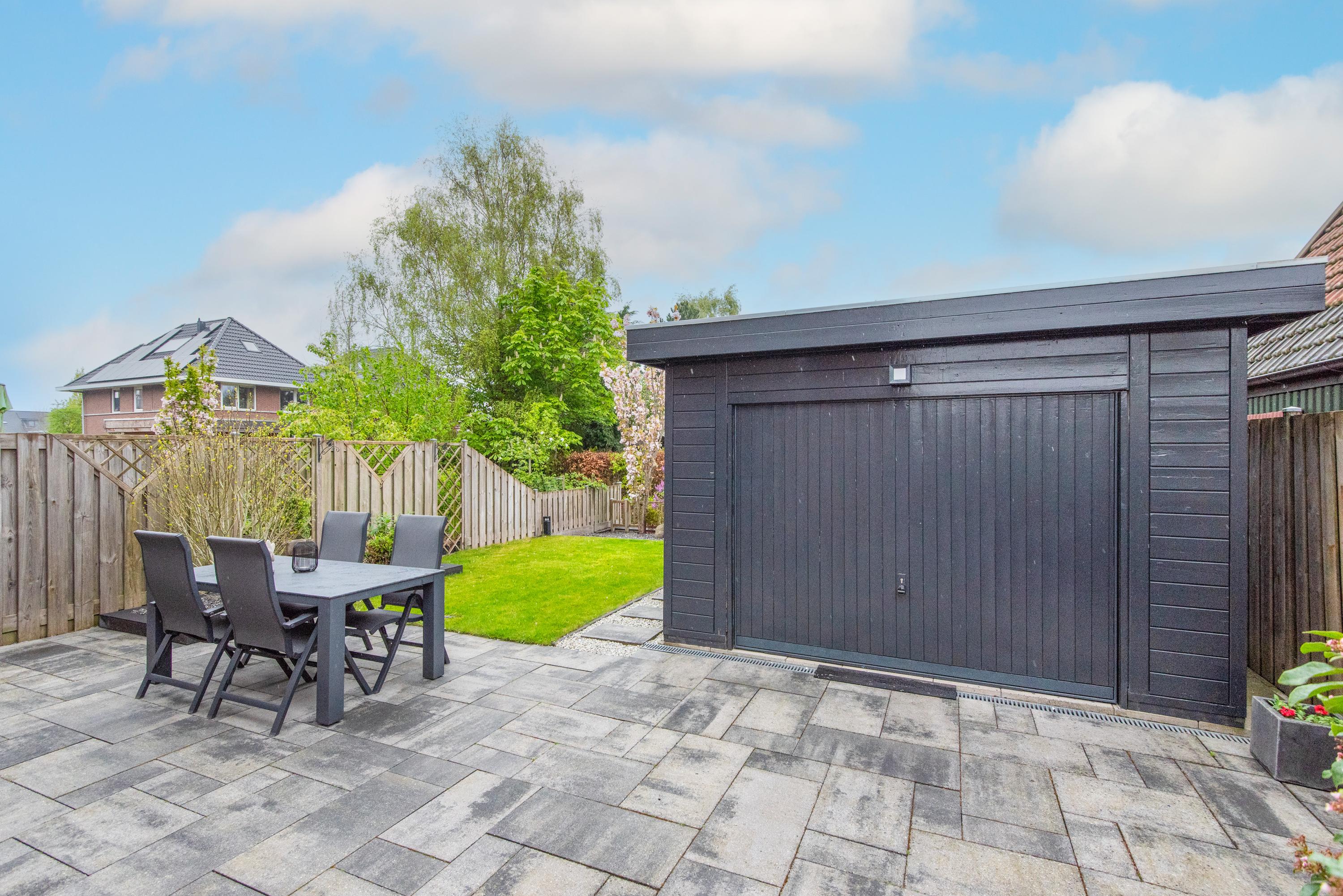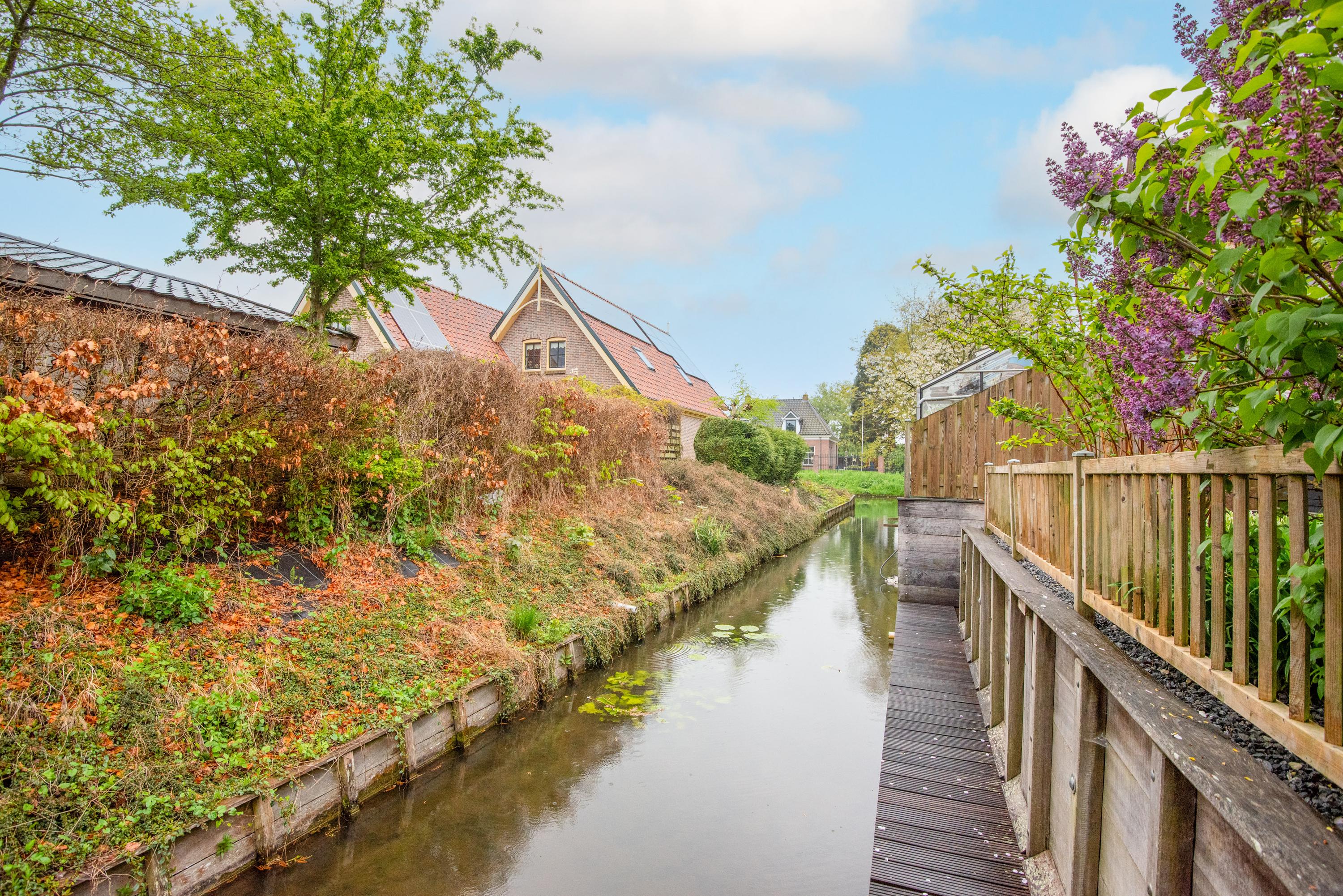 Fraai aangelegde achtertuin op het noordoosten met vlonder aan het water, buitenkraan en vrijstaande houten garage met elektra. Eigen oprit met plaats voor twee auto’s.