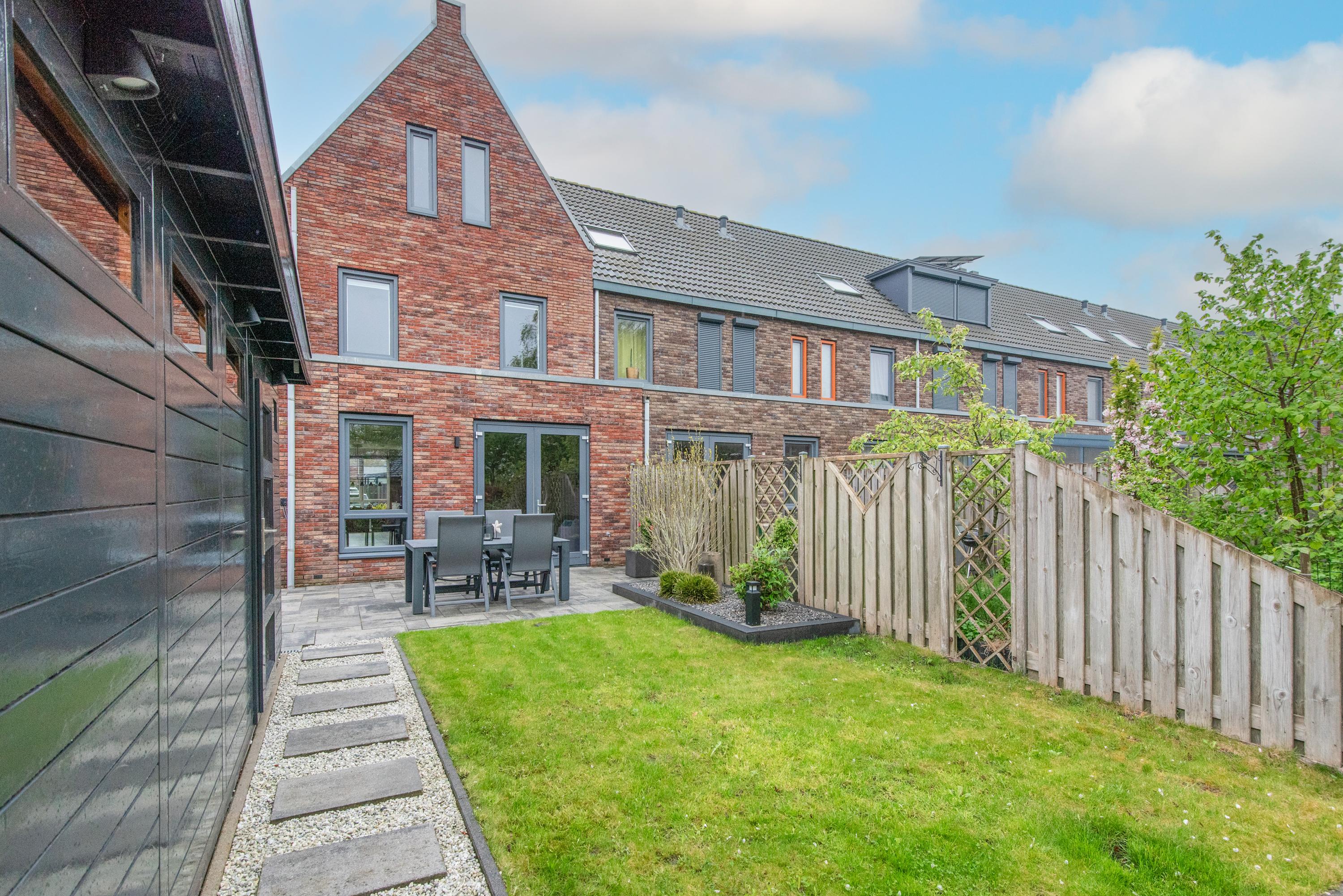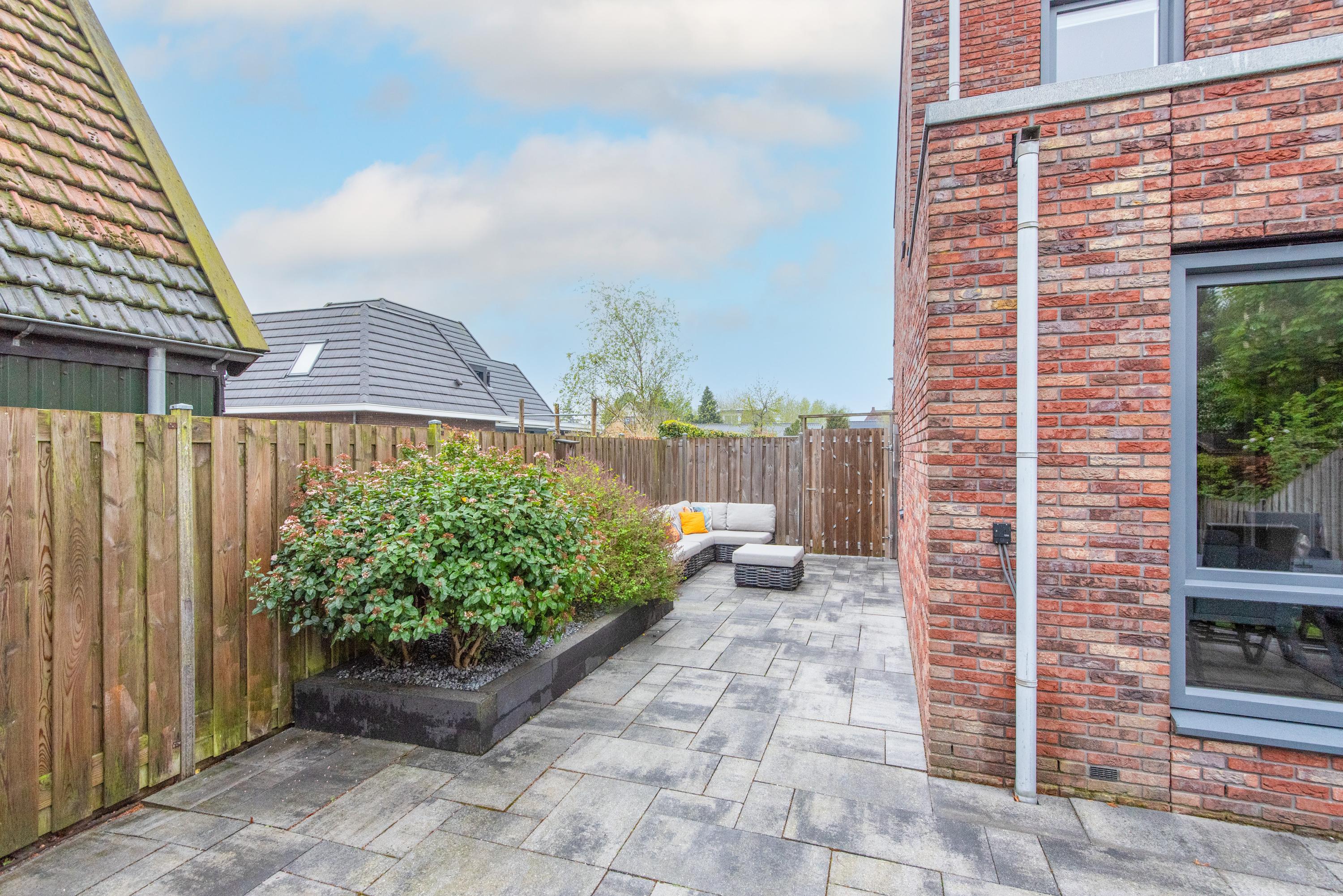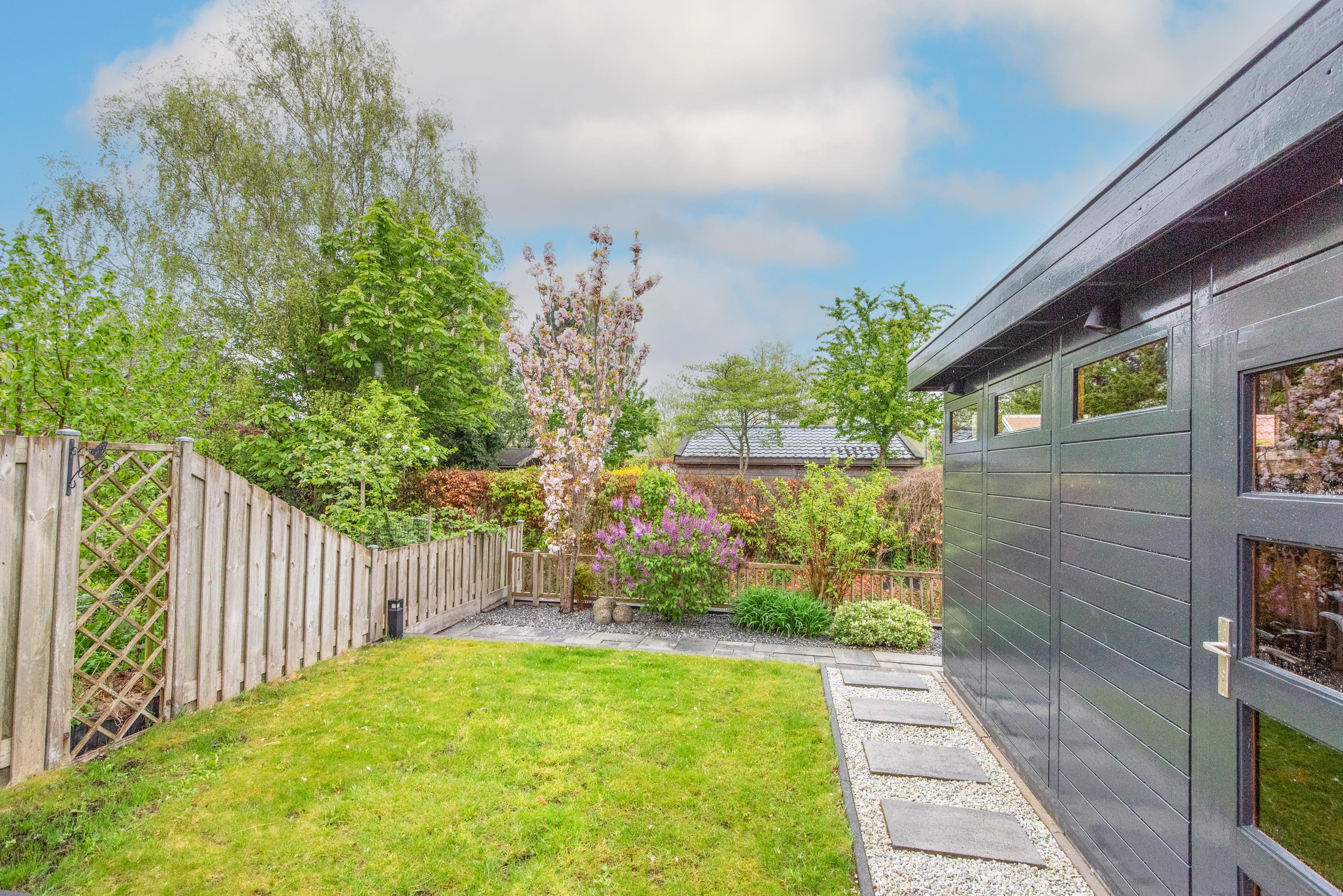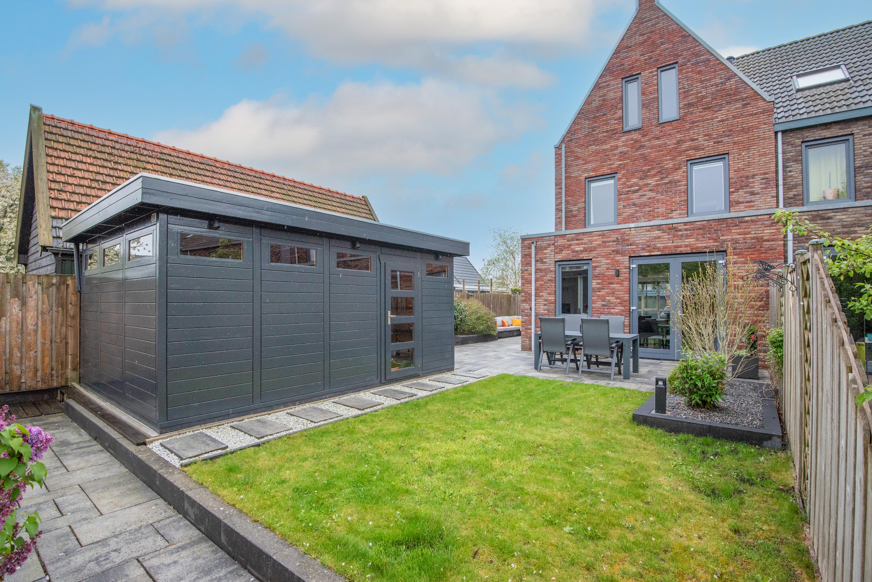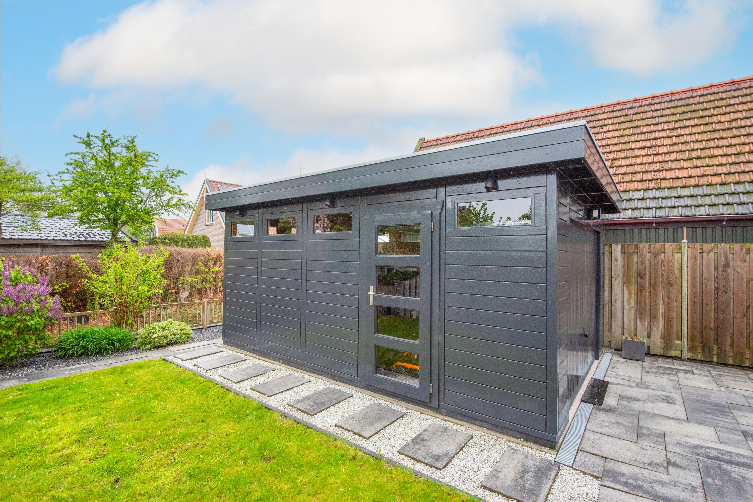 Fraai aangelegde achtertuin op het noordoosten met vlonder aan het water, buitenkraan en vrijstaande houten garage met elektra. Eigen oprit met plaats voor twee auto’s.