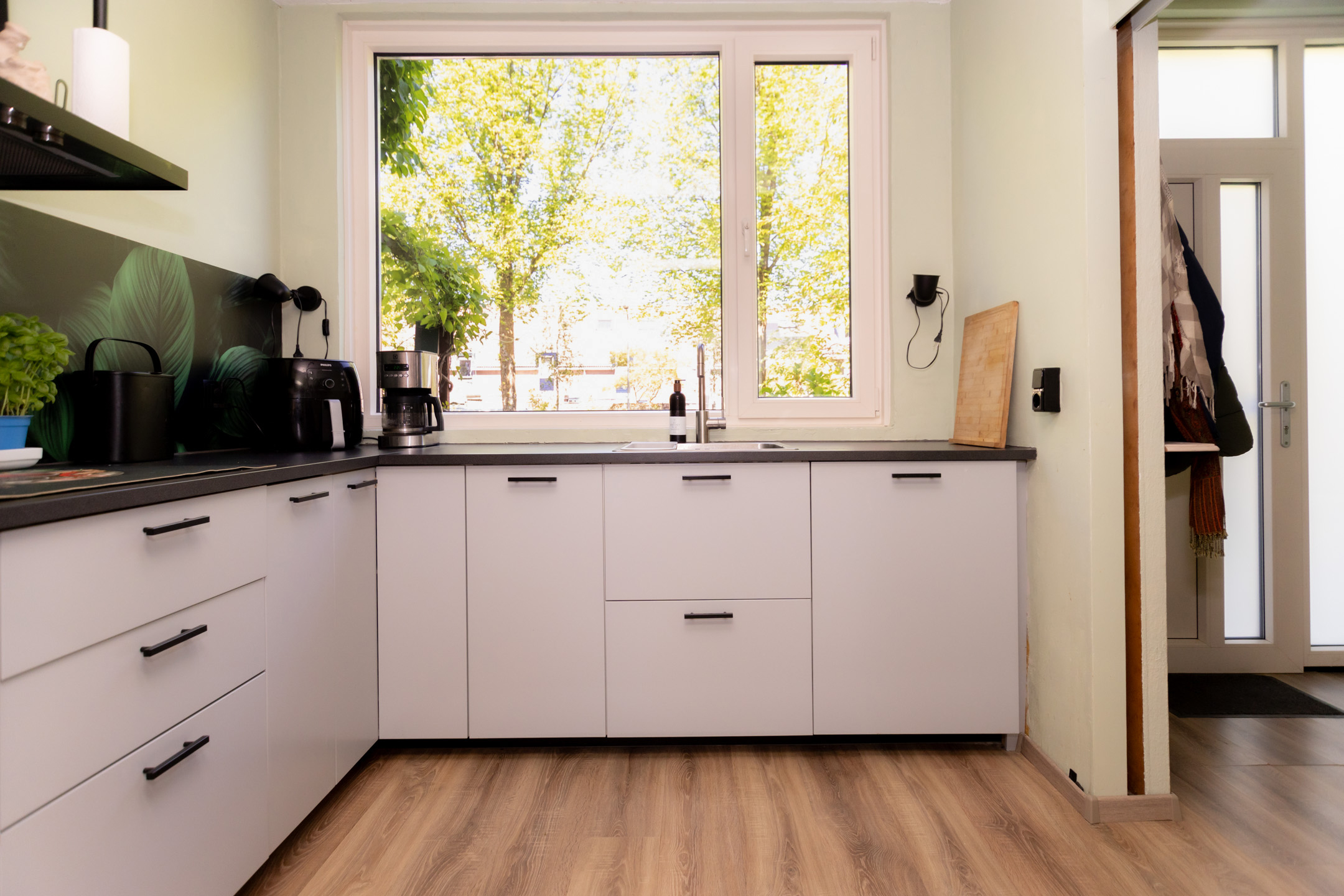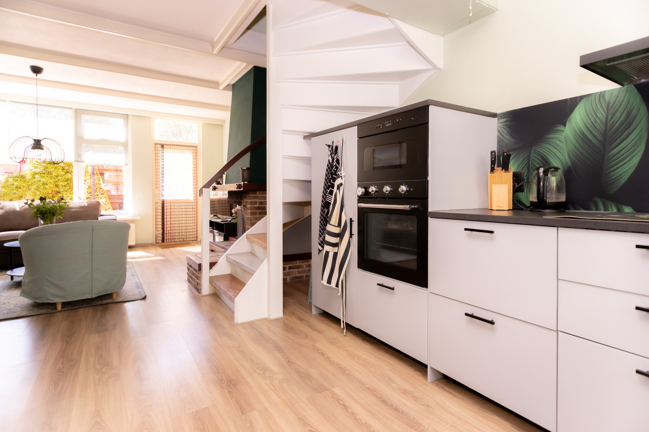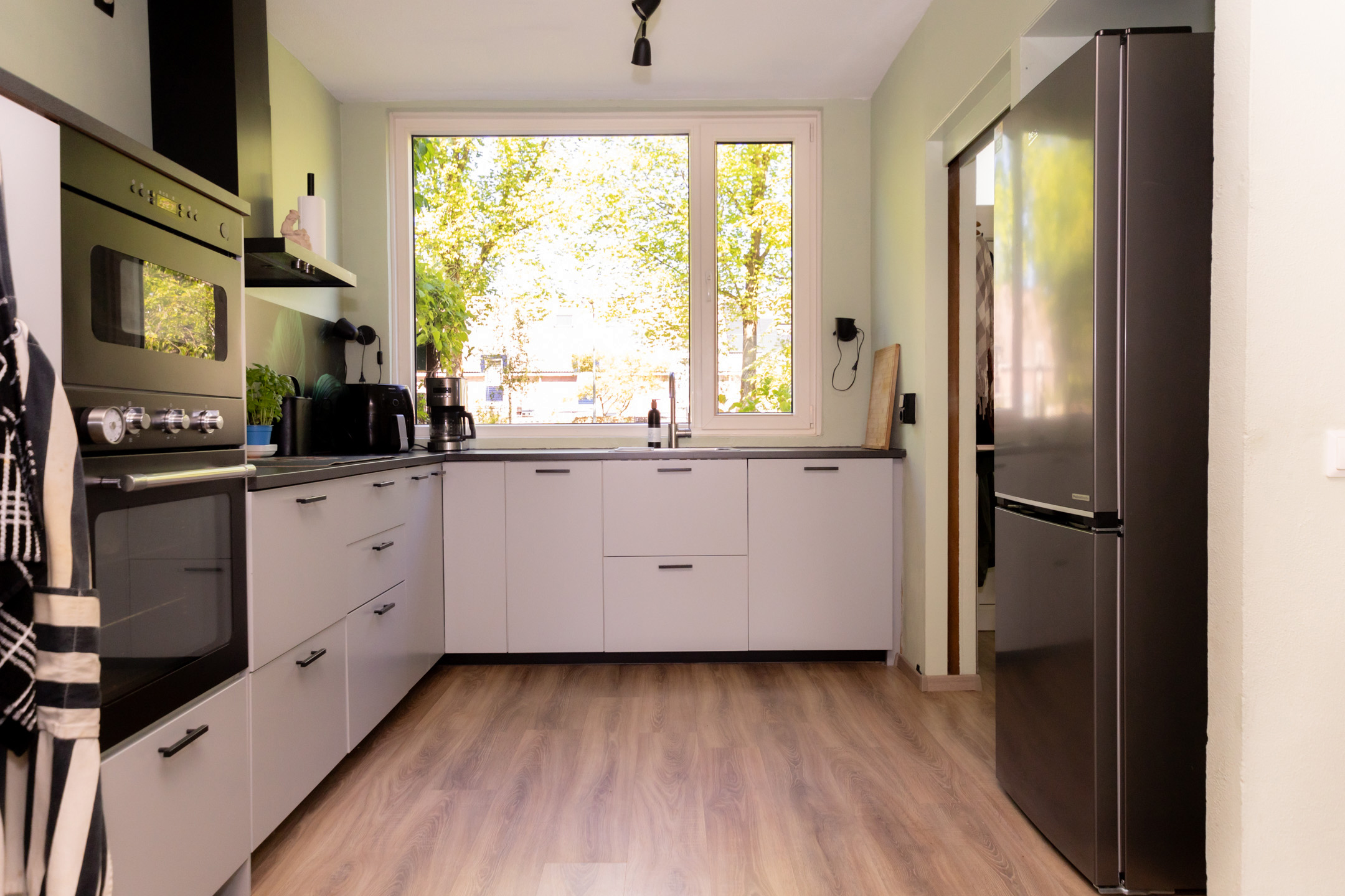 Entree, hal met meterkast, toiletruimte en toegang tot de vernieuwde keuken (2022). De keuken is modern en compleet uitgevoerd met een inductiekookplaat, afzuigkap, vaatwasser, oven, magnetron en voldoende kastruimte. De woonkamer is heerlijk licht dankzij de grote raampartijen en de combinatie van houten en kunststof kozijnen. De begane grond is afgewerkt met een nette laminaatvloer en strakke wandafwerking.