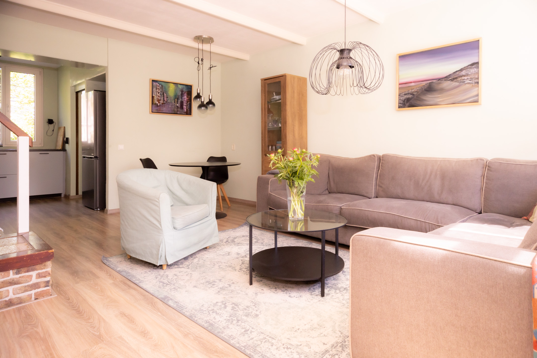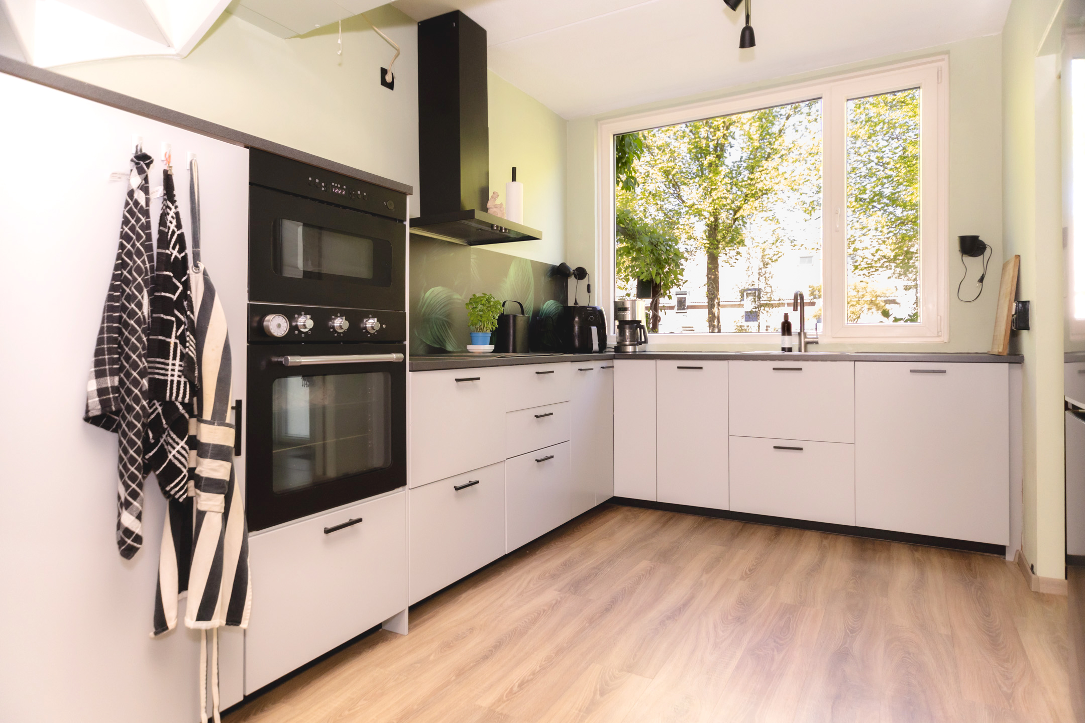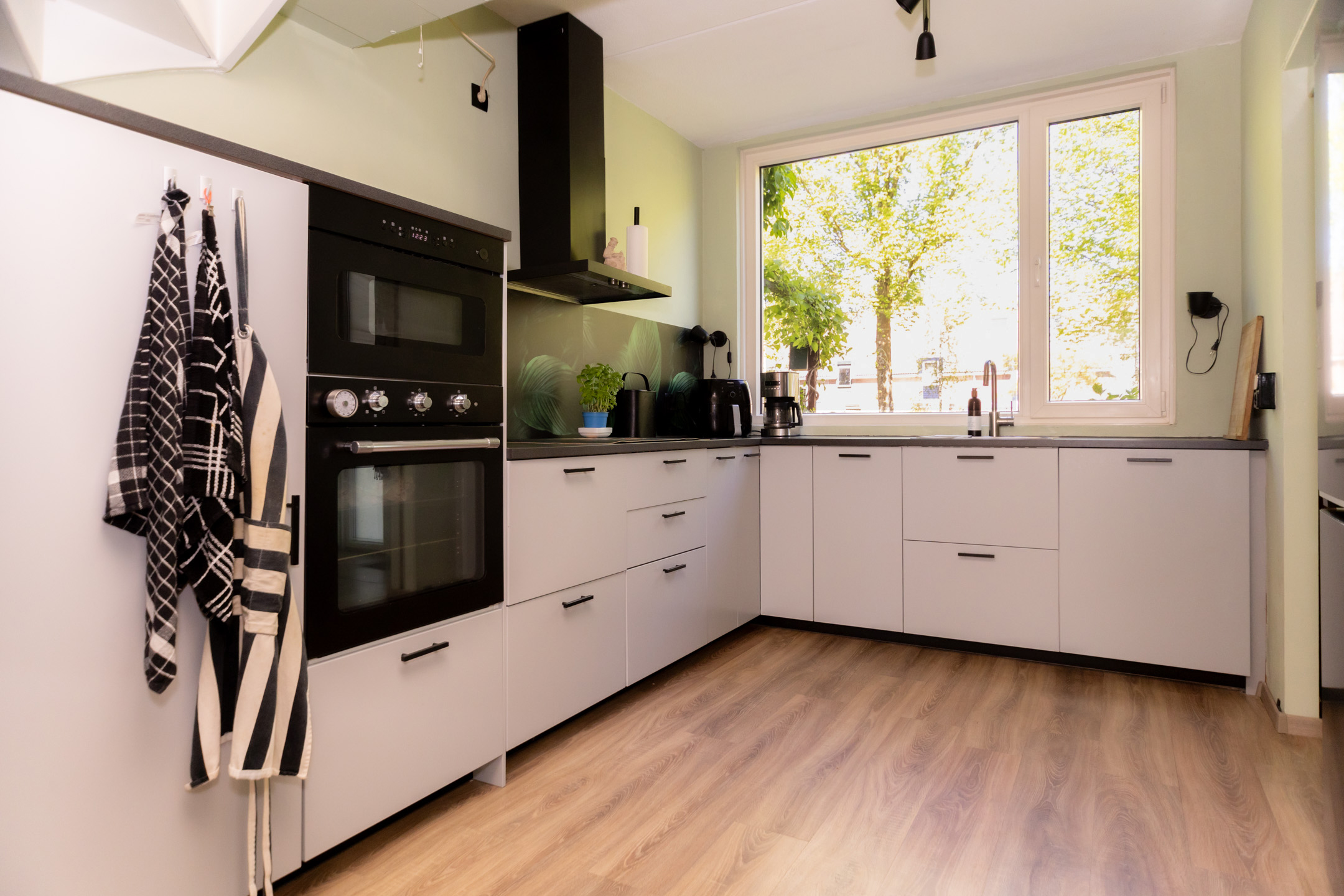 Entree, hal met meterkast, toiletruimte en toegang tot de vernieuwde keuken (2022). De keuken is modern en compleet uitgevoerd met een inductiekookplaat, afzuigkap, vaatwasser, oven, magnetron en voldoende kastruimte. De woonkamer is heerlijk licht dankzij de grote raampartijen en de combinatie van houten en kunststof kozijnen. De begane grond is afgewerkt met een nette laminaatvloer en strakke wandafwerking.