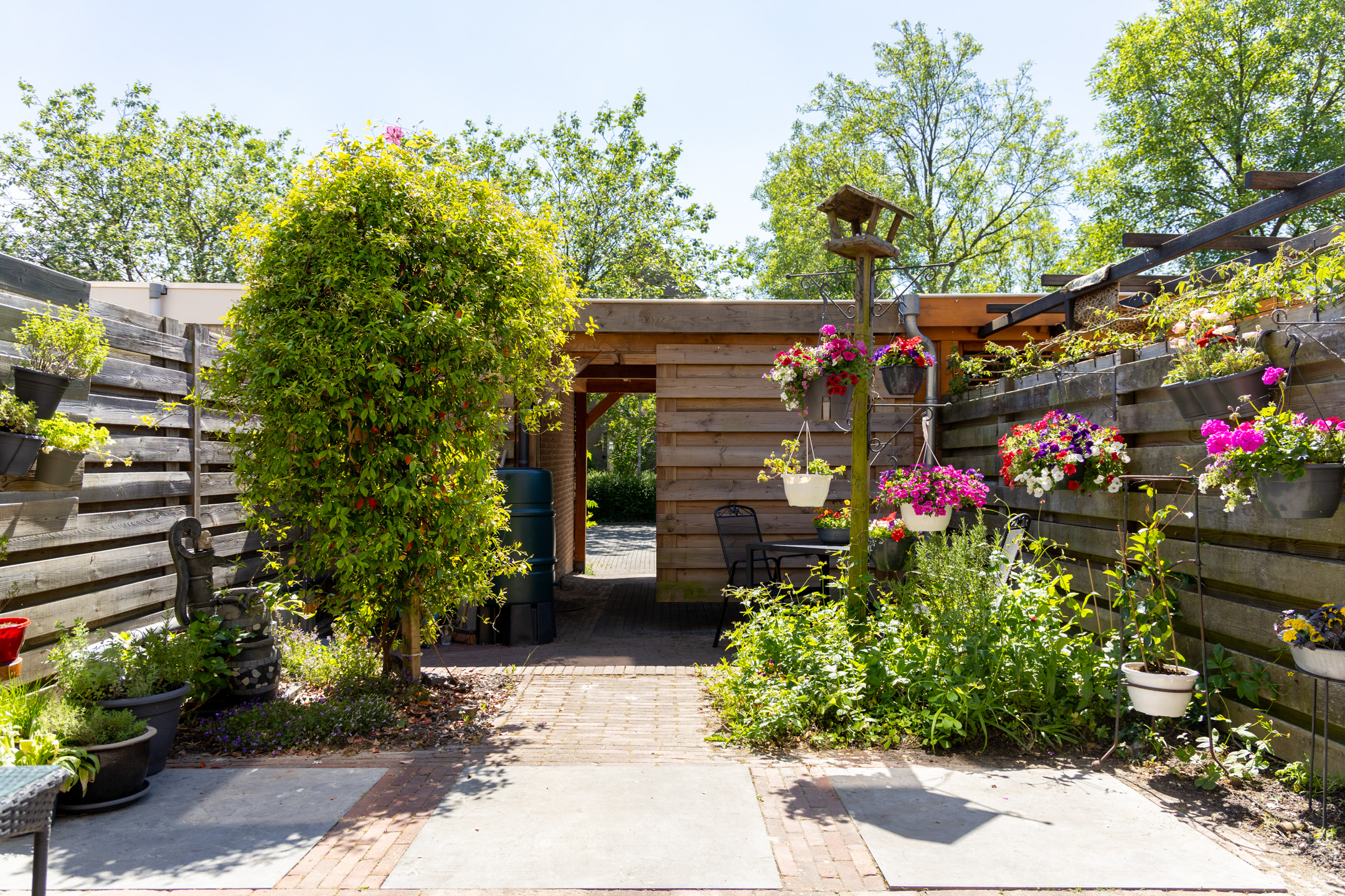 De zonnige tuin ligt op het zuiden, is netjes aangelegd en beschikt over een carport en vrijstaande stenen berging. Hier kun je genieten van de zon en het buitenleven, met voldoende privacy en ruimte.