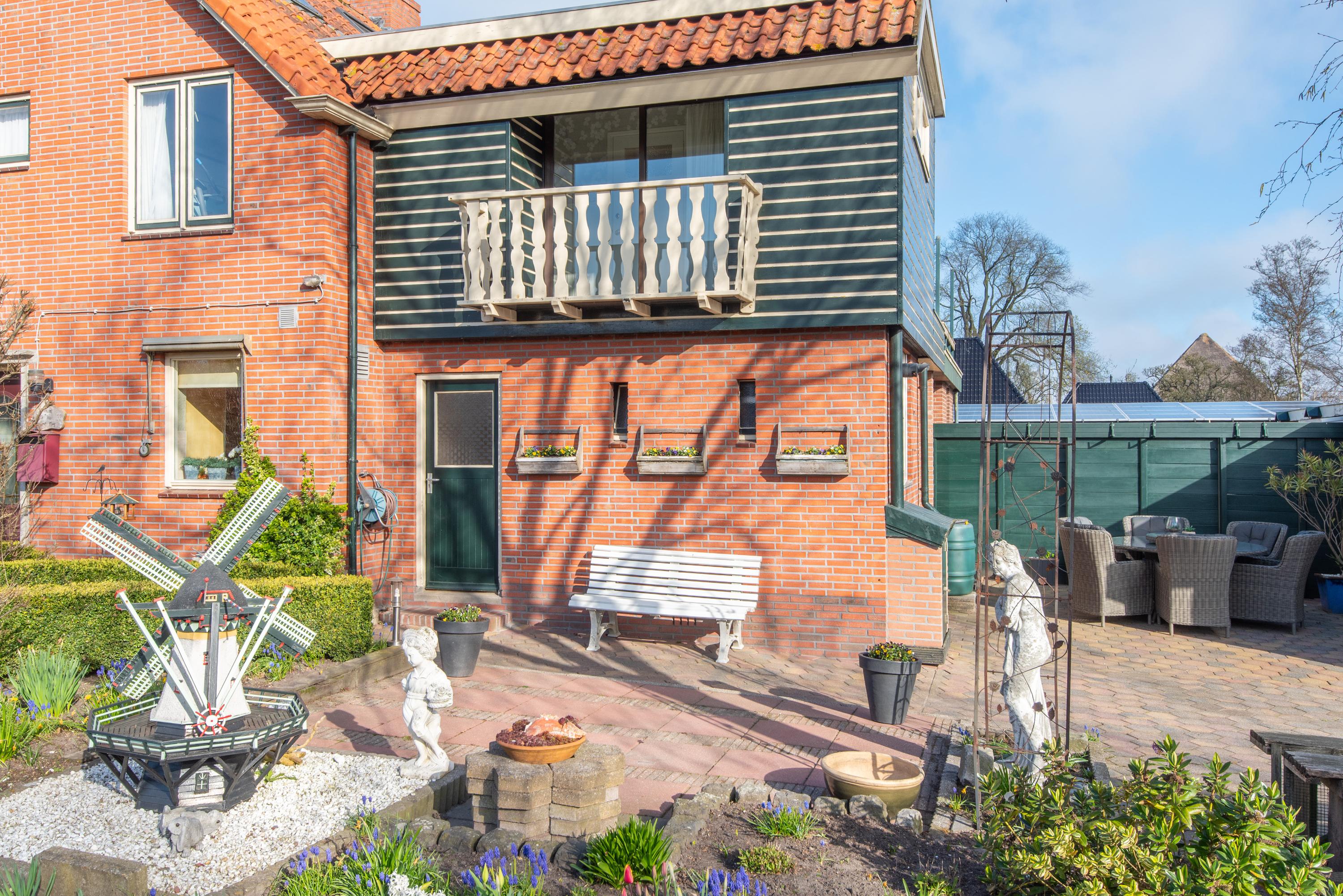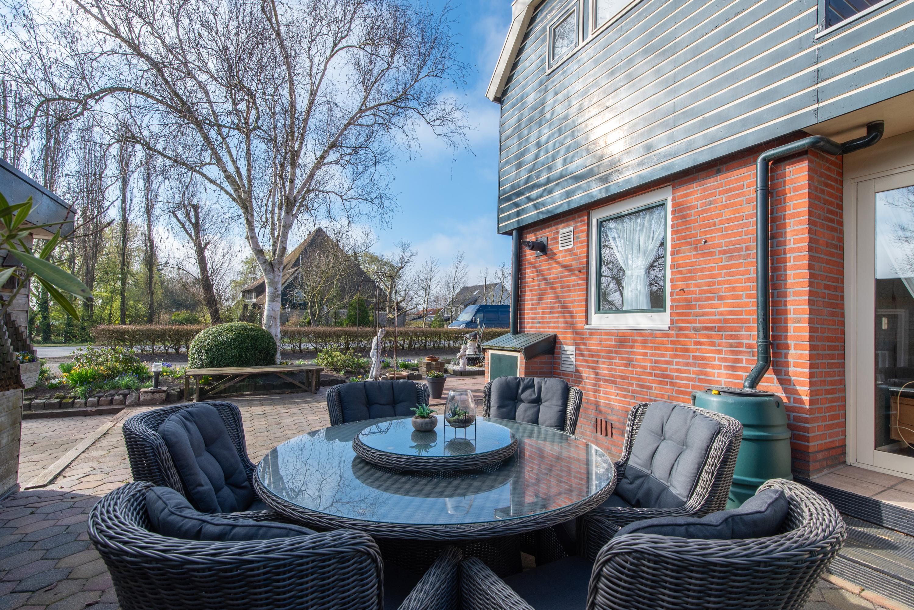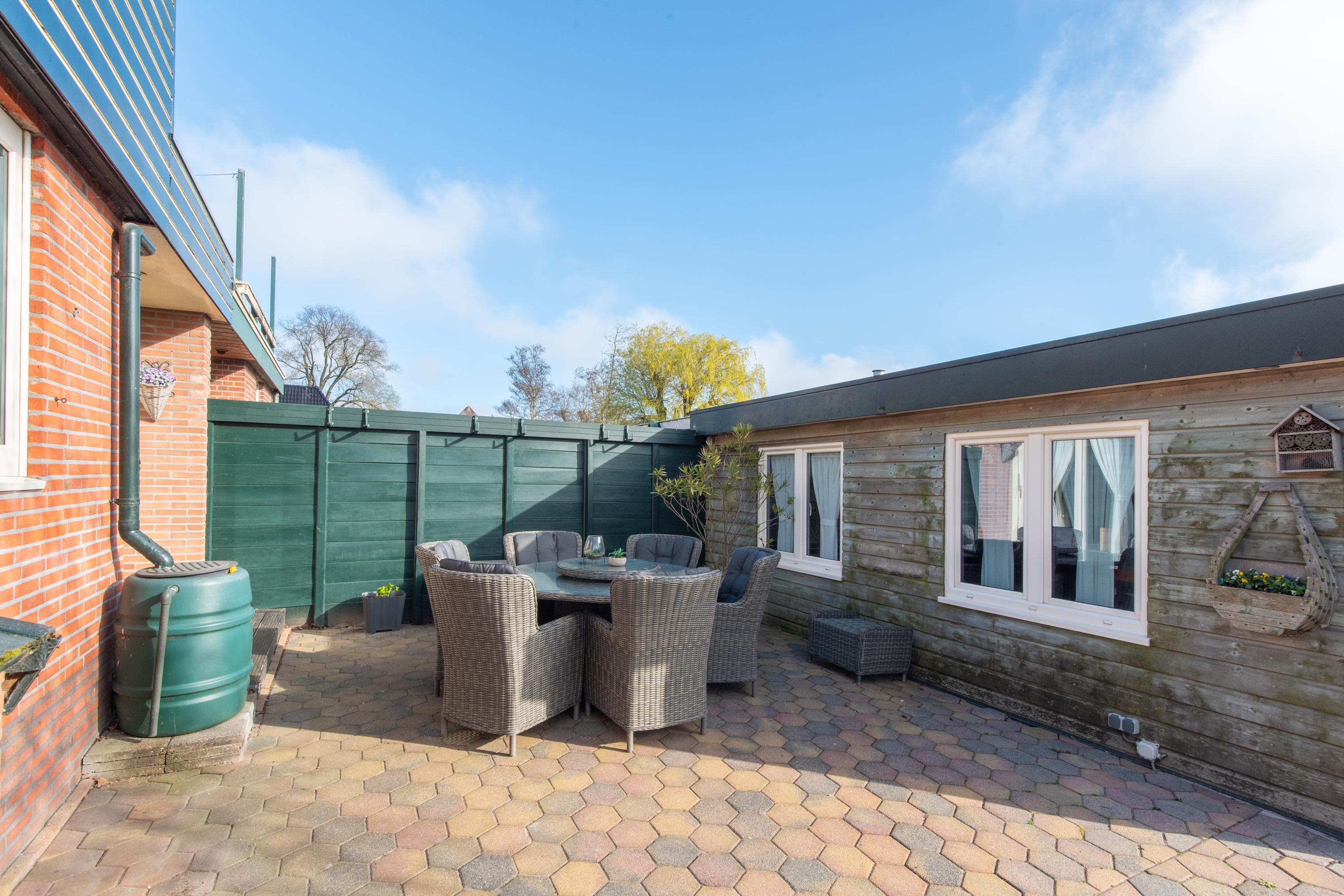 De tuin strekt zich uit achter en naast de woning en is piekfijn onderhouden. De zon heeft schijnt de hele dag vol in de tuin waardoor er altijd een lekker plekje te vinden is. Achter in de tuin staat de grote garage/schuur. Een heerlijke ruimte om te klussen en spullen op te slaan.